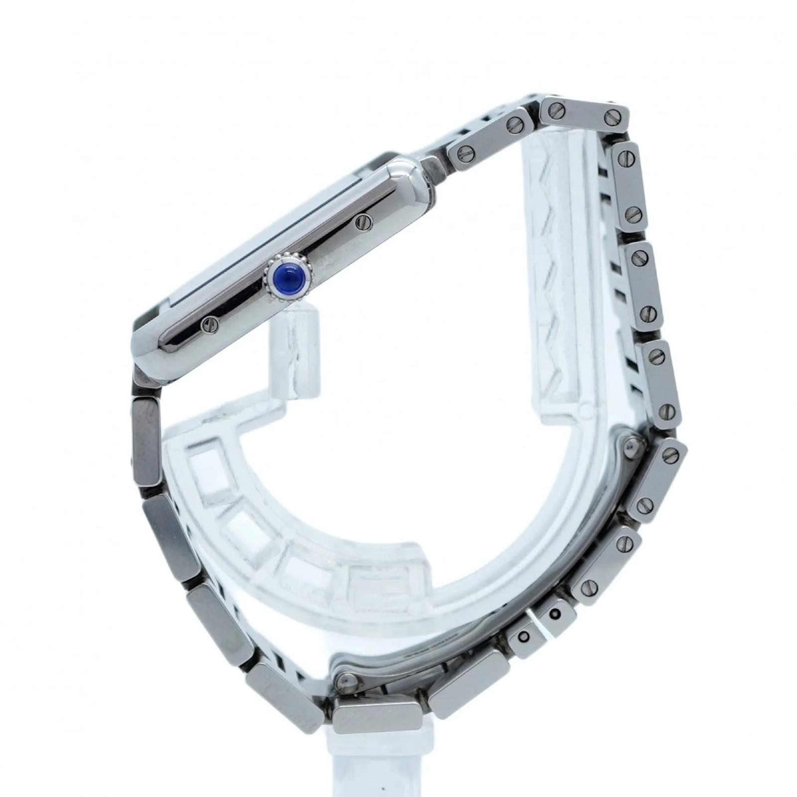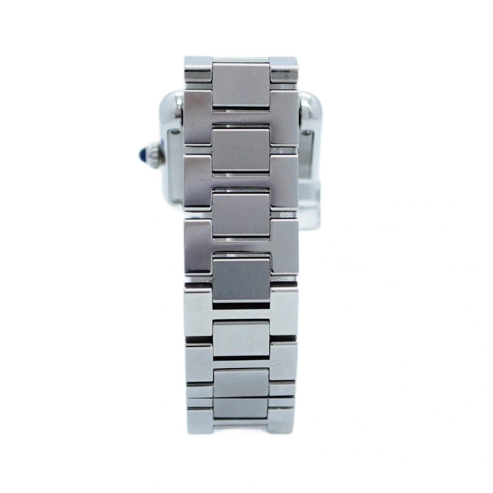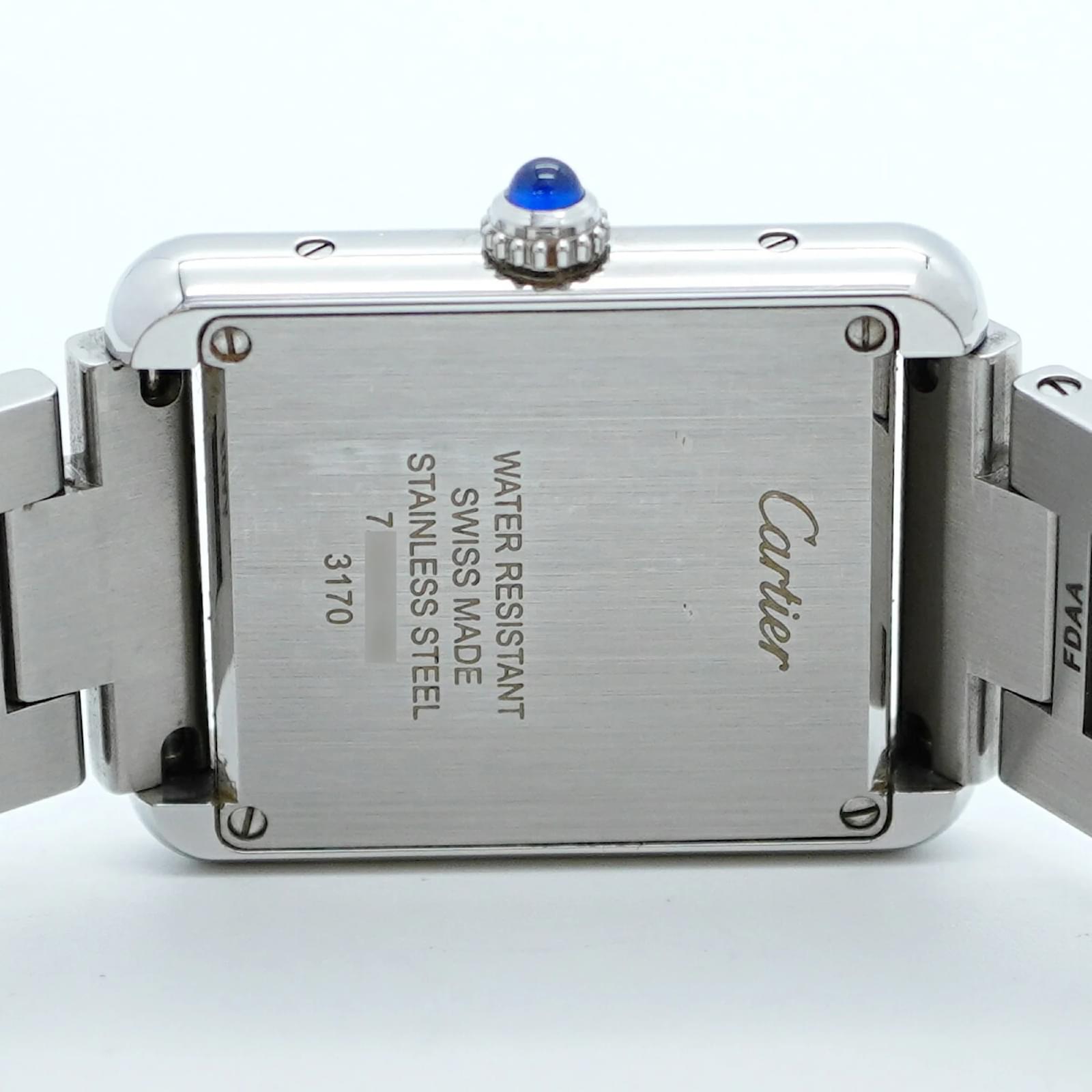 The Cartier Tank Solo Watch 3170 features a silver dial and is designed for women. It is crafted with a stainless steel band and operates on a quartz movement. The watch has a case diameter of 24.6mm and is suitable for a wrist size of 14cm (5.51 inches). \n\nThis pre-owned timepiece is in good condition, showing slight signs of wear including minor scratches on the bezel, case back, dial, glass, crown, and bracelet. The seller ranks it as \”Rank AB,\” indicating that while there are traces of usage, the watch remains in generally good condition. \n\nPlease refer to the images for a detailed view of the item’s condition and note that no accessories are included with the purchase.