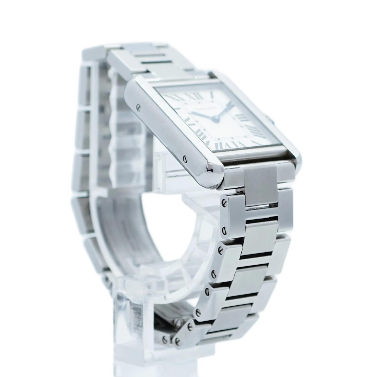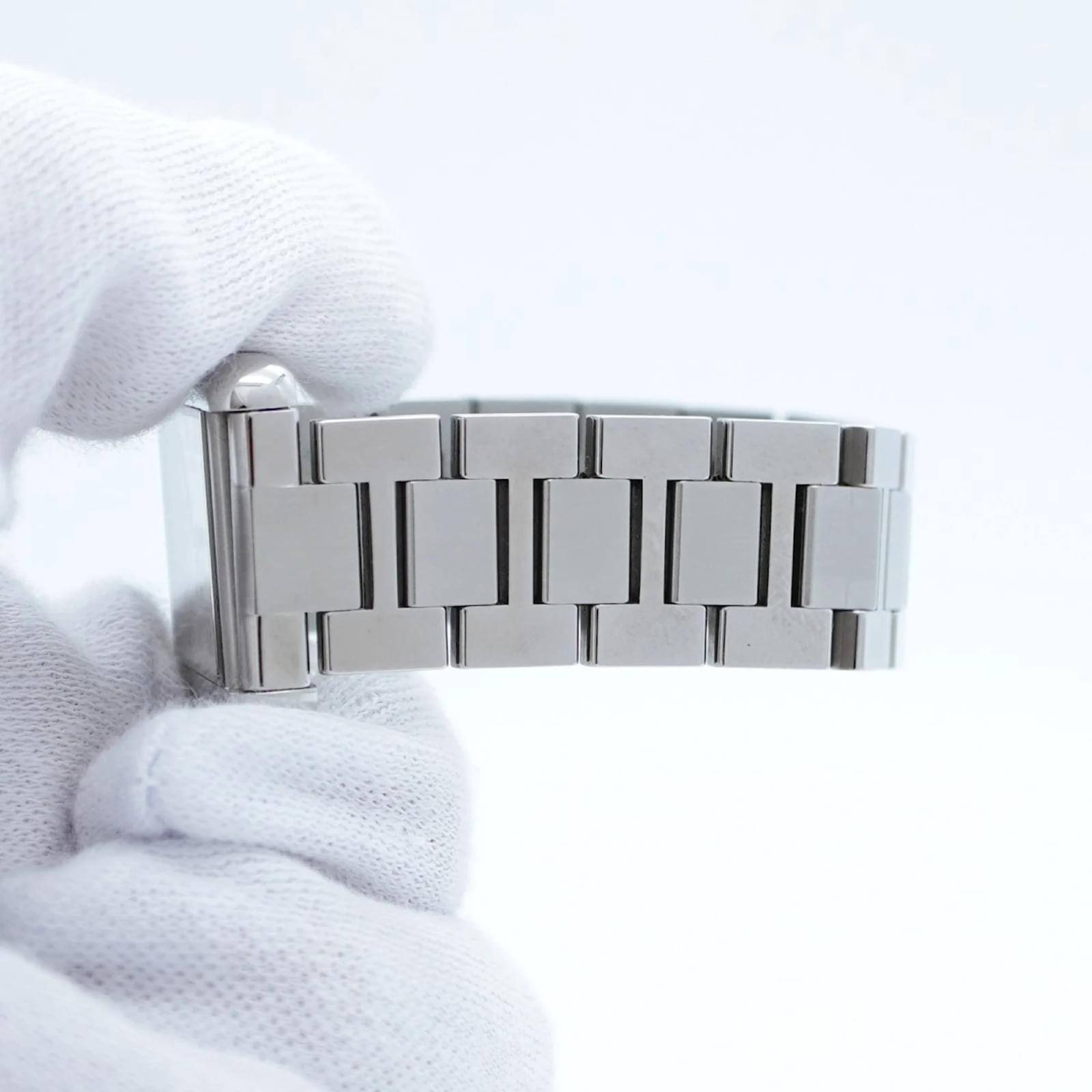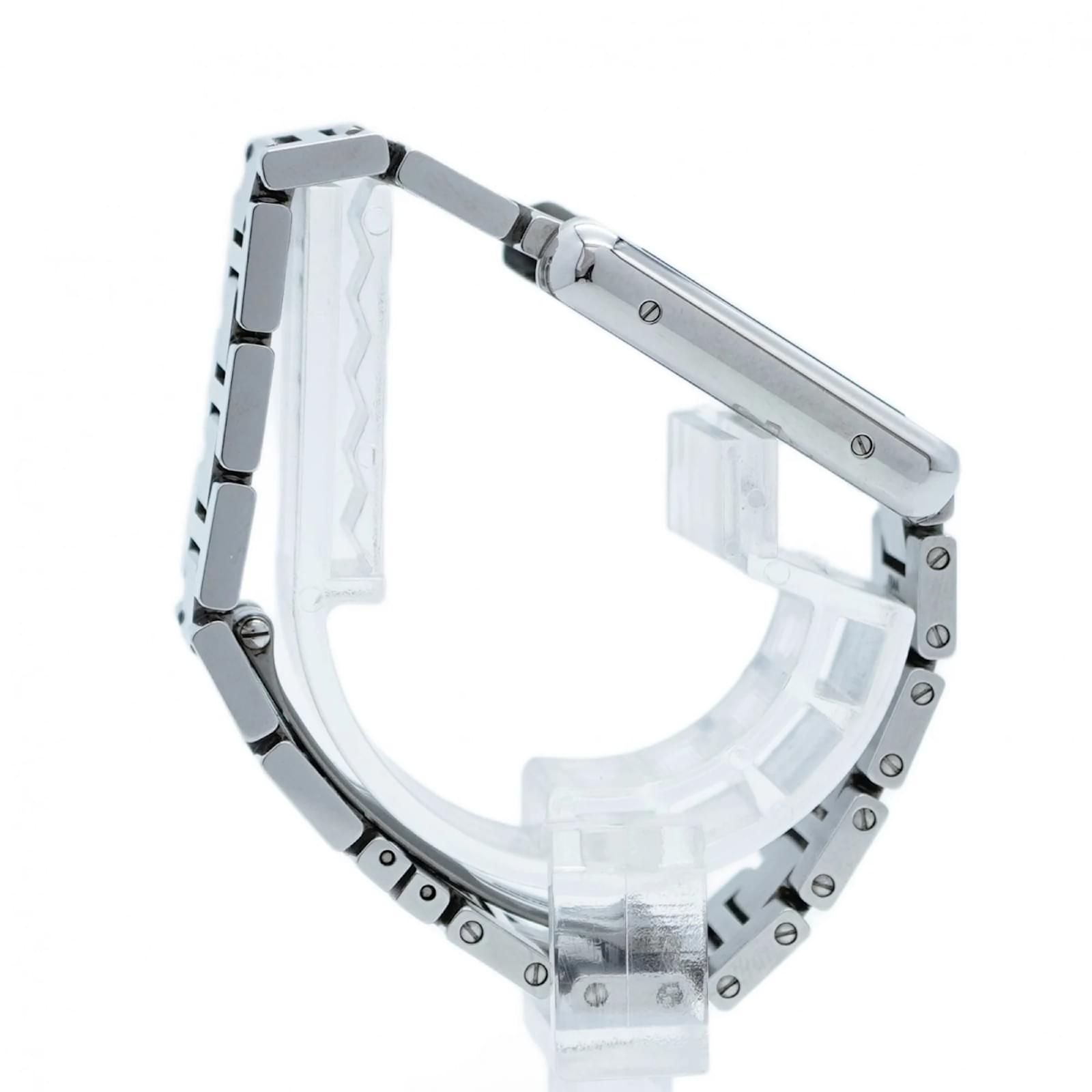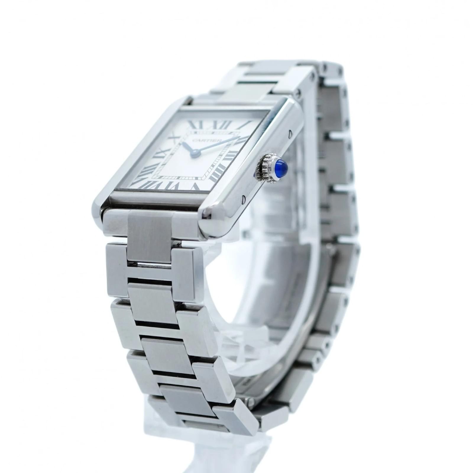 The Cartier Tank Solo Watch 3170 features a silver dial and is designed for women. It is crafted with a stainless steel band and operates on a quartz movement. The watch has a case diameter of 24.6mm and is suitable for a wrist size of 14cm (5.51 inches). \n\nThis pre-owned timepiece is in good condition, showing slight signs of wear including minor scratches on the bezel, case back, dial, glass, crown, and bracelet. The seller ranks it as \”Rank AB,\” indicating that while there are traces of usage, the watch remains in generally good condition. \n\nPlease refer to the images for a detailed view of the item’s condition and note that no accessories are included with the purchase.