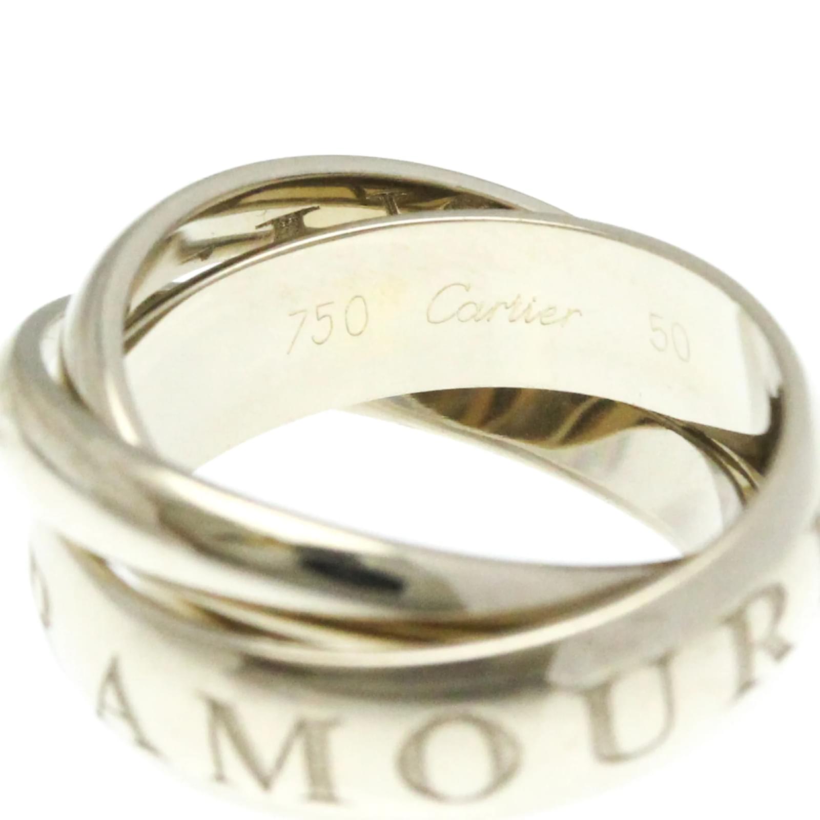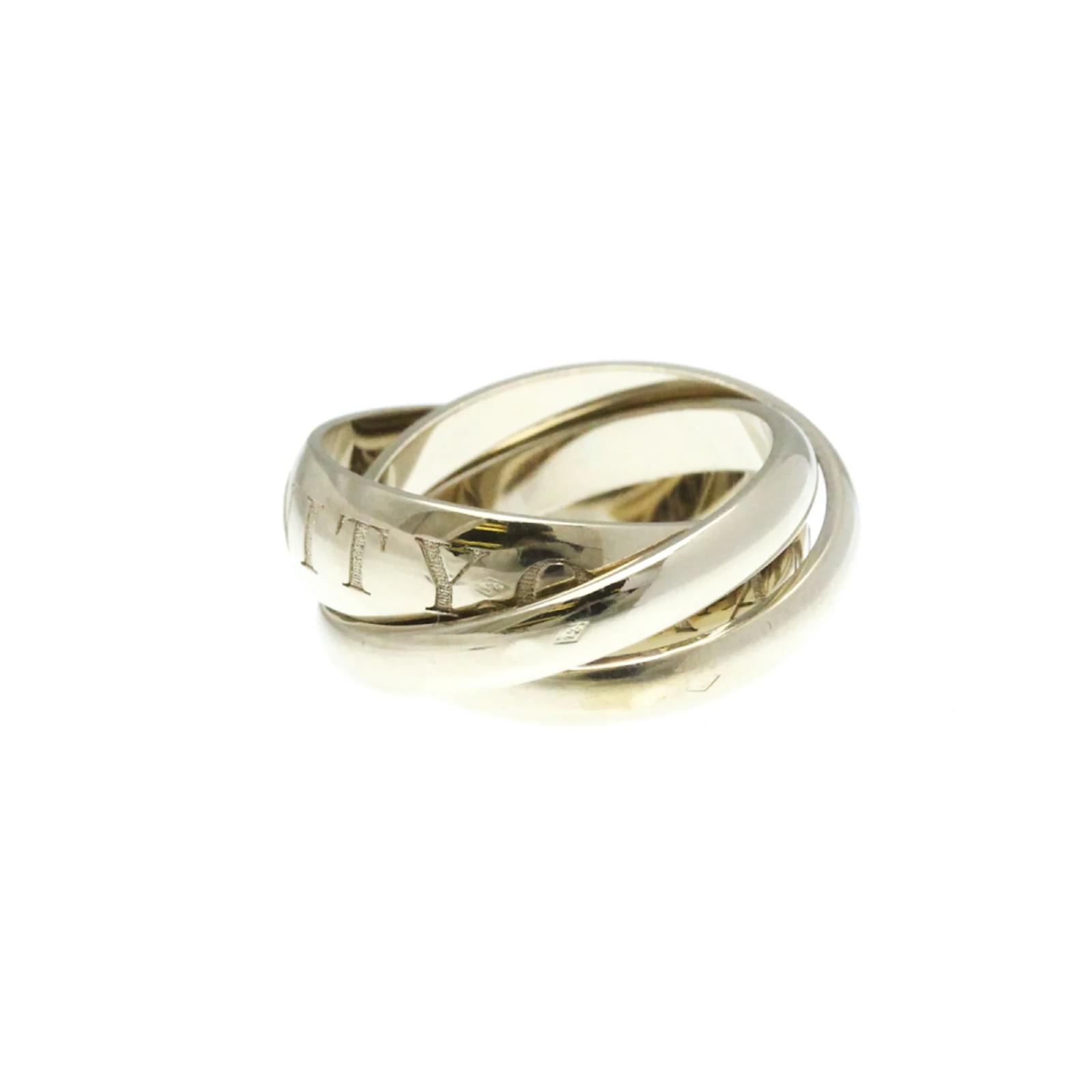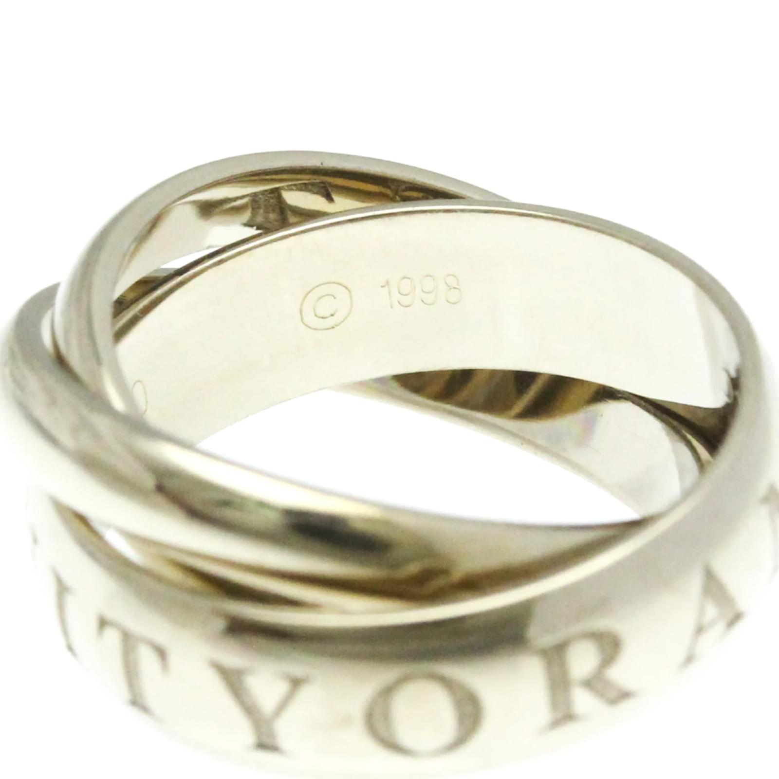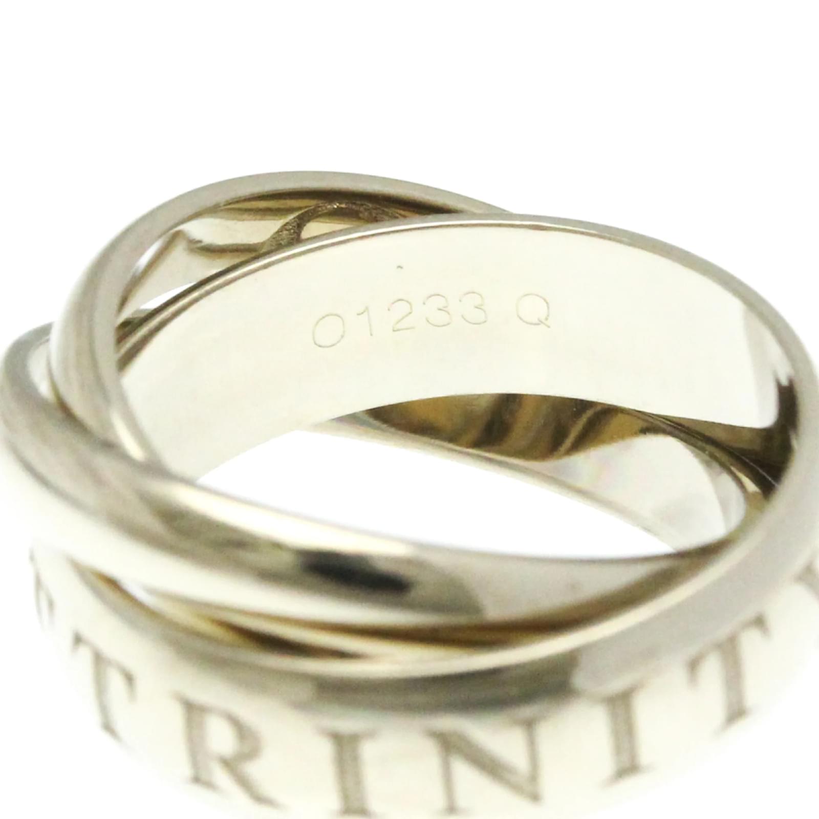 The Cartier Trinity Ring, a limited edition piece for Christmas, is crafted from 18K white gold, presenting a sleek silver band design. This fashion ring features a width of 5.4mm and weighs 11g, making it a substantial yet elegant accessory. It is available in a US size of 5 1/4, equivalent to a brand size of 50 and a Japanese size of 10. \n\nThis pre-owned ring is in very good condition, showing only insignificant scratches and traces of usage, and has been polished for maintenance. It comes with a certificate of authenticity and has a serial number of O1233Q. The total shipping weight is 20g.