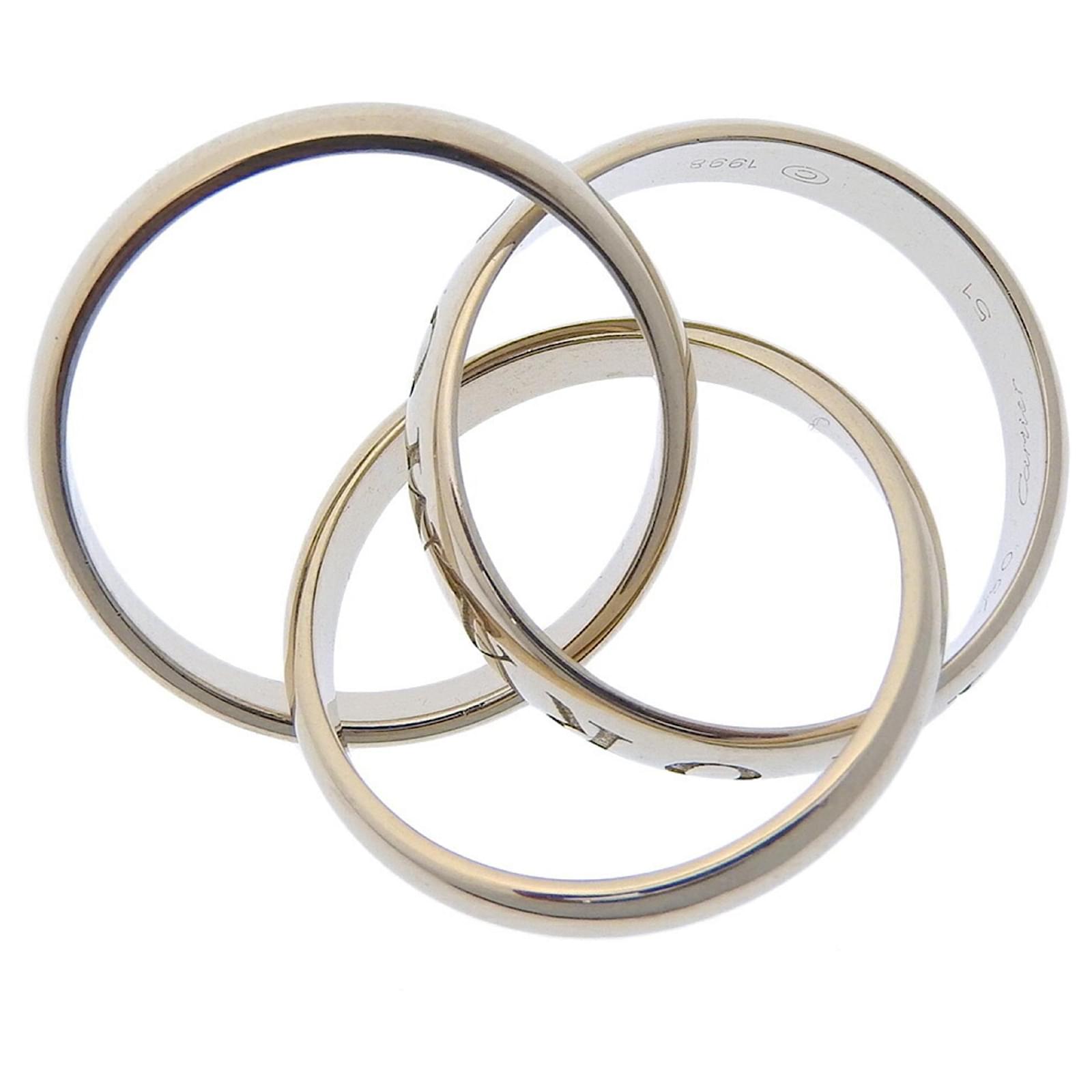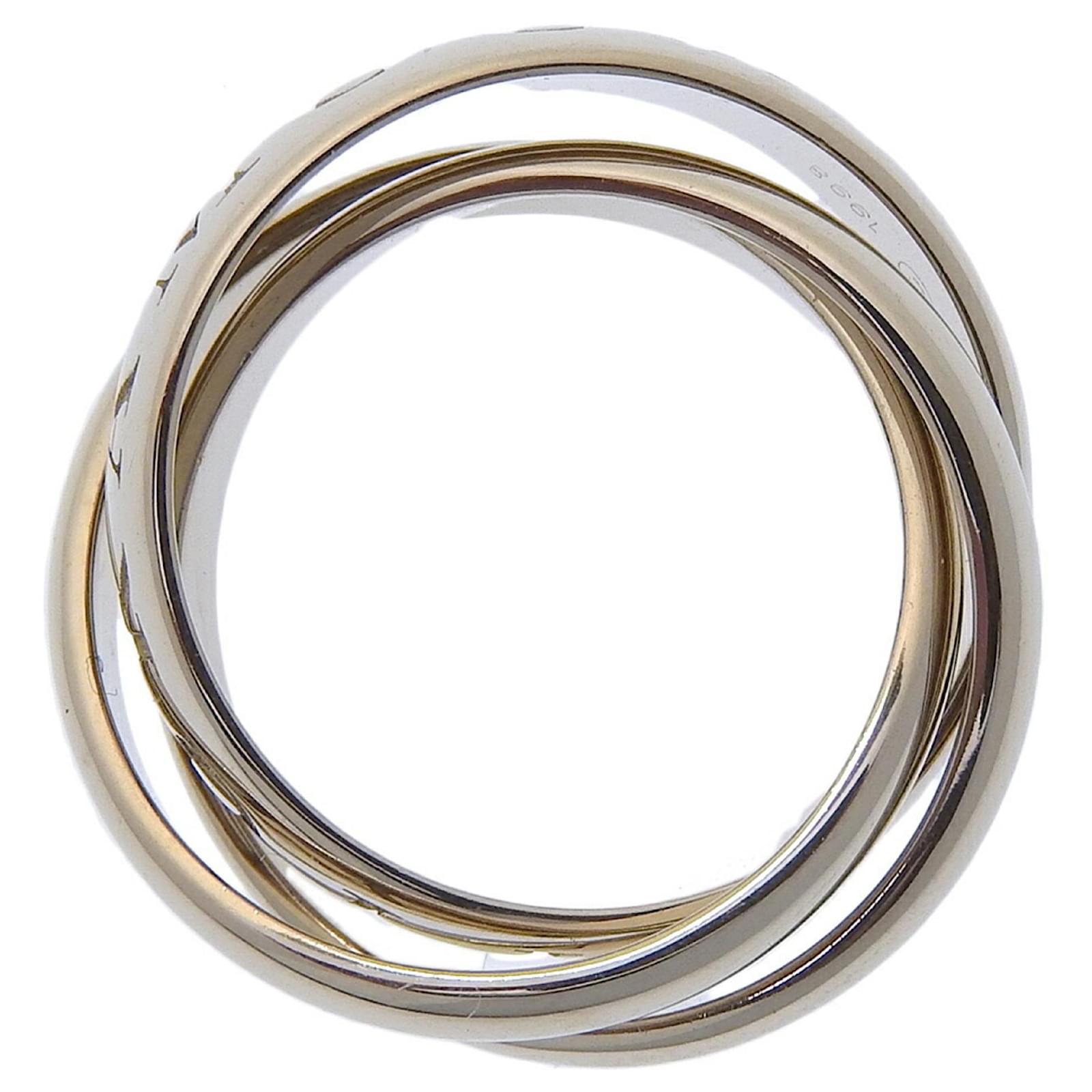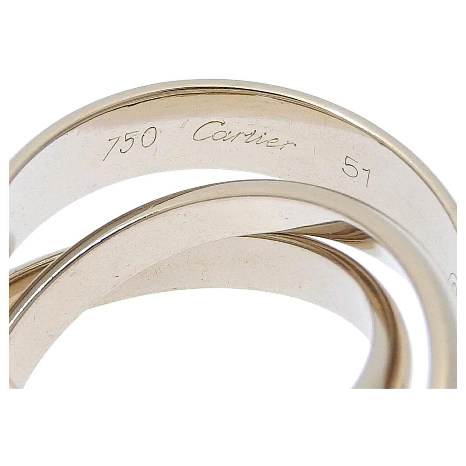 This Cartier Trinity Ring, a limited edition from 1998, is crafted from 18K white gold and weighs approximately 10.6 grams. It is designed as a band ring and is available in a brand size of 51, which corresponds to a US size 6. The ring is classified as used but is in like-new condition, with insignificant traces of use, scratches, and dirt. It has been polished for maintenance. Please refer to the images for a detailed view of the item’s condition and note that no accessories are included with the purchase.