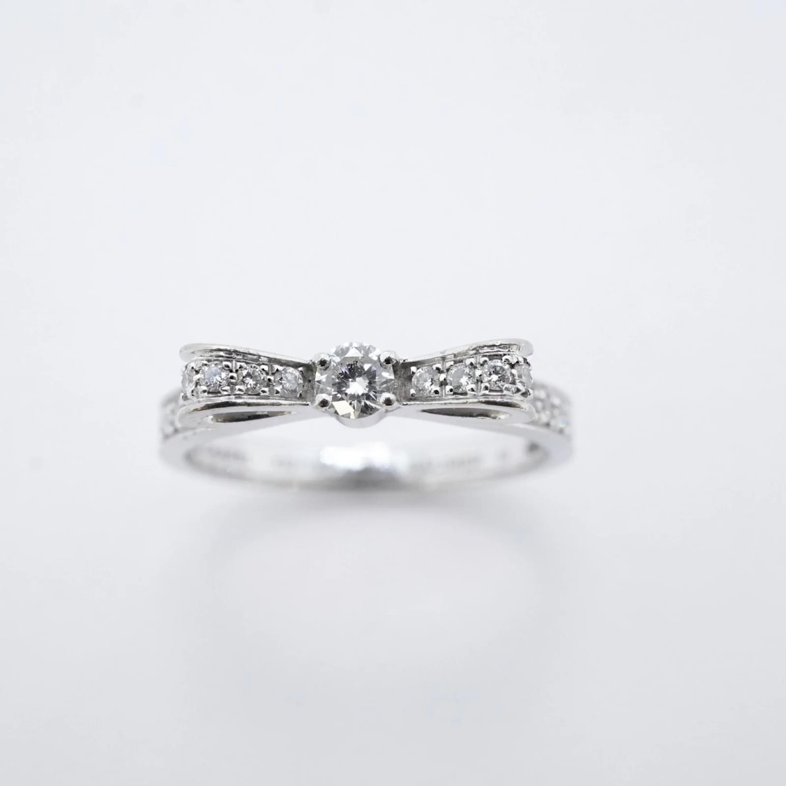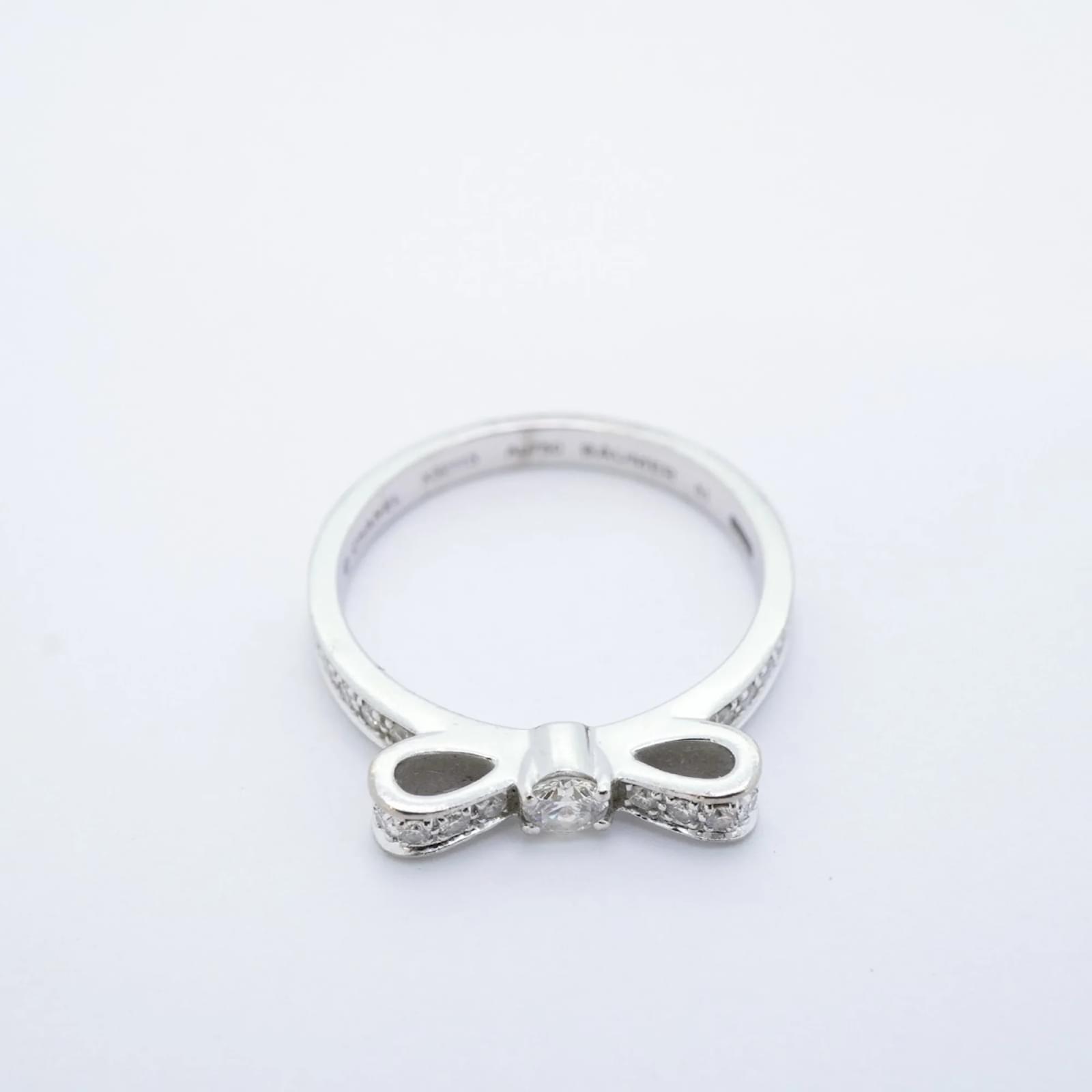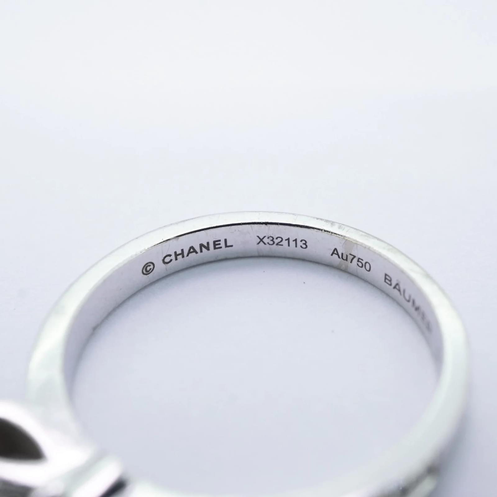 This Chanel ring, known as the Ruban, is crafted from 18K white gold and features a diamond. It is designed as a band ring and is available in a brand size of 51, which corresponds to a US size 6. The ring is pre-owned and classified as being in good condition, with slight traces of use, including minor scratches and dirt. Potential buyers are encouraged to review the images for a detailed view of the item’s condition. No additional accessories are included with the purchase.