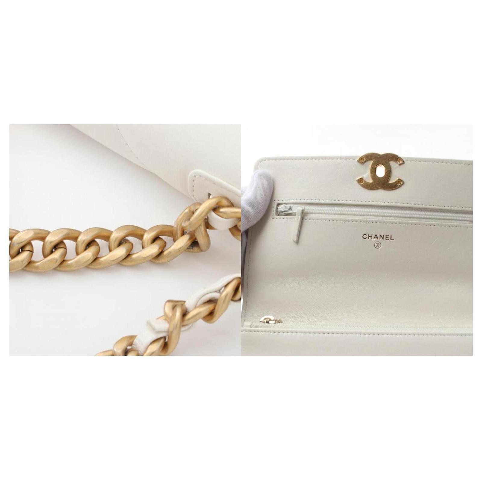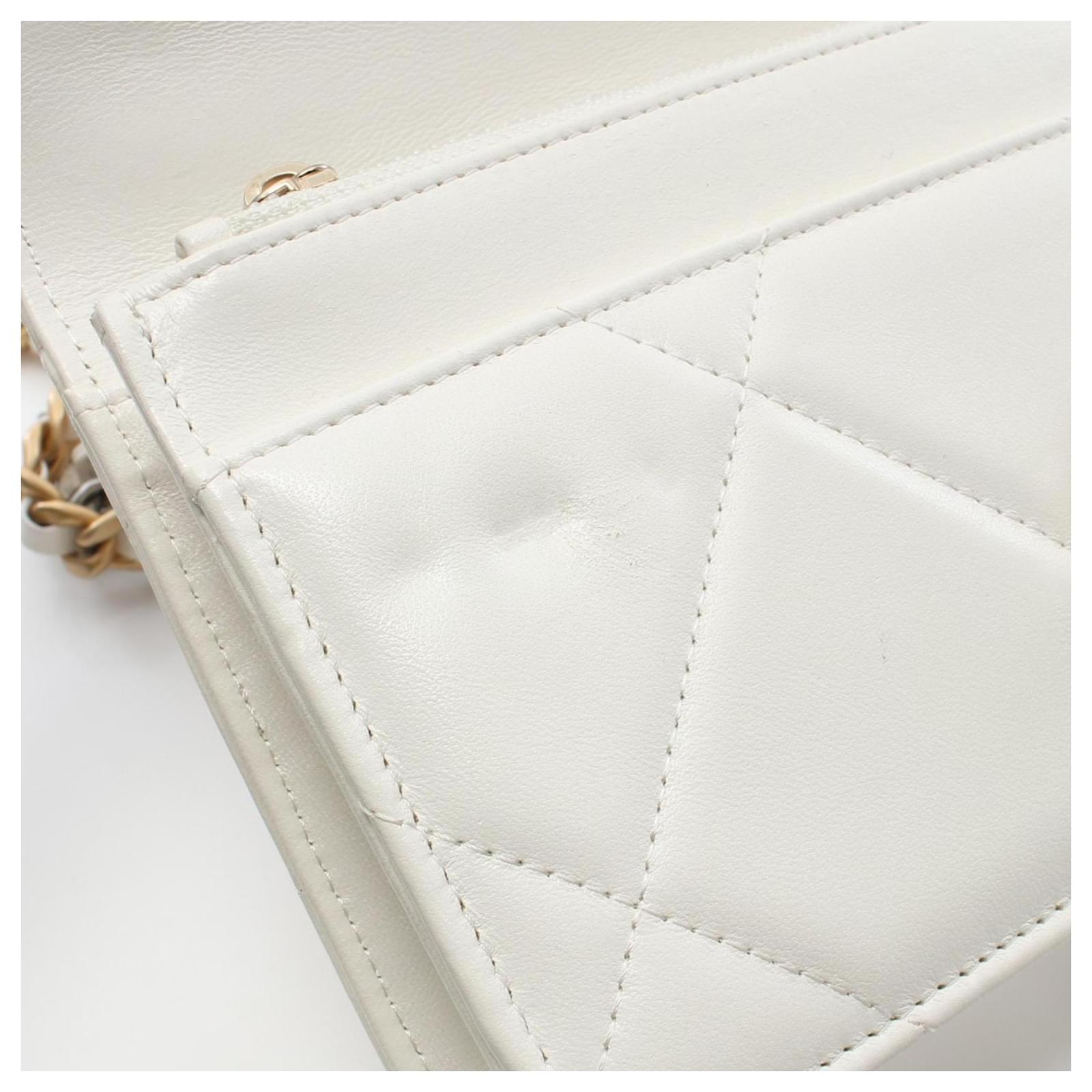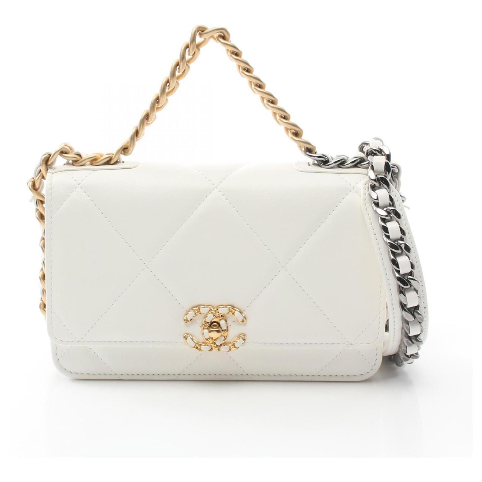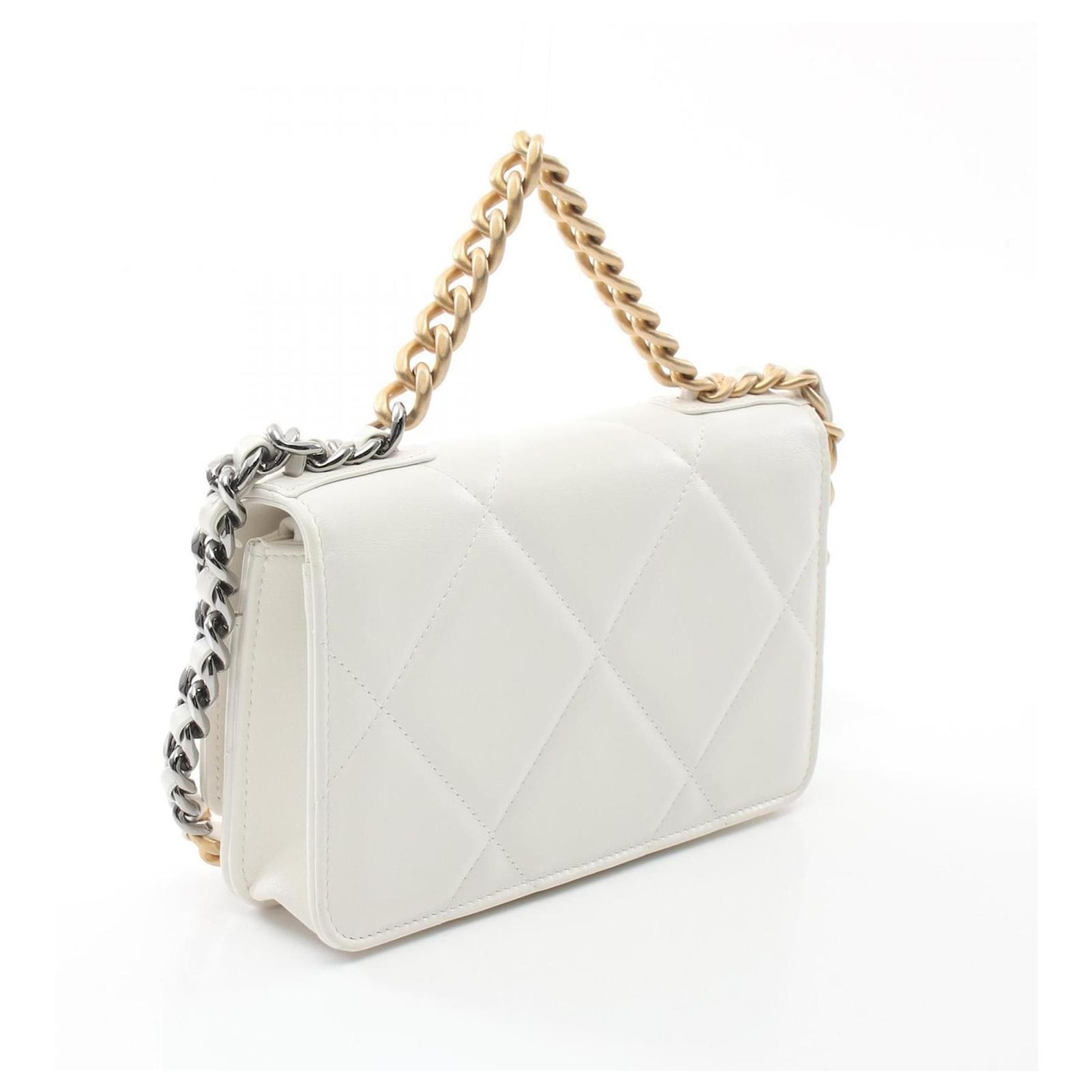 The Chanel 19 Matelasse Shoulder Bag is crafted from lambskin and features a classic white color. This shoulder bag measures 12cm in height, 19cm in width, and 4cm in depth, with a handle length of 20cm and a strap length of 125cm, making it a versatile accessory for various occasions. \n\nThis item is pre-owned and classified as being in good condition, with some visible traces of usage, including scratches and dirt. It is important to review the provided images for a clear understanding of the bag’s condition before making a purchase. \n\nIncluded accessories may vary, and potential buyers are encouraged to check the images for details on what is included.