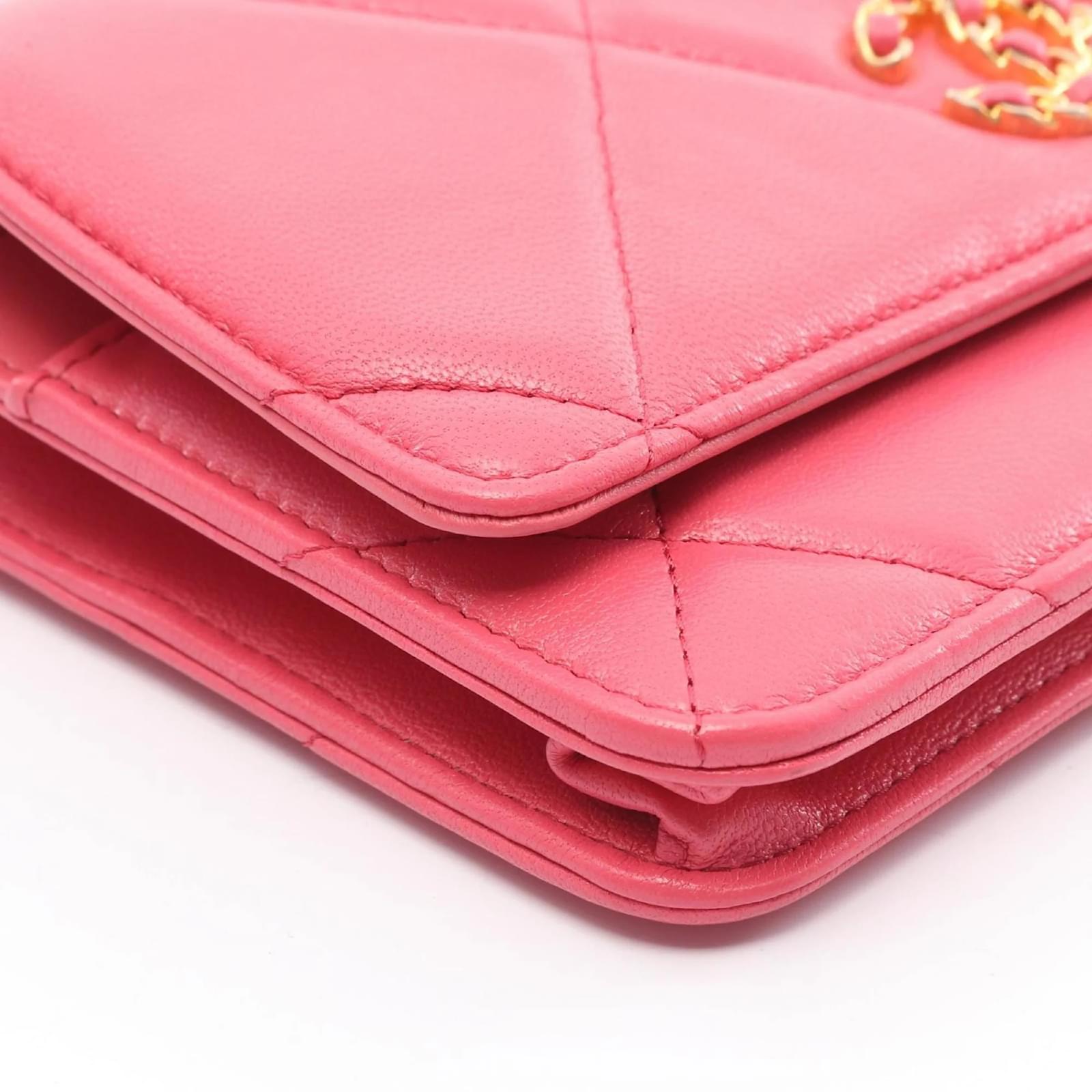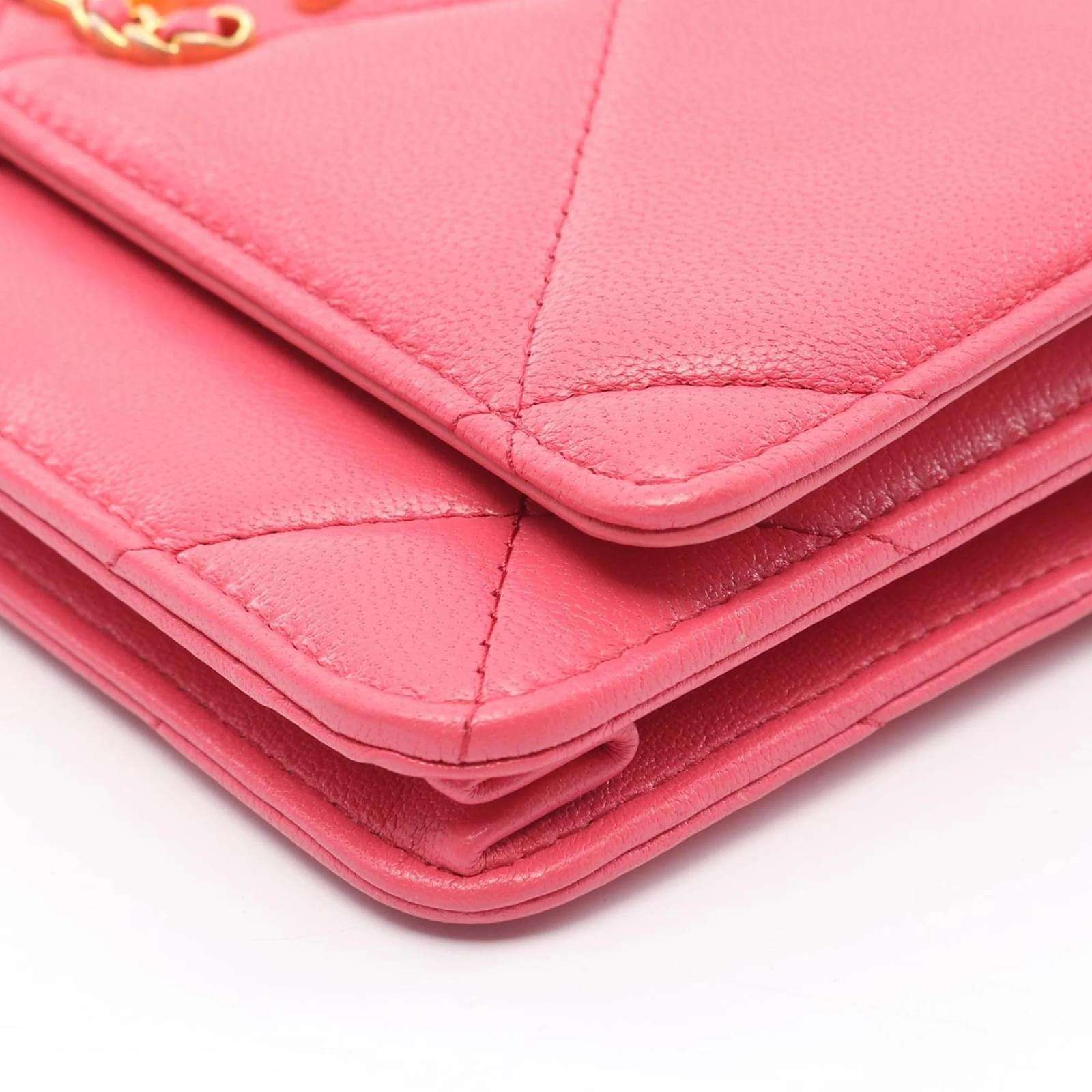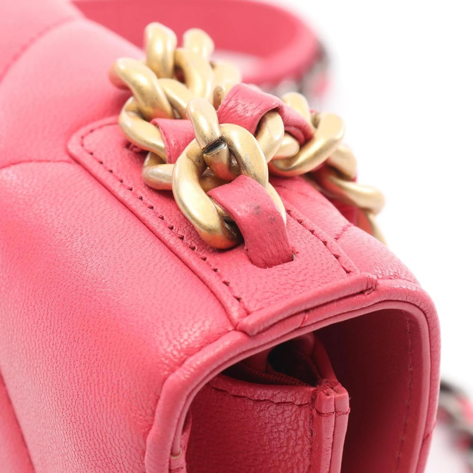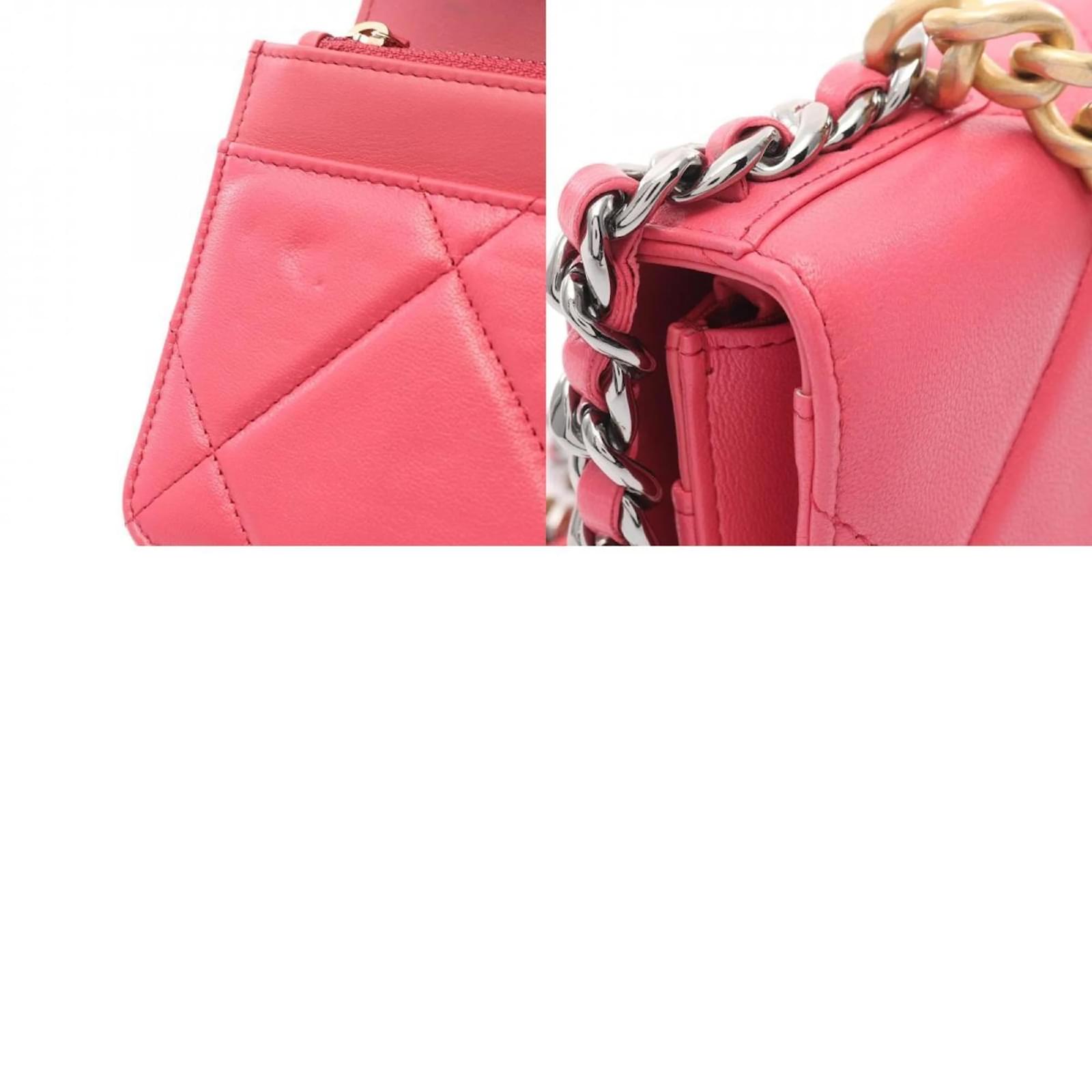 The Chanel 19 Shoulder Bag is crafted from leather in a soft pink hue, measuring 12cm in height, 19cm in width, and 3cm in depth. This stylish bag is designed for women and features a classic shoulder strap for easy carrying. \n\nThis particular item is pre-owned and classified as being in good condition, with slight traces of use, including minor scratches and dirt. It is important to review the provided images to assess the exact condition before purchasing. The bag is part of the Chanel brand, known for its timeless elegance and quality craftsmanship. \n\nAccessories included with the bag are also subject to review through the images provided.