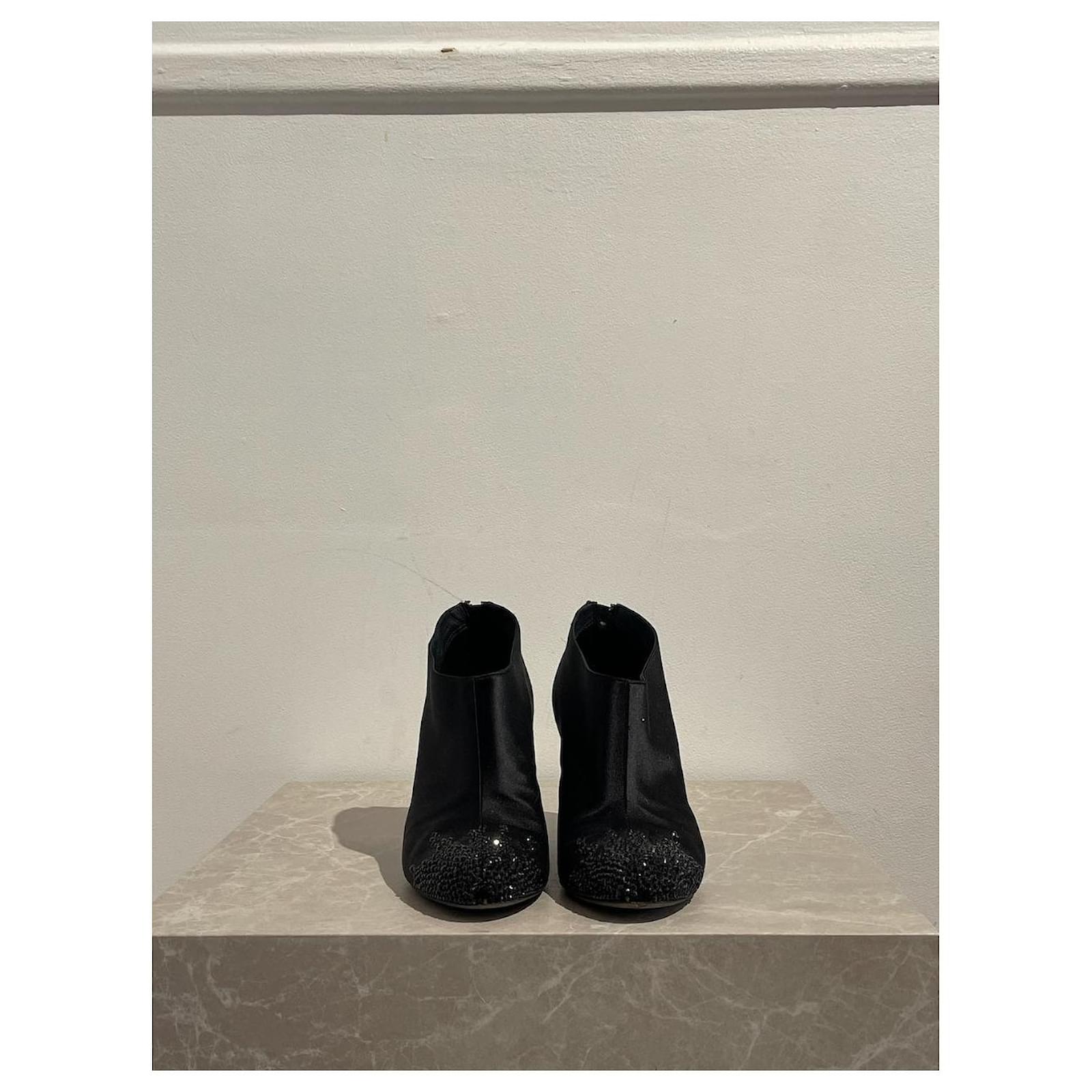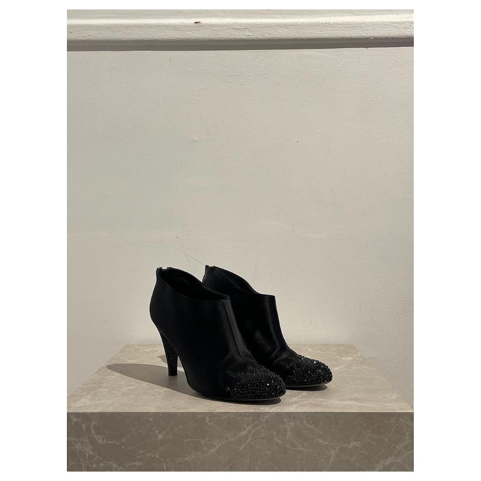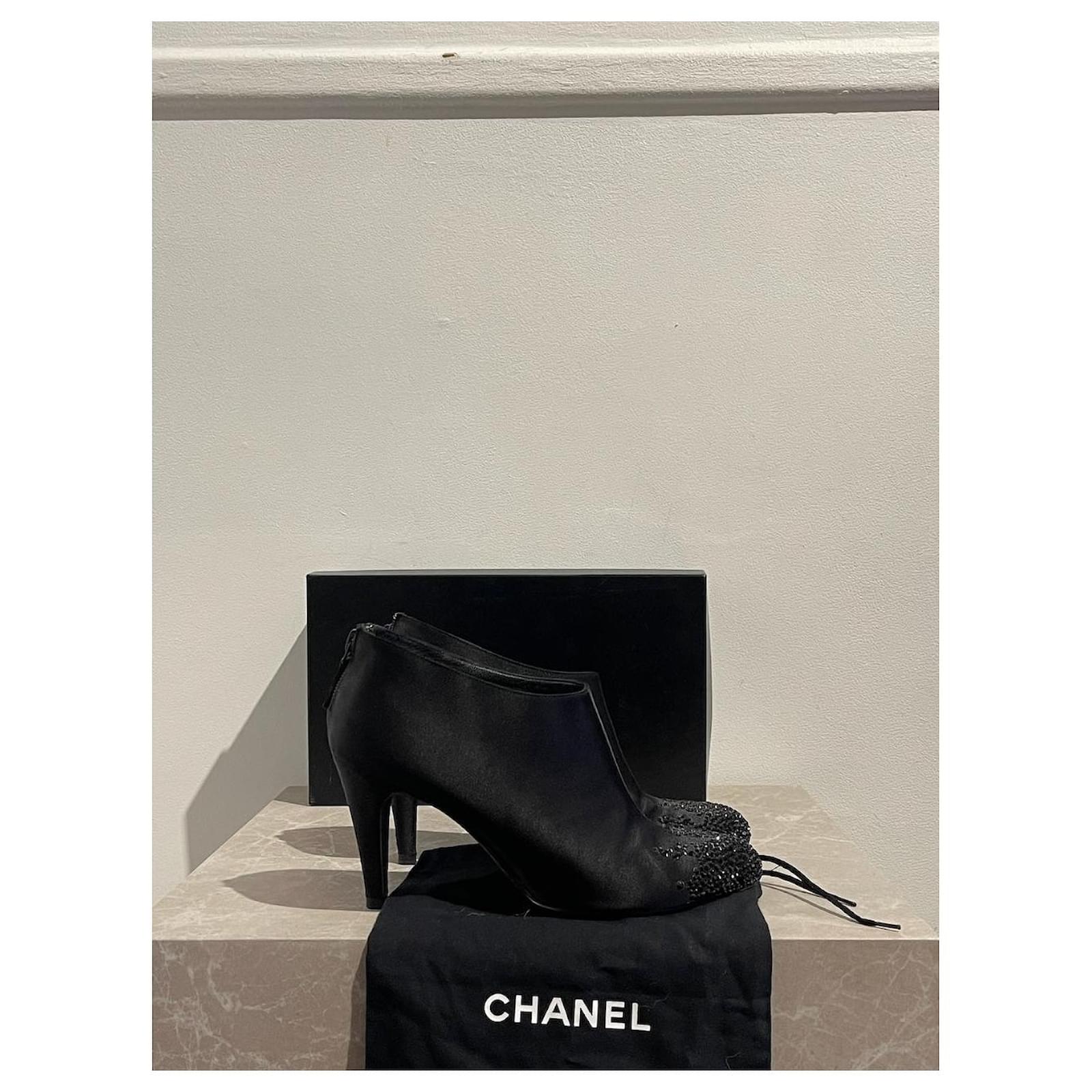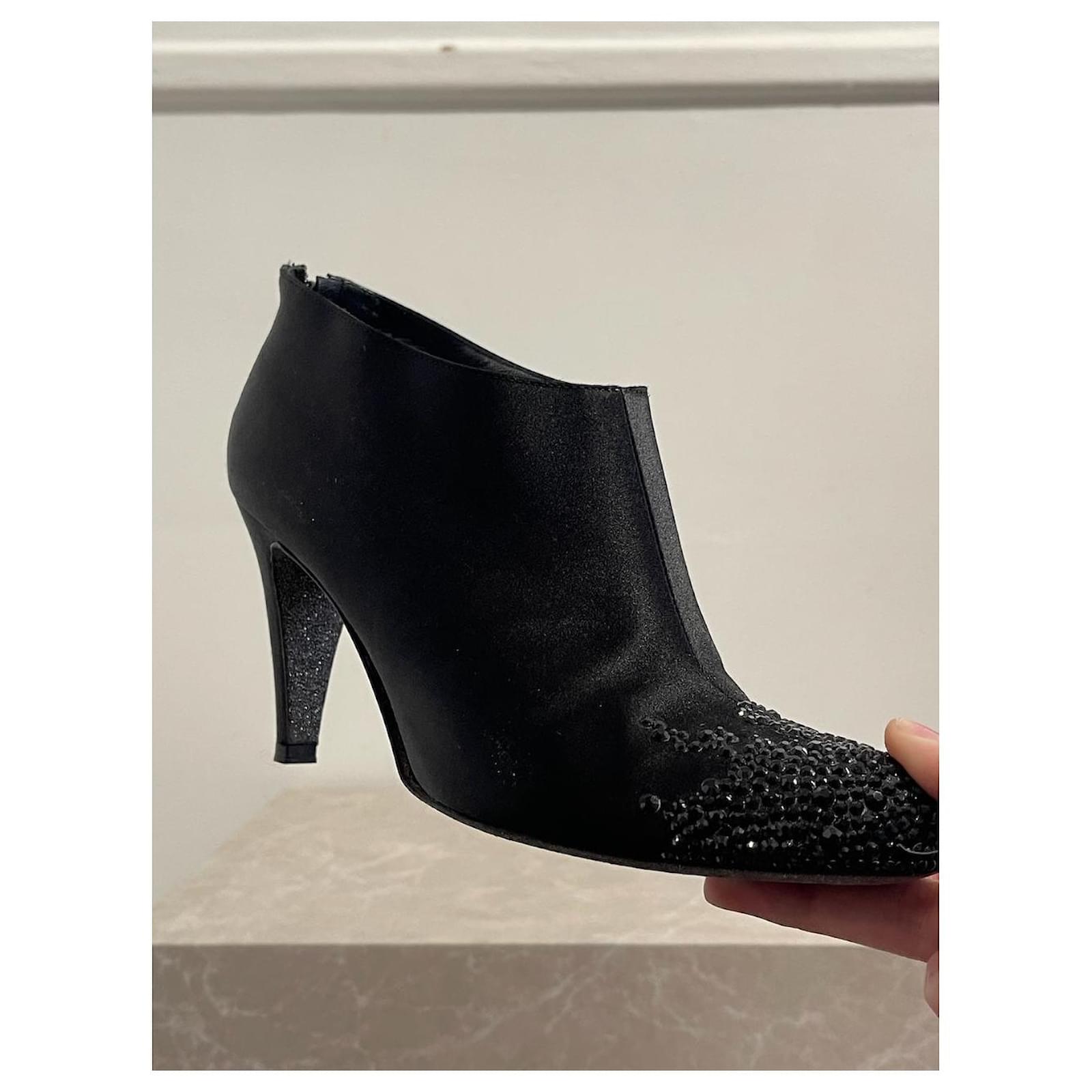 Chanel ankle boots \nSize 38. \nBlack satin boots decorated with rhinestones on the toe and zipped closure at the back. \nHeel height 8 5 cm.\nVery good condition, note small tears on the heels (see photos). With box and dustbag.