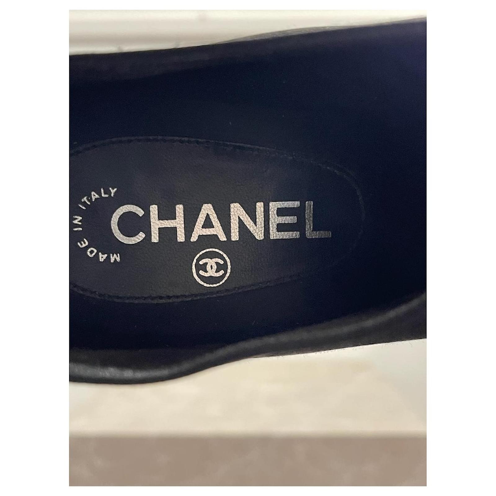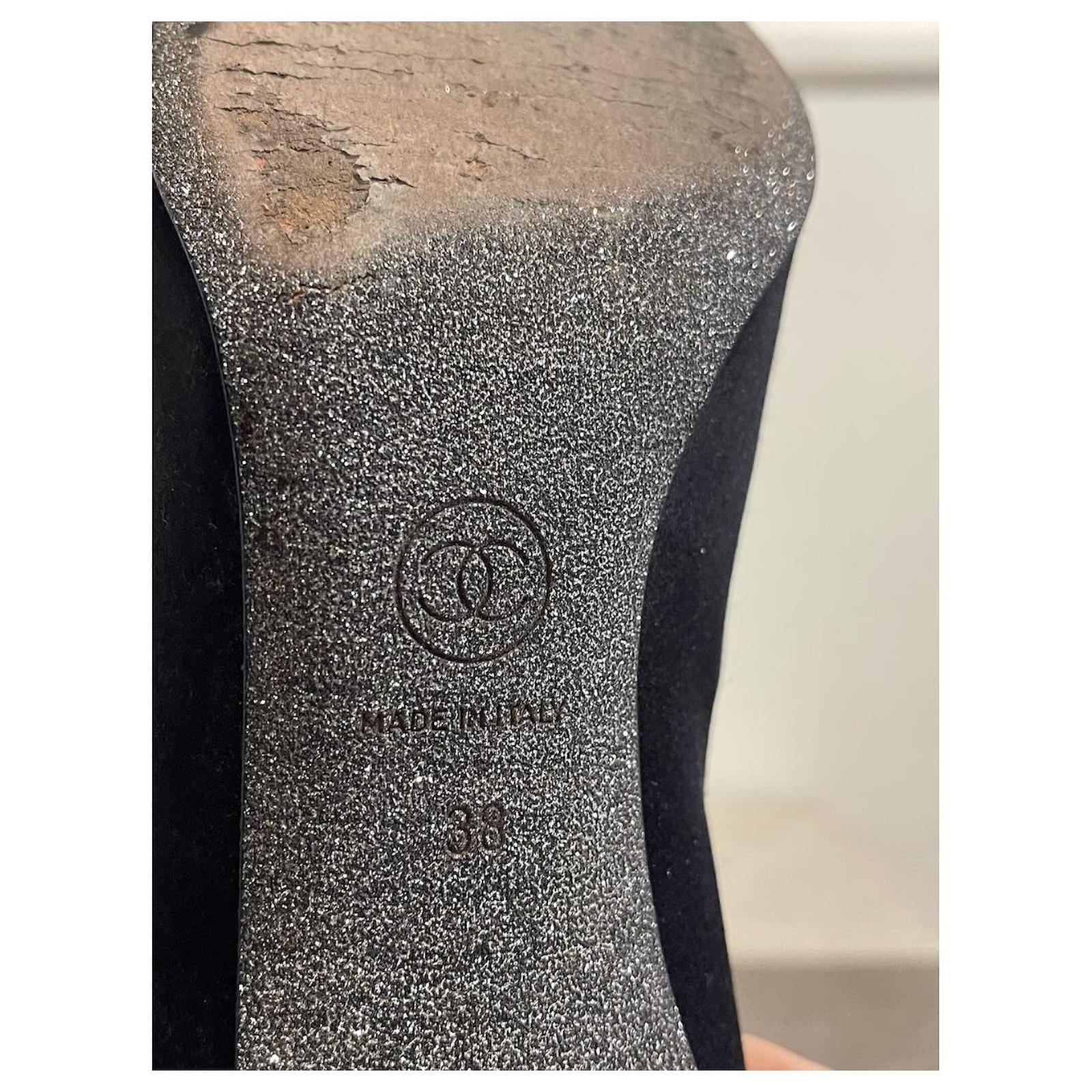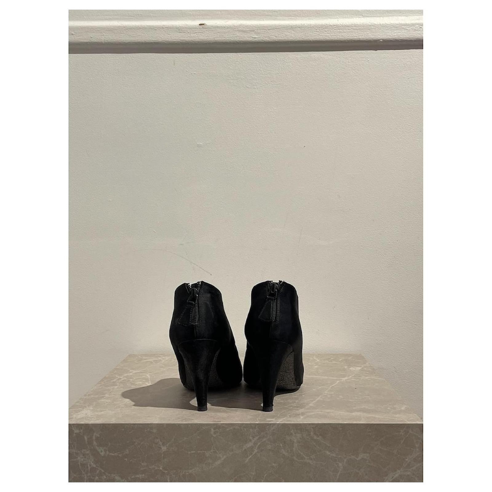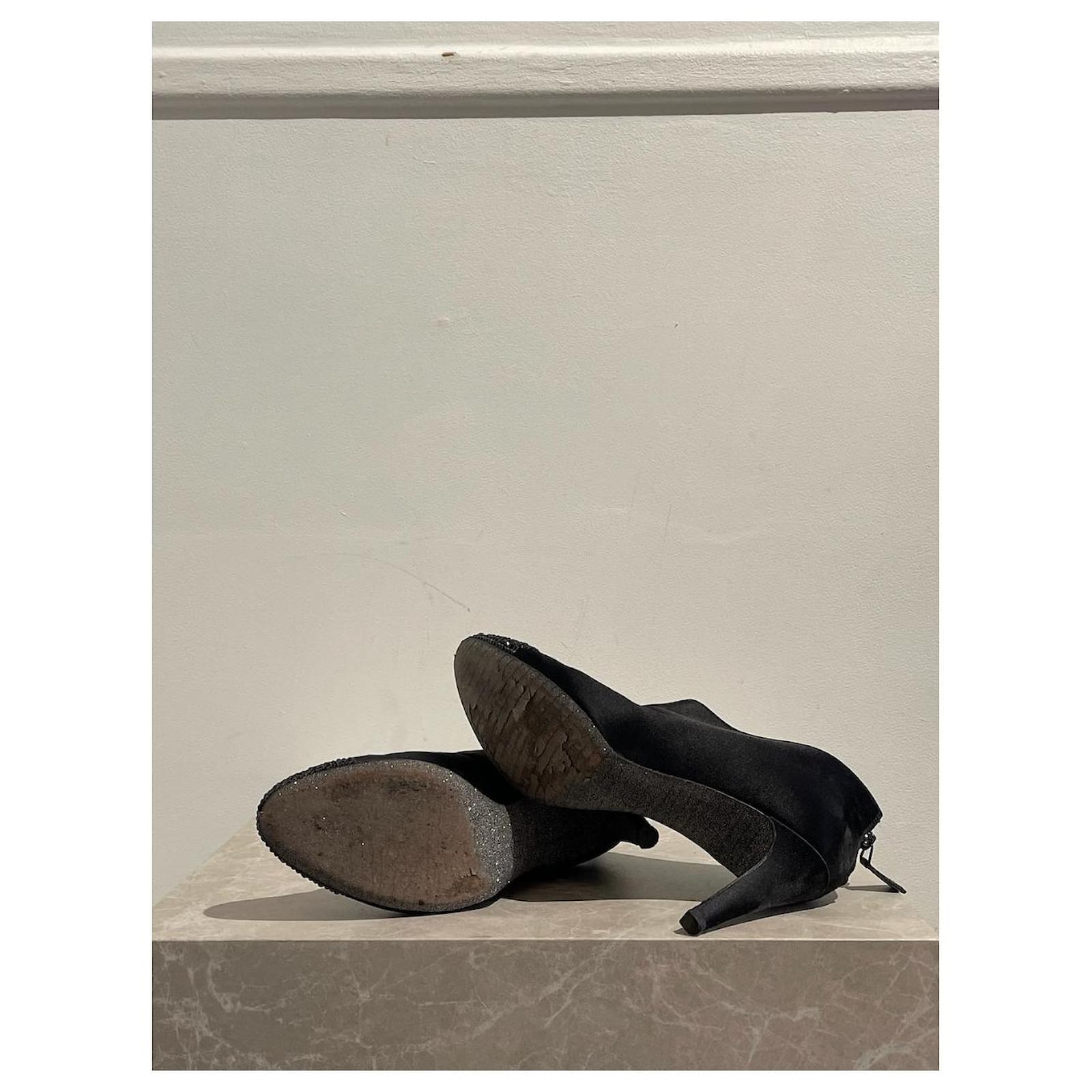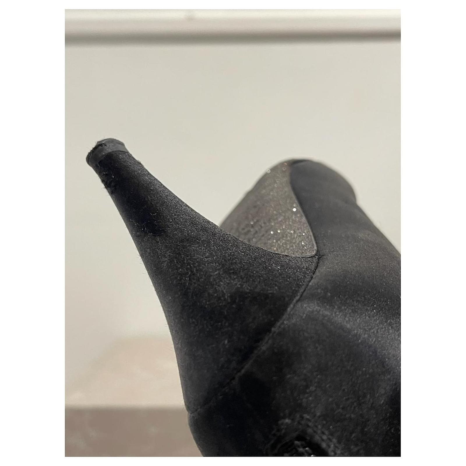 Chanel ankle boots \nSize 38. \nBlack satin boots decorated with rhinestones on the toe and zipped closure at the back. \nHeel height 8 5 cm.\nVery good condition, note small tears on the heels (see photos). With box and dustbag.