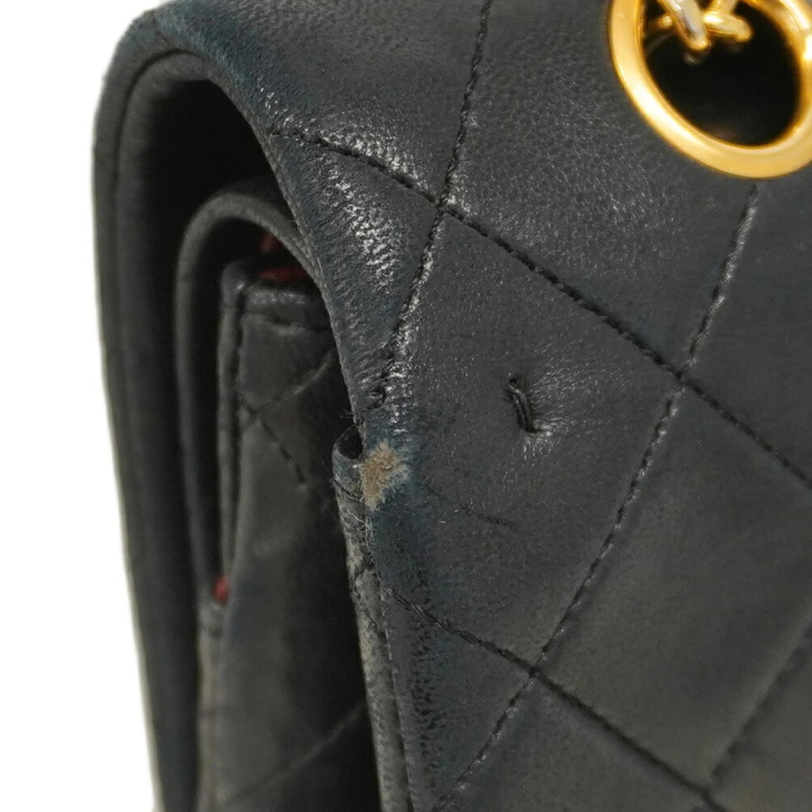 This Chanel shoulder bag features a classic design in black lambskin leather, complemented by gold hardware. Measuring 16cm in height, 25cm in width, and 7cm in depth, it is both stylish and practical for everyday use. The bag is categorized as used but is in good condition, showing slight traces of use, including minor scratches and dirt. It comes with a guarantee card, and potential buyers are encouraged to review the images for a detailed view of its condition.