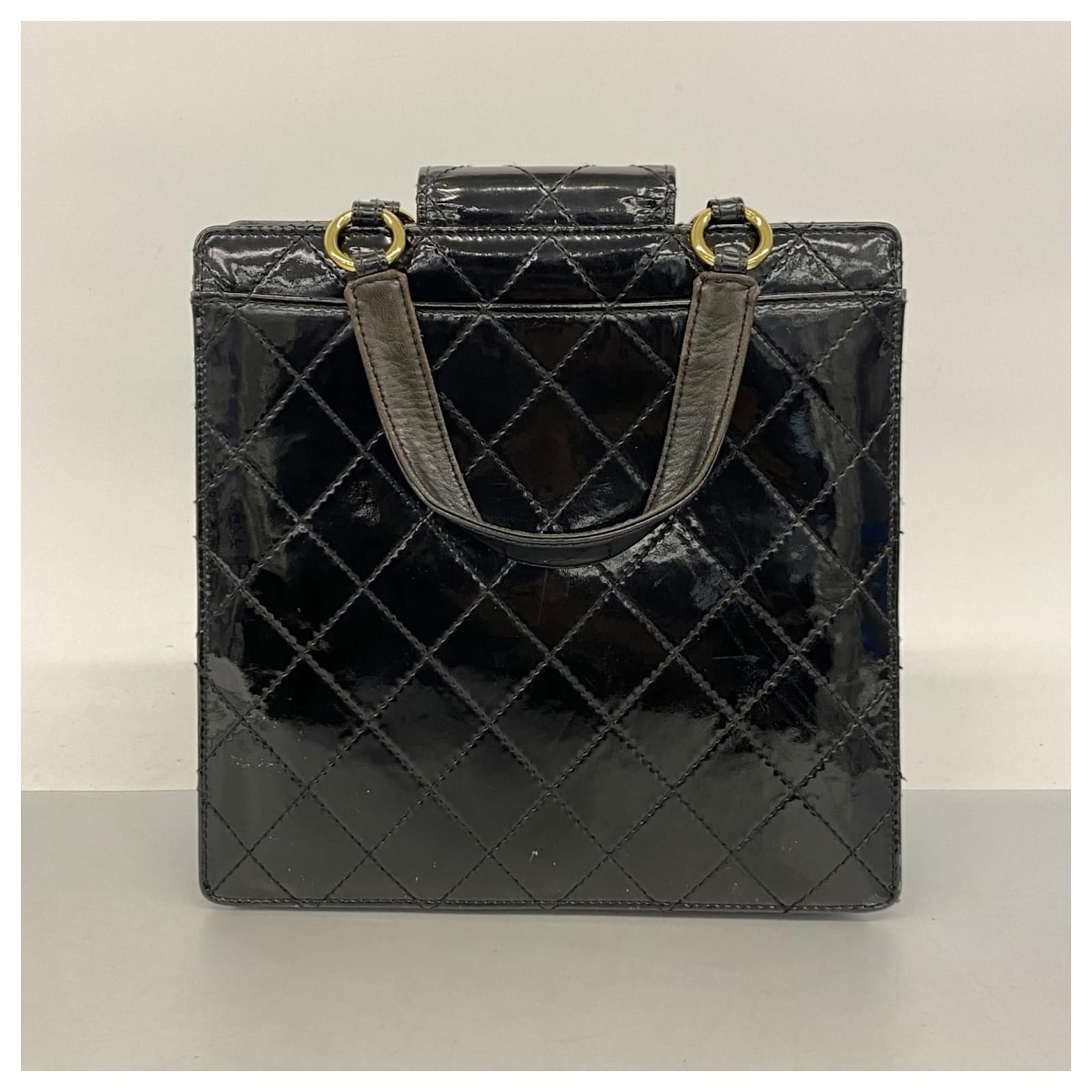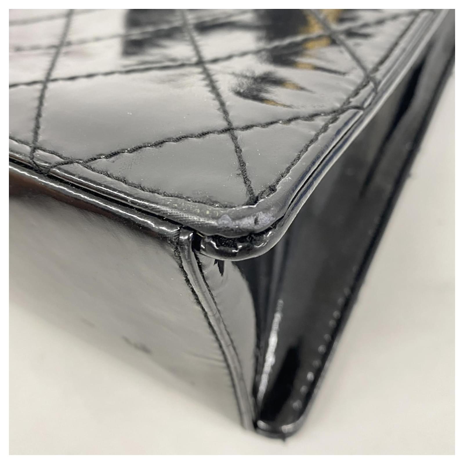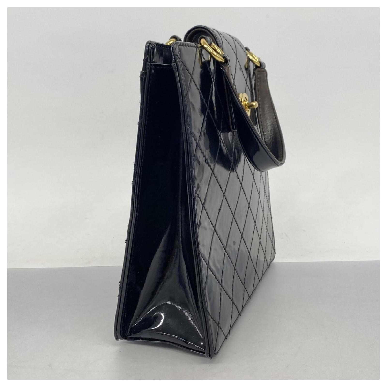 This Chanel handbag features a classic matelassé design crafted from black patent leather, complemented by gold hardware. With dimensions of 24cm x 25cm x 8.5cm, it is suitable for everyday use. The handbag is categorized as used but remains in good condition, showing slight traces of use, including minor scratches and dirt. It comes with a guarantee card, and potential buyers are encouraged to review the images for a detailed view of its condition and included accessories.