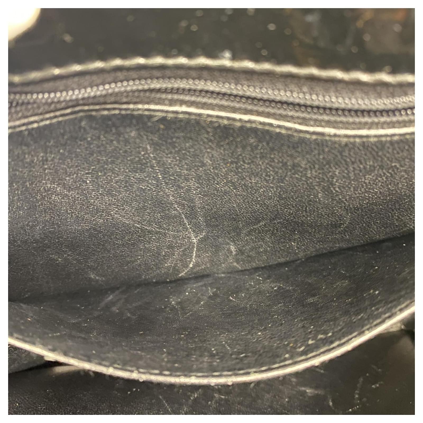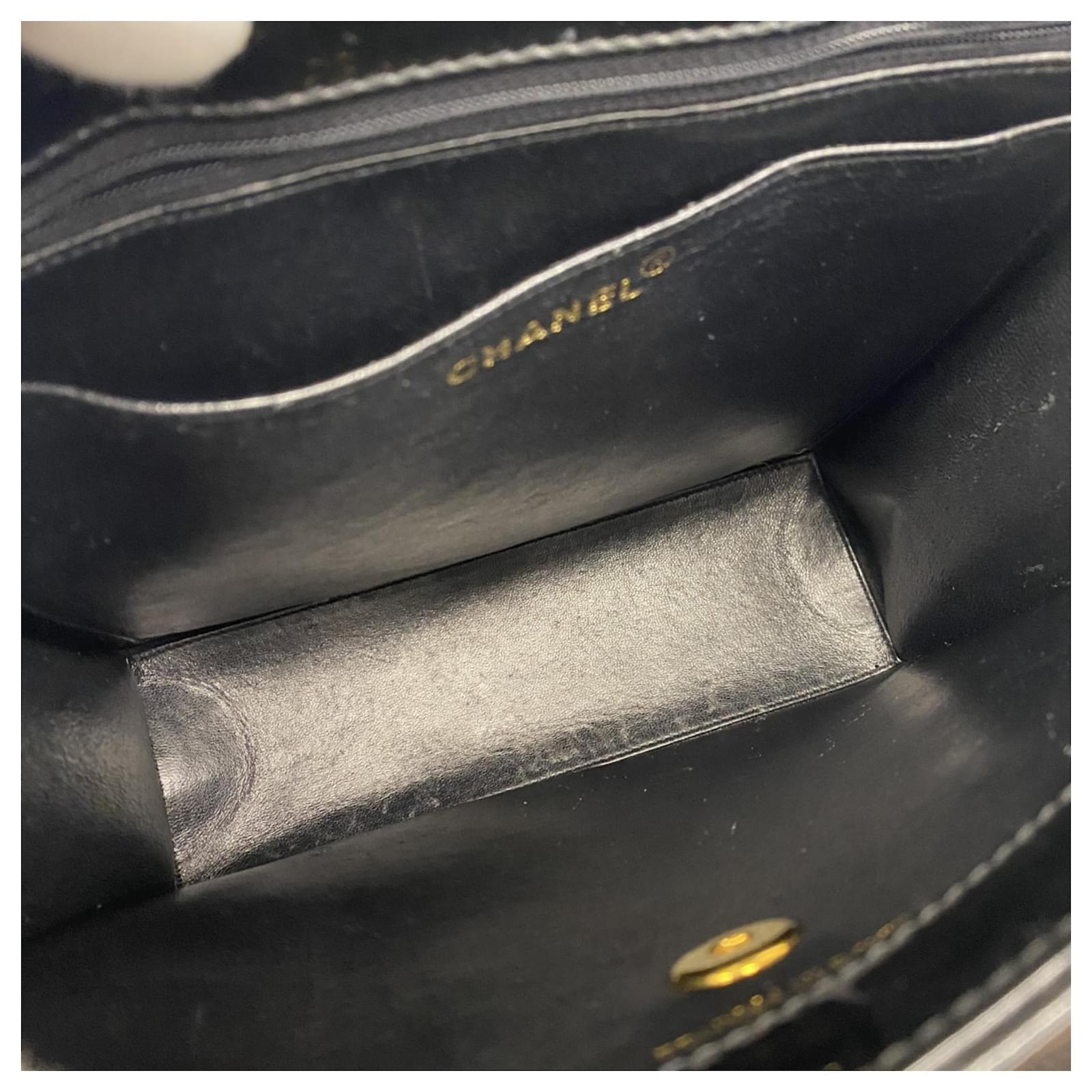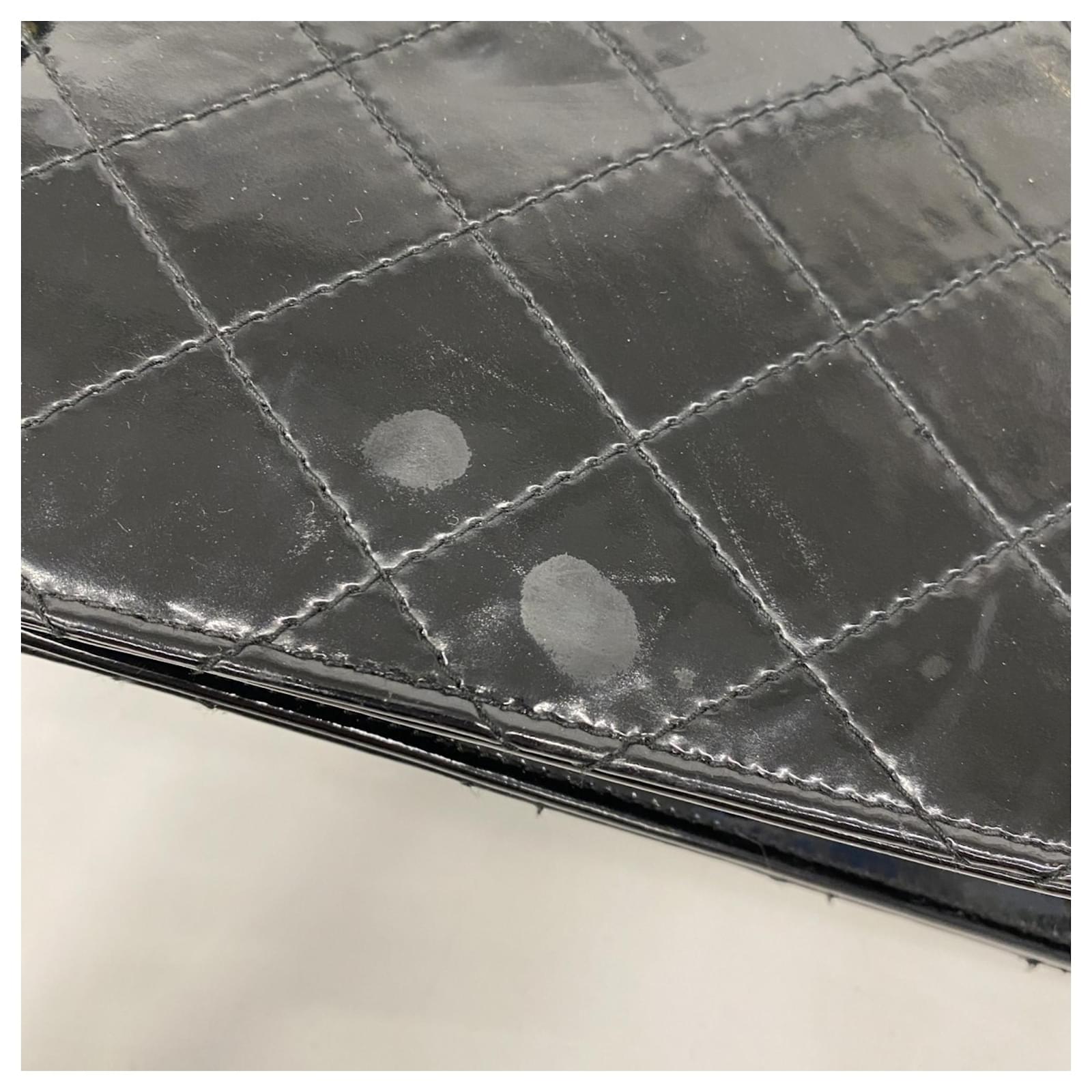 This Chanel handbag features a classic matelassé design crafted from black patent leather, complemented by gold hardware. With dimensions of 24cm x 25cm x 8.5cm, it is suitable for everyday use. The handbag is categorized as used but remains in good condition, showing slight traces of use, including minor scratches and dirt. It comes with a guarantee card, and potential buyers are encouraged to review the images for a detailed view of its condition and included accessories.