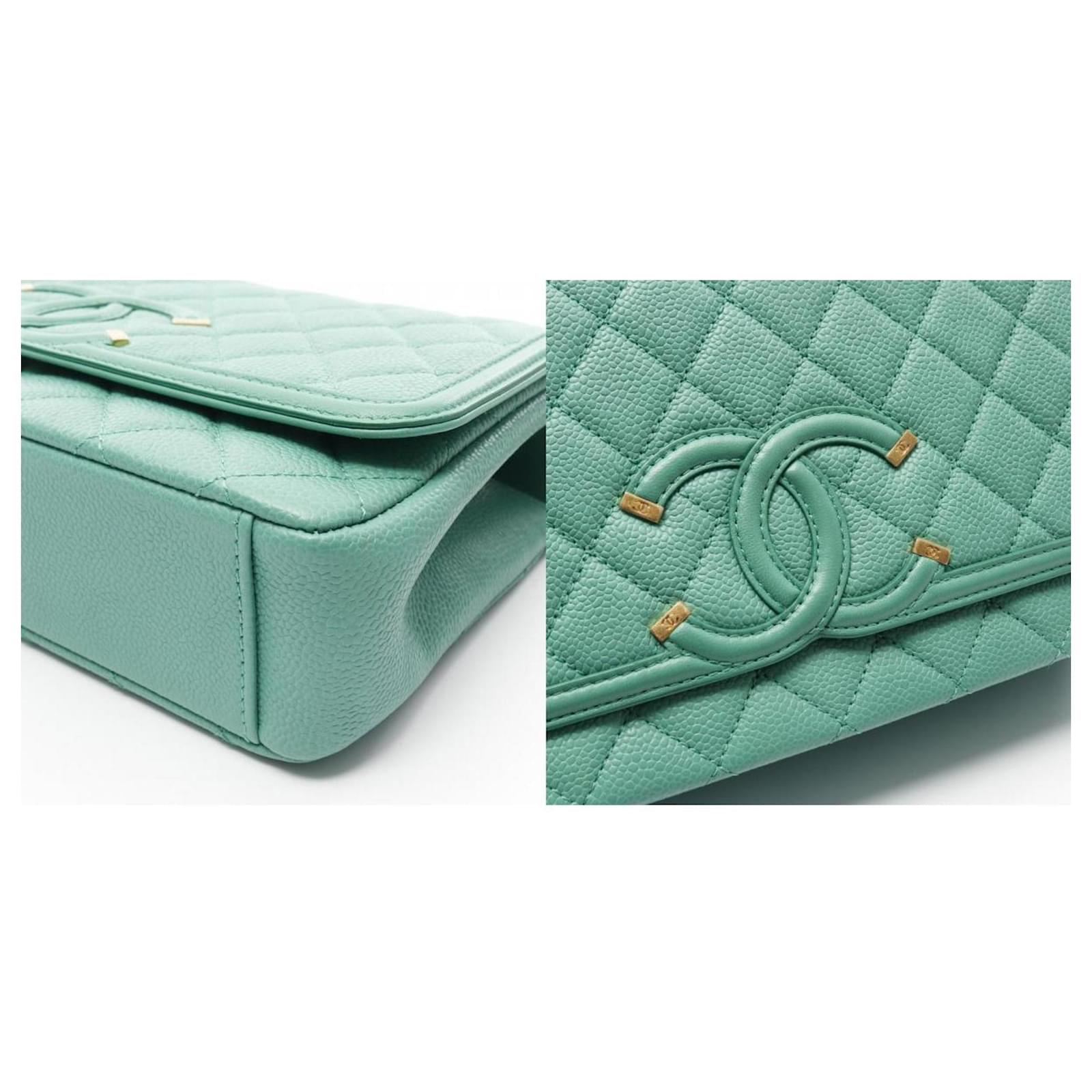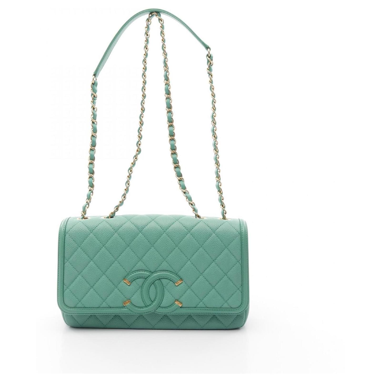 The Chanel CC Filigree Shoulder Bag is crafted from grained calfskin leather in a rich green hue, complemented by gold hardware. This stylish shoulder bag measures 26cm in height, 25.5cm in width, and 6cm in depth, making it a practical accessory for daily use. \n\nThis item is pre-owned and classified as being in good condition, with some visible traces of usage, including scratches and dirt. It is recommended to review the provided images for a detailed view of the bag’s condition and included accessories before making a purchase.