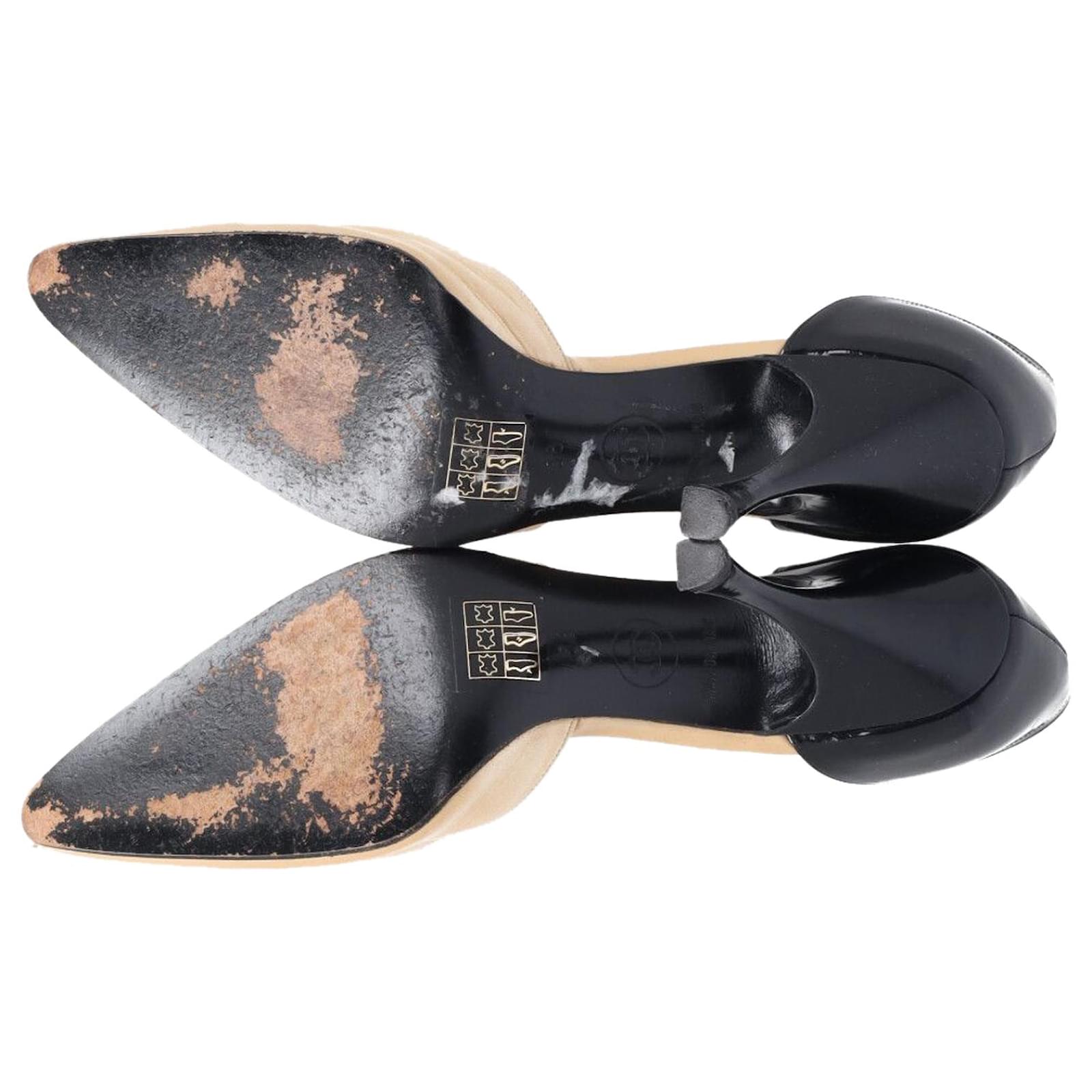 These black and beige pumps from the house of Chanel are truly elegant and poised. They are made from leather and patent and showcase two tone heels. They are made in a slip-on style with pointed toes. Wear them with formals as well as casuals!\nChanel Classic Two Tone Pumps in Beige Leather\nColor: Beige\nMaterial: leather\nSize: EU38\ncondition: good\nSign of wear: creases on upper and scuffed soles\nSKU: 199699 \n \n Product ID: 199699 \n