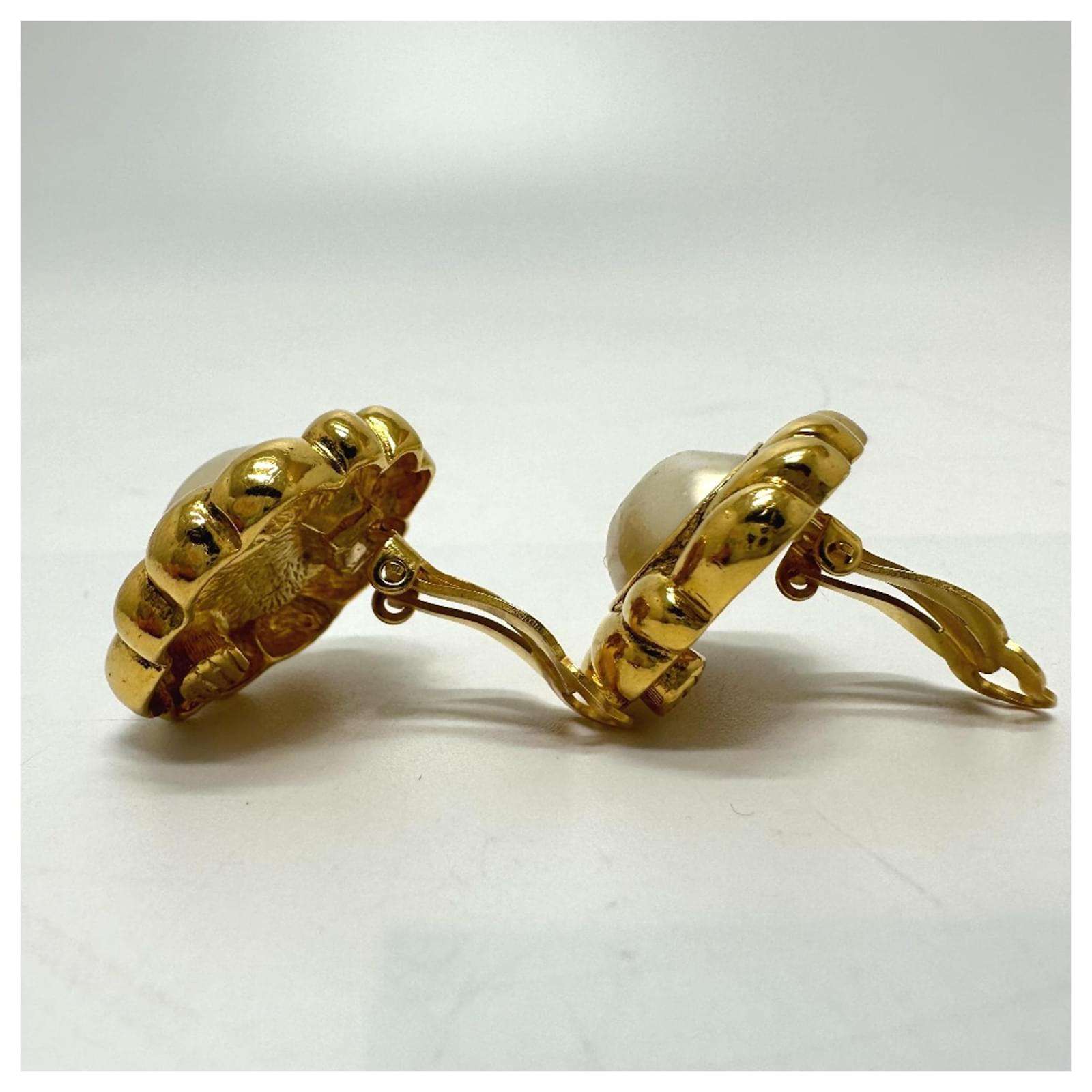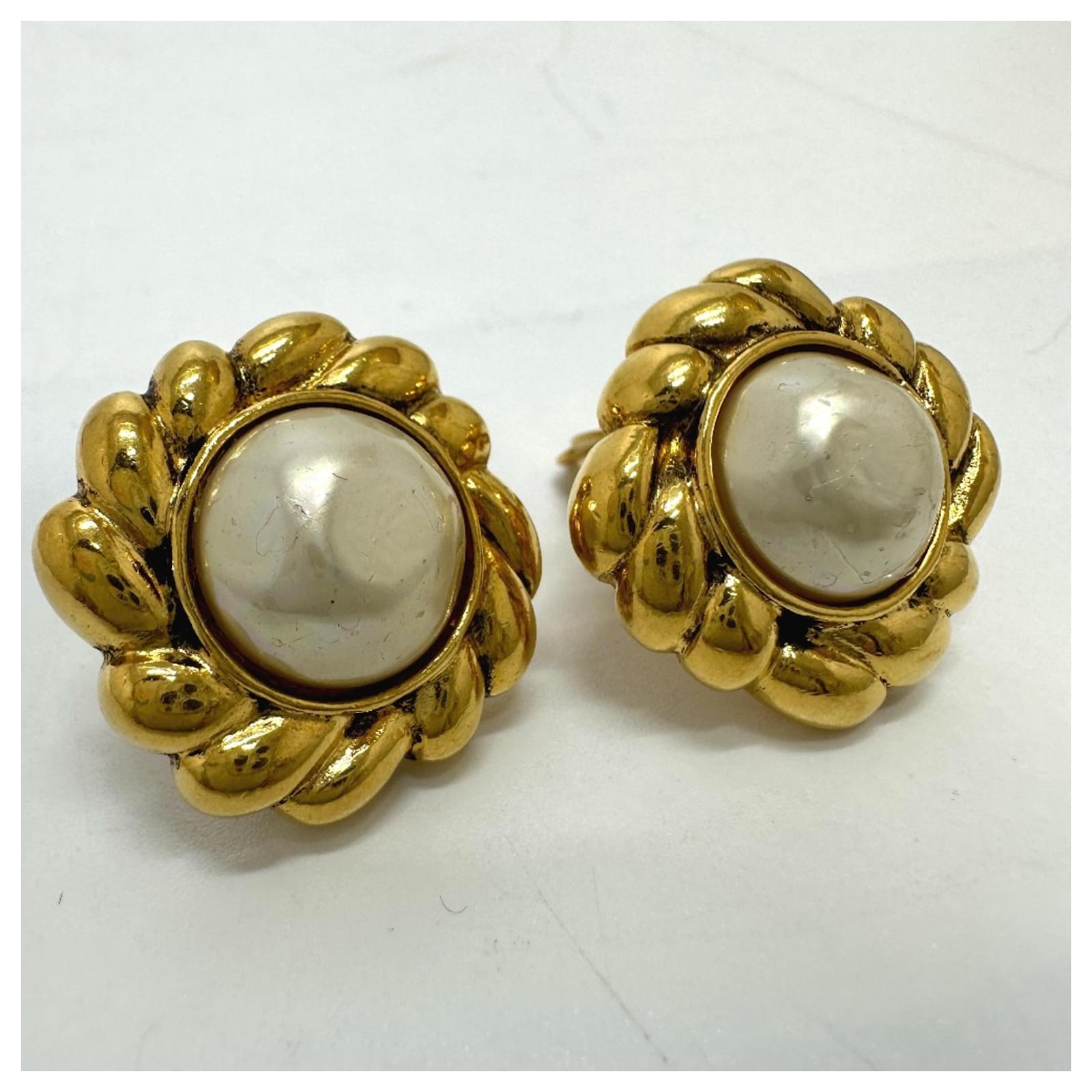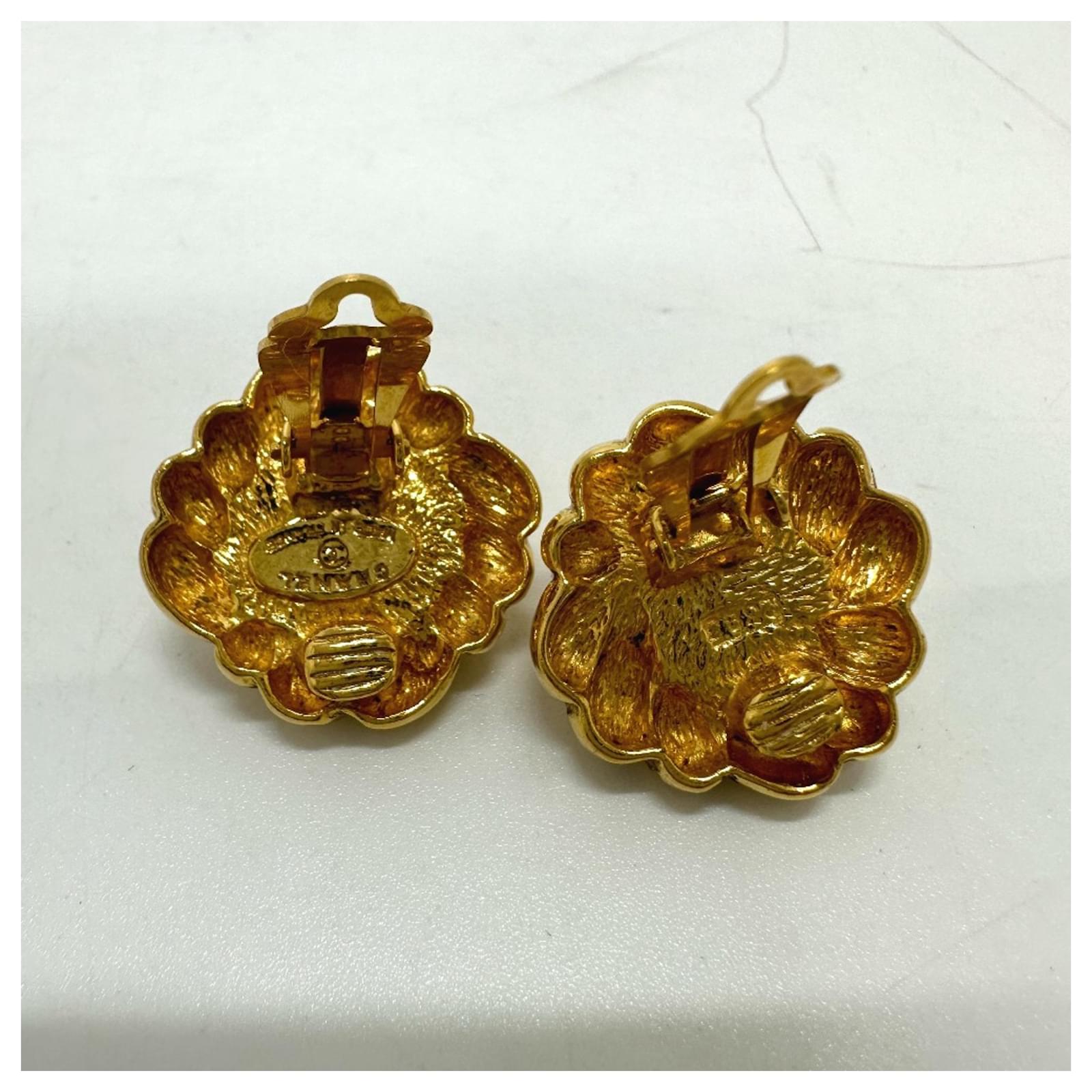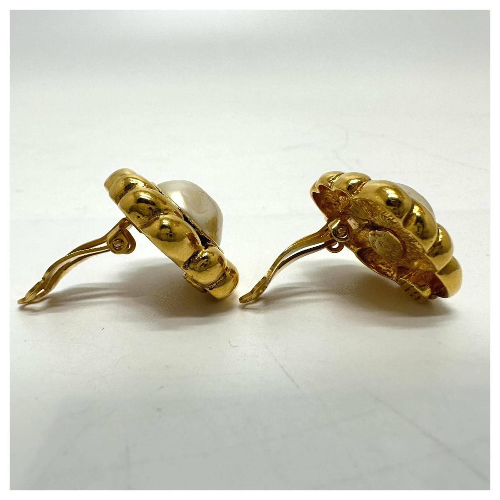 These Chanel clip earrings are crafted in a gold tone and made from other materials. They measure 2.5mm x 2.5mm and are categorized as used, showing traces of usage with some visible scratches and dirt, yet they remain in good condition. Ideal for those looking to add a touch of elegance to their accessory collection.