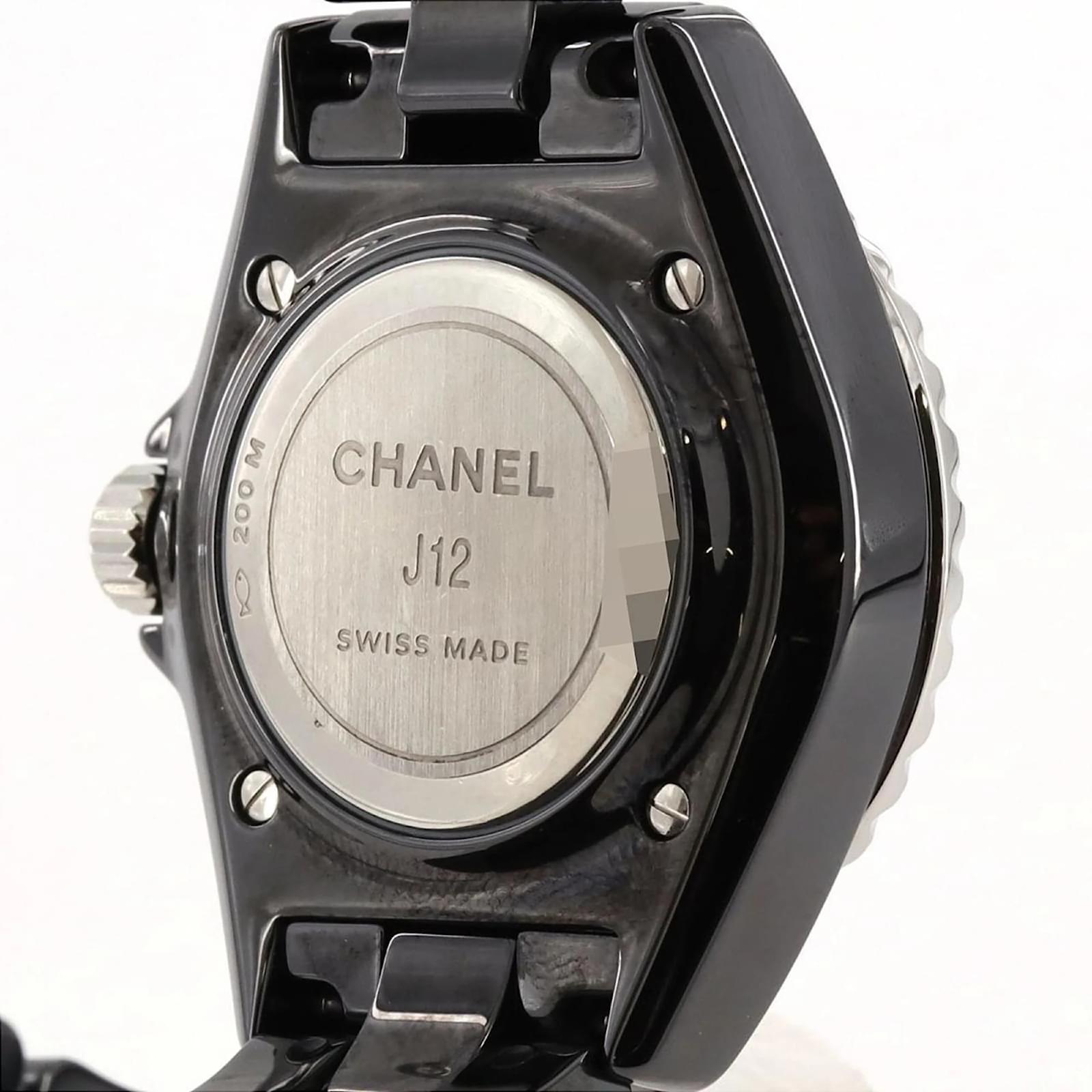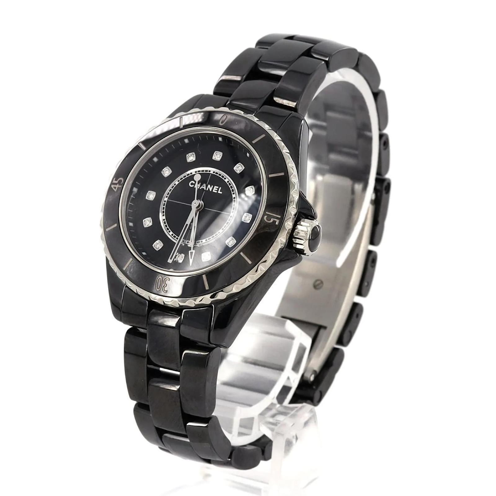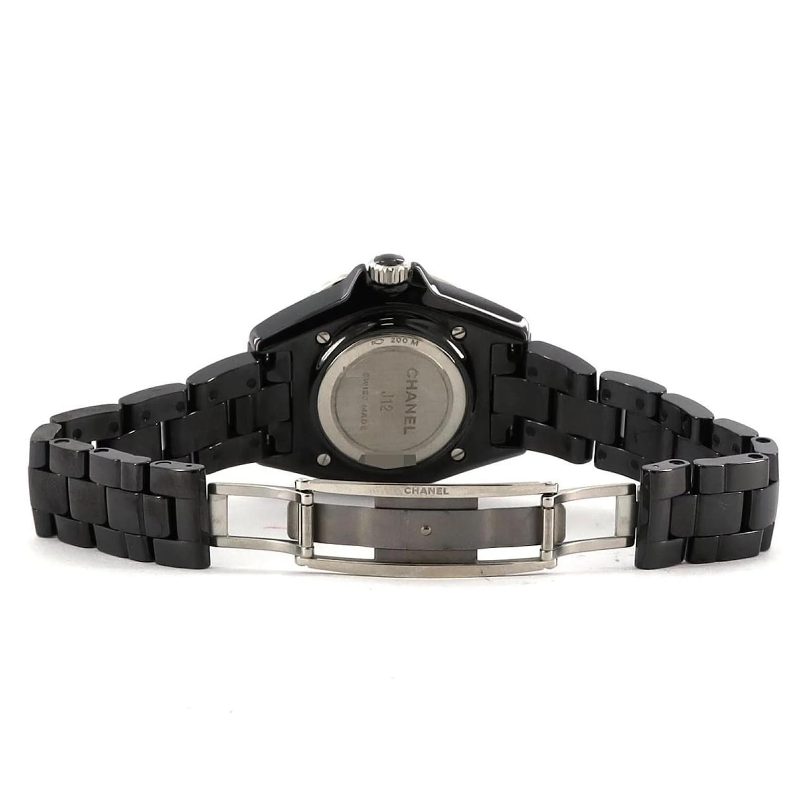 The Chanel J12 wristwatch features a sleek black dial and is crafted from durable ceramic for both the case and band. This model is powered by a reliable quartz movement and has a case diameter of 33mm, suitable for a wrist size of 17cm (6.69 inches). \n\nThis pre-owned timepiece is in very good condition, with insignificant scratches on the bezel, case back, and crown, while the dial and glass remain free from any scratches. The watch has undergone maintenance, including a battery replacement and polishing. \n\nIncluded with the watch are the inner and outer boxes, along with a warranty. Potential buyers are encouraged to review the provided images for a detailed view of the item’s condition and included accessories.