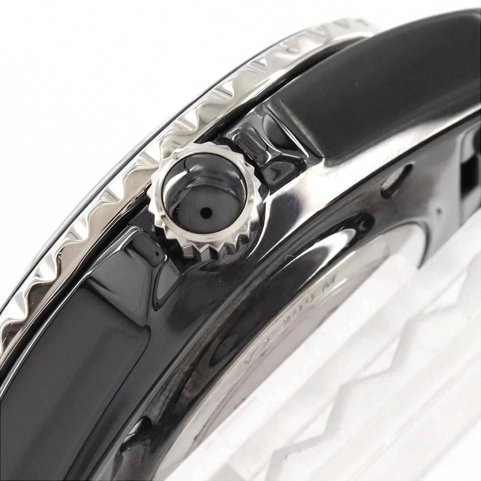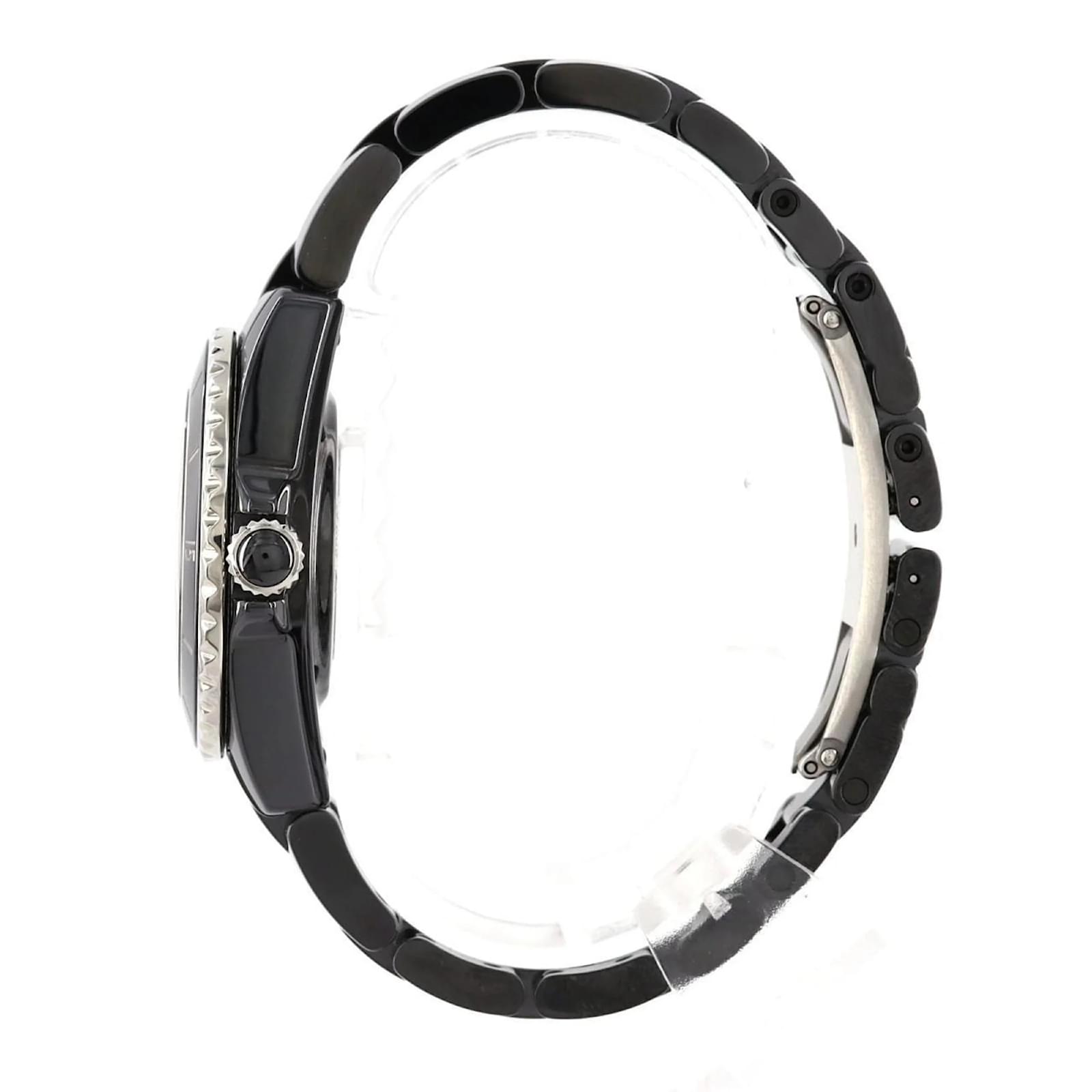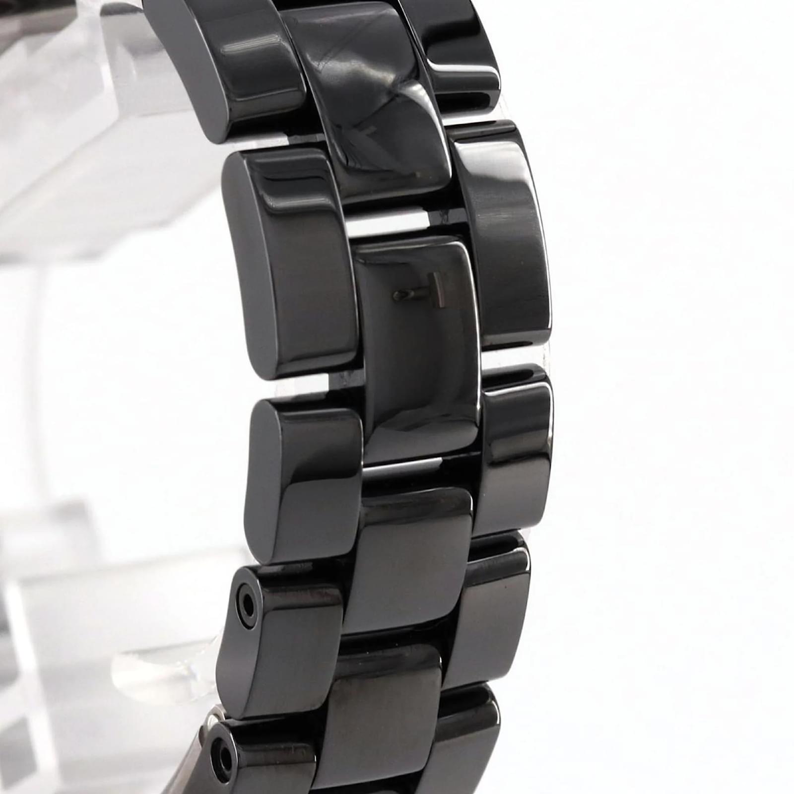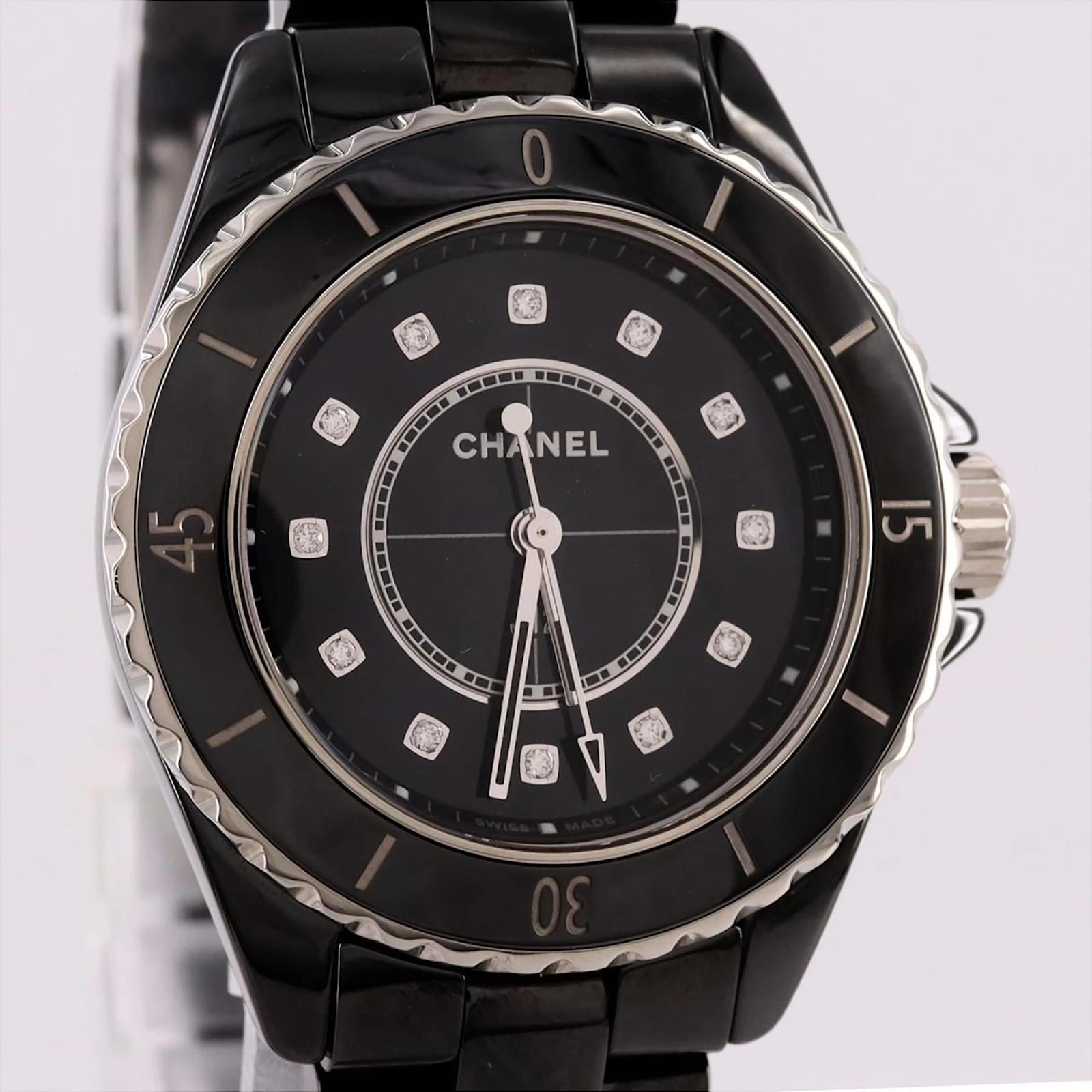 The Chanel J12 wristwatch features a sleek black dial and is crafted from durable ceramic for both the case and band. This model is powered by a reliable quartz movement and has a case diameter of 33mm, suitable for a wrist size of 17cm (6.69 inches). \n\nThis pre-owned timepiece is in very good condition, with insignificant scratches on the bezel, case back, and crown, while the dial and glass remain free from any scratches. The watch has undergone maintenance, including a battery replacement and polishing. \n\nIncluded with the watch are the inner and outer boxes, along with a warranty. Potential buyers are encouraged to review the provided images for a detailed view of the item’s condition and included accessories.