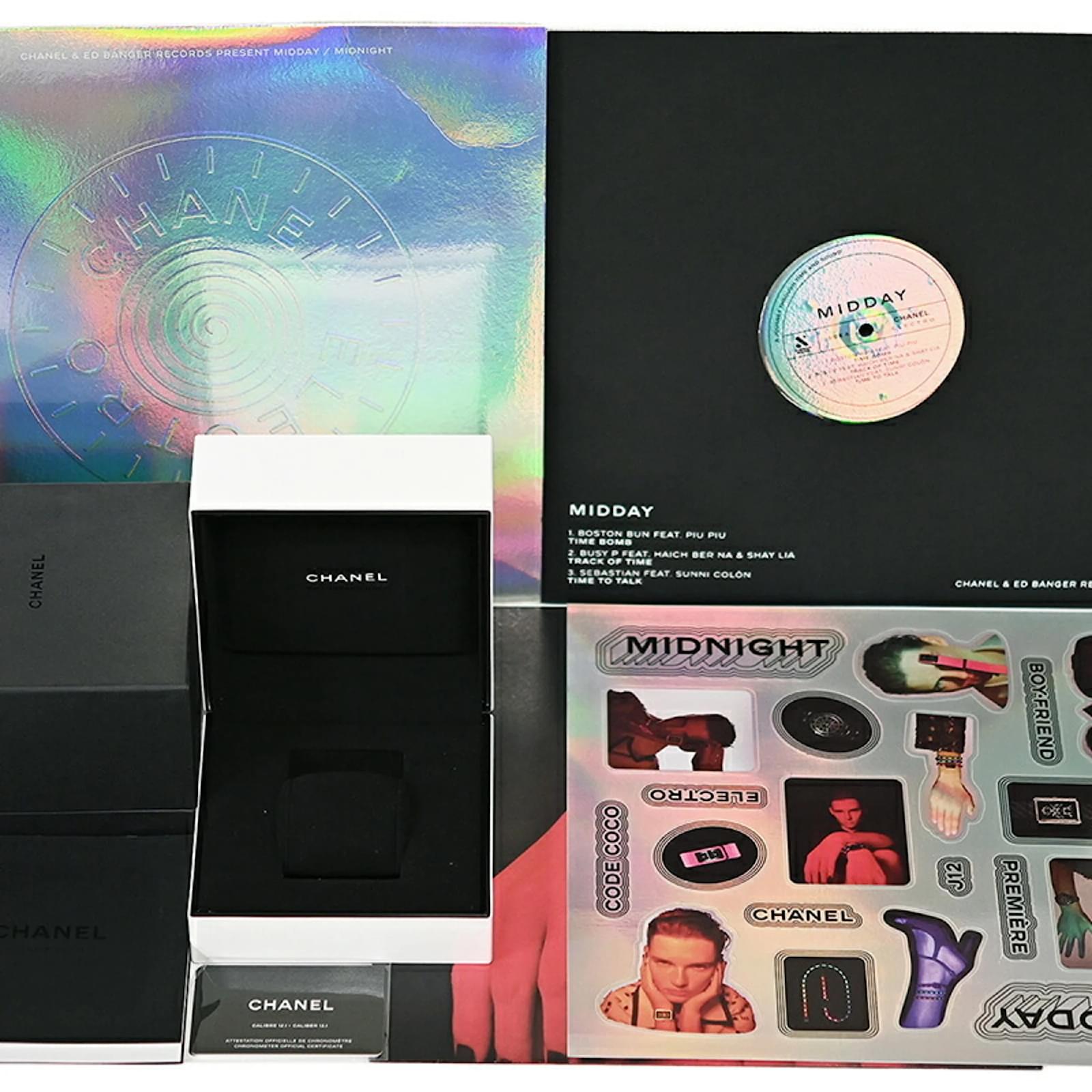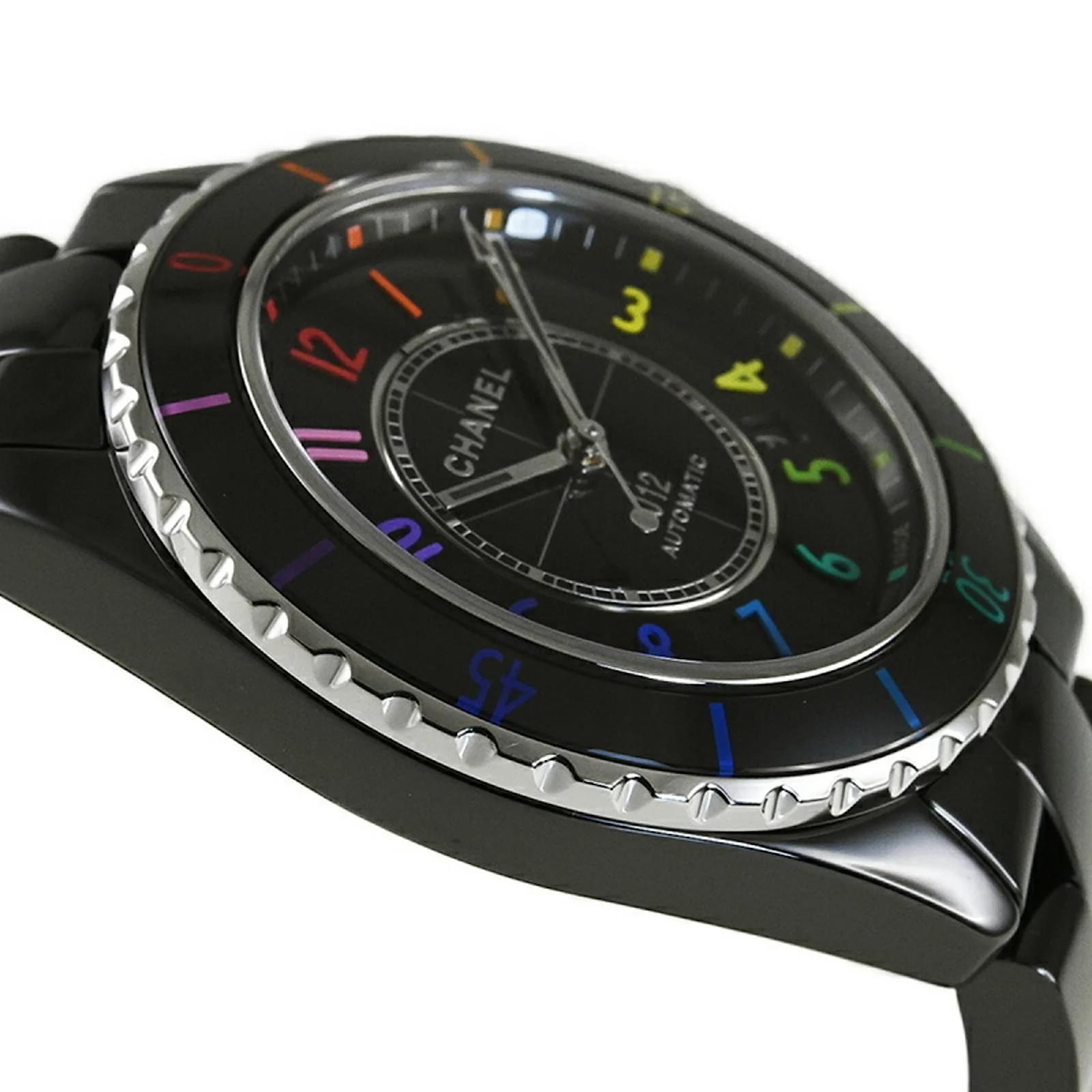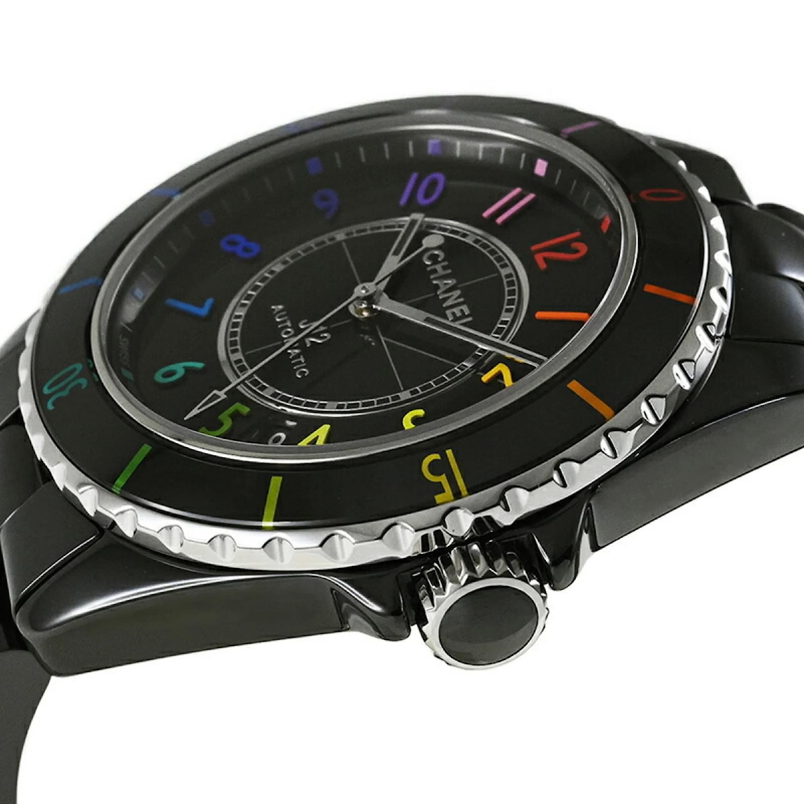 The Chanel J12 Black Electro Caliber 12.1 is a wristwatch that features a sleek black ceramic case and band. With a case diameter of 38mm and designed for a wrist size of 17.5cm (6.88 inches), this watch combines elegance with functionality. It operates on a self-winding automatic movement, ensuring reliable timekeeping. \n\nThis particular model is a world limited edition, numbered 1255 H7122, and is classified as used but in good condition, showing slight traces of wear such as minor scratches on the bezel and case. The dial and glass are in excellent condition with insignificant scratches. \n\nIncluded with the watch are a booklet, certificate, and both inner and outer boxes. Potential buyers are encouraged to review the provided images for a detailed view of the watch’s condition and included accessories.