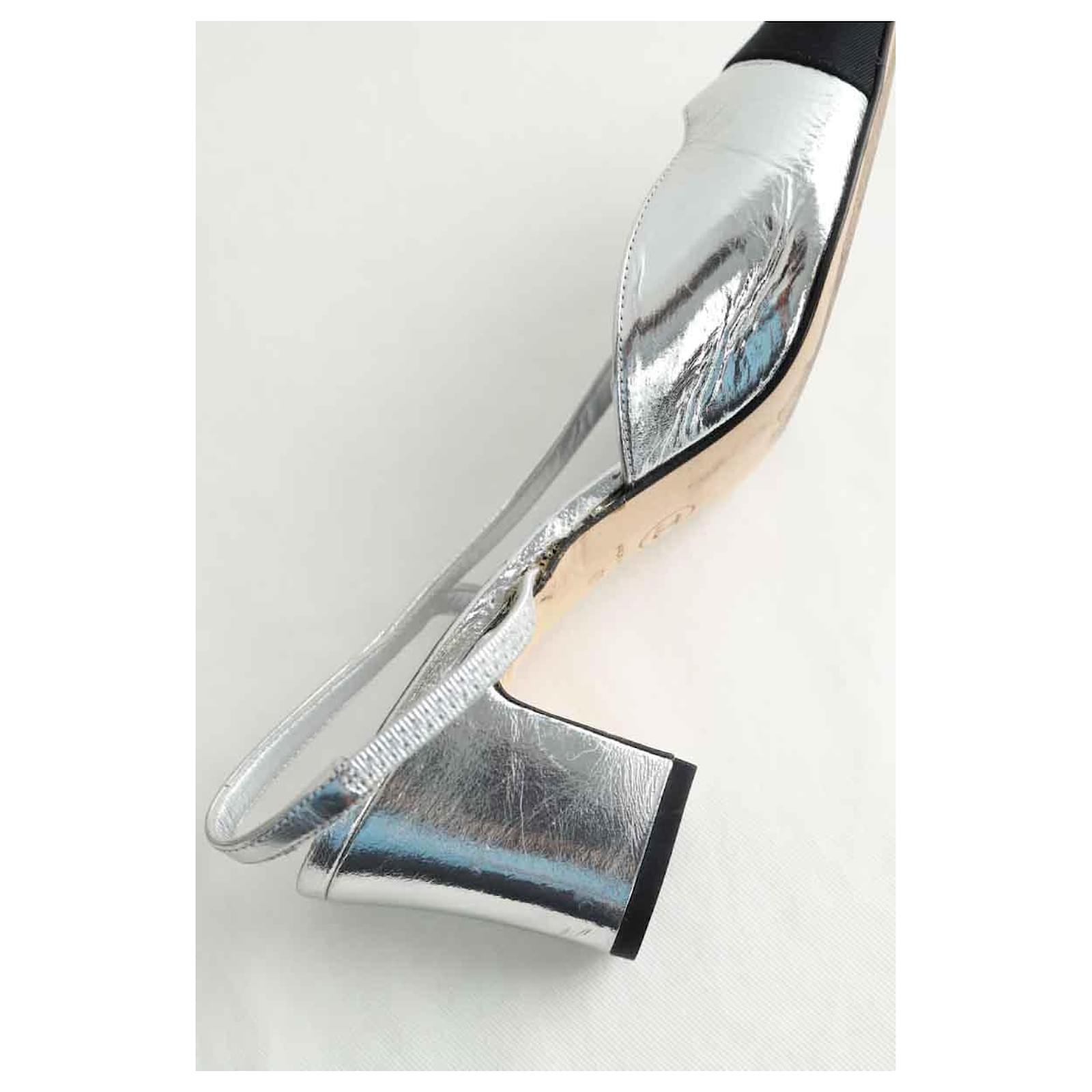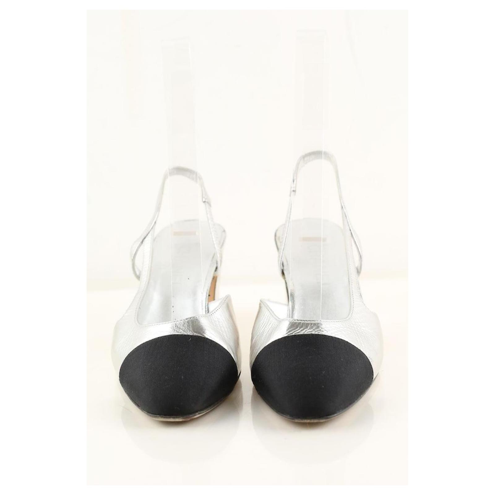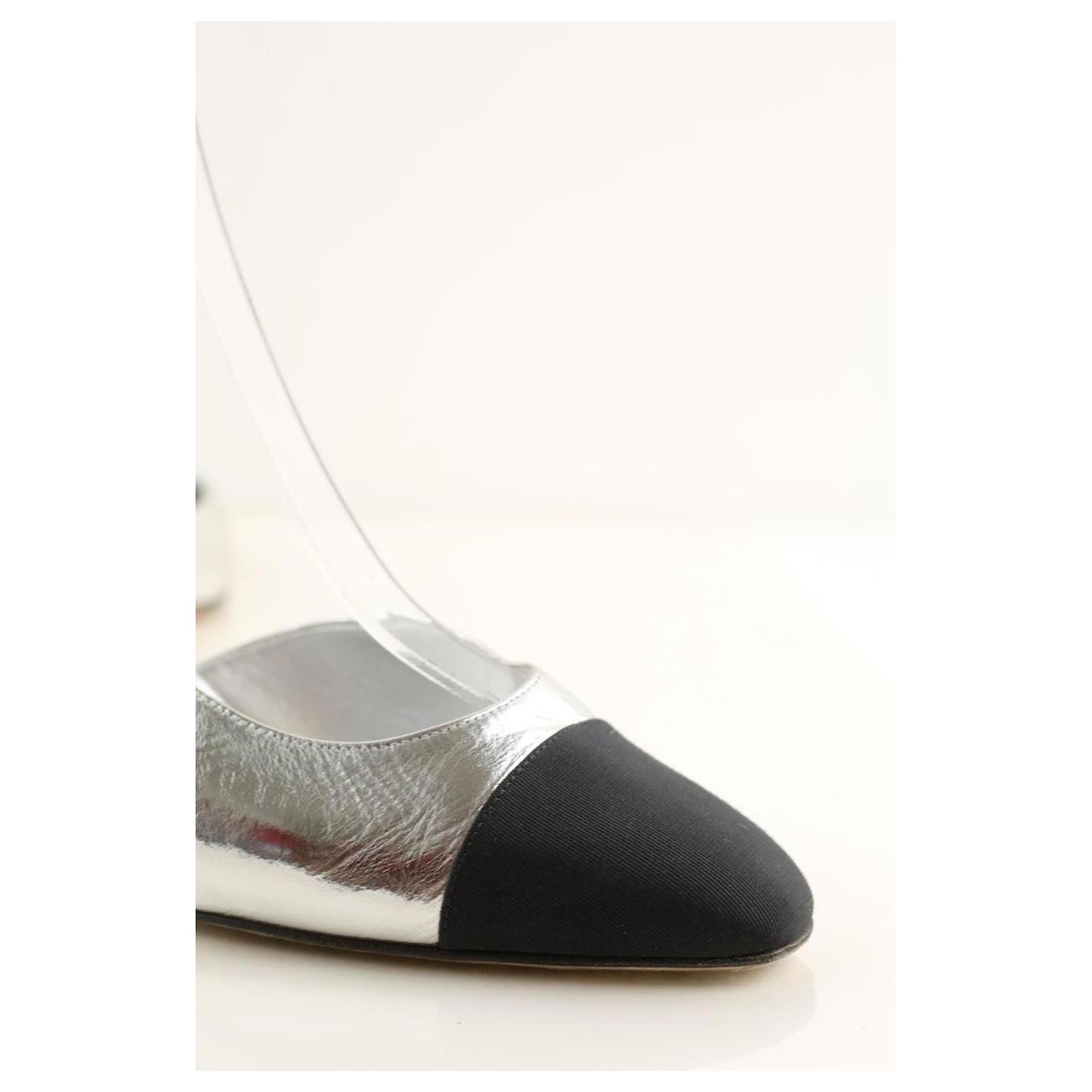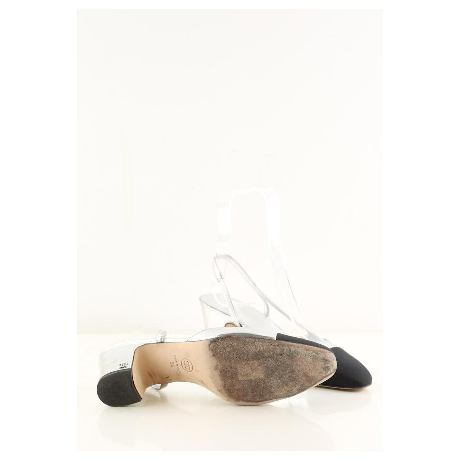 Second-hand Chanel silver heels. Main material leather. Size 38. Heel height: 7cm. Women’s collection. Good condition. The back straps have been re-glued by the customer, with a slightly visible finish. This defect does not affect wear, but has been taken into account in the price. Reference: 024640052.
