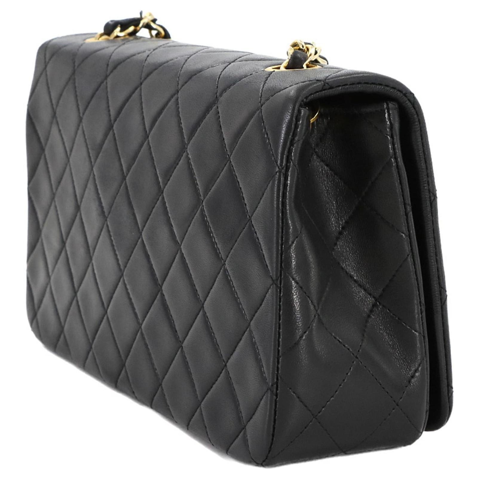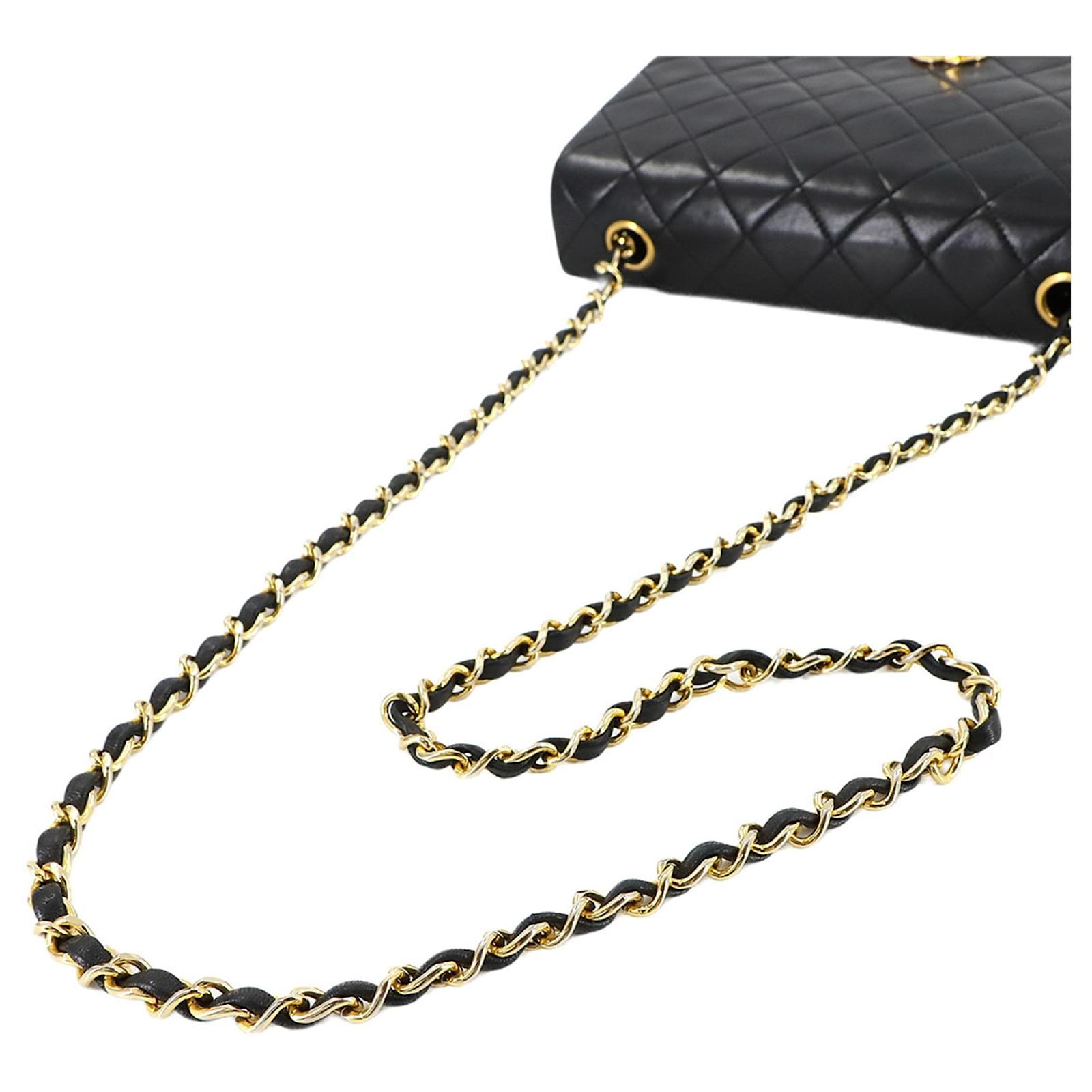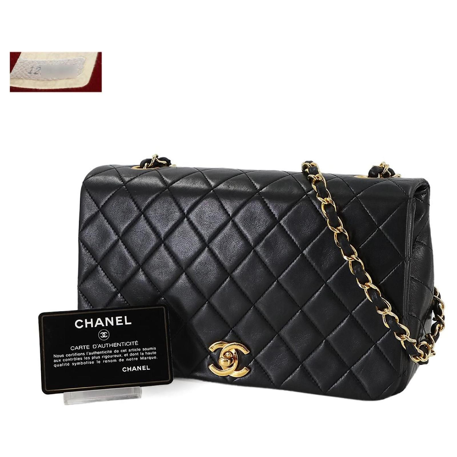 This Chanel Matelasse Chain Shoulder Bag is crafted from black lambskin leather and features gold metal fittings with a turn lock closure. The bag measures 13.5cm in height, 23cm in width, and 7cm in depth, making it a compact yet stylish accessory. \n\nIn terms of condition, it is classified as used but in mint condition, with insignificant traces of use, including minor peeling in the inner pocket. The item comes with a guarantee card and is presented in a way that reflects its quality. For a complete understanding of its condition, potential buyers are encouraged to review the provided images.