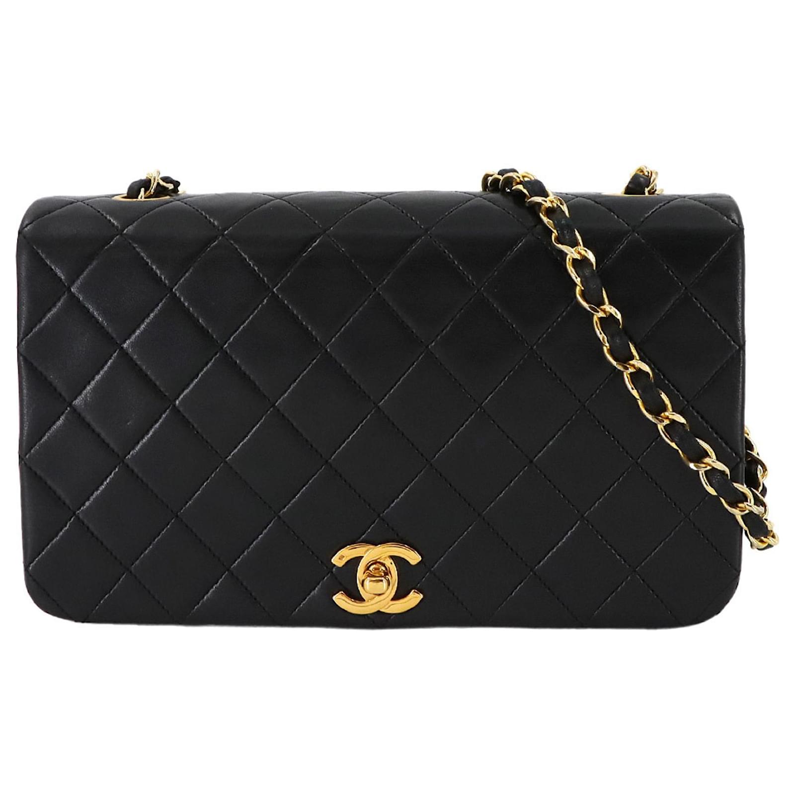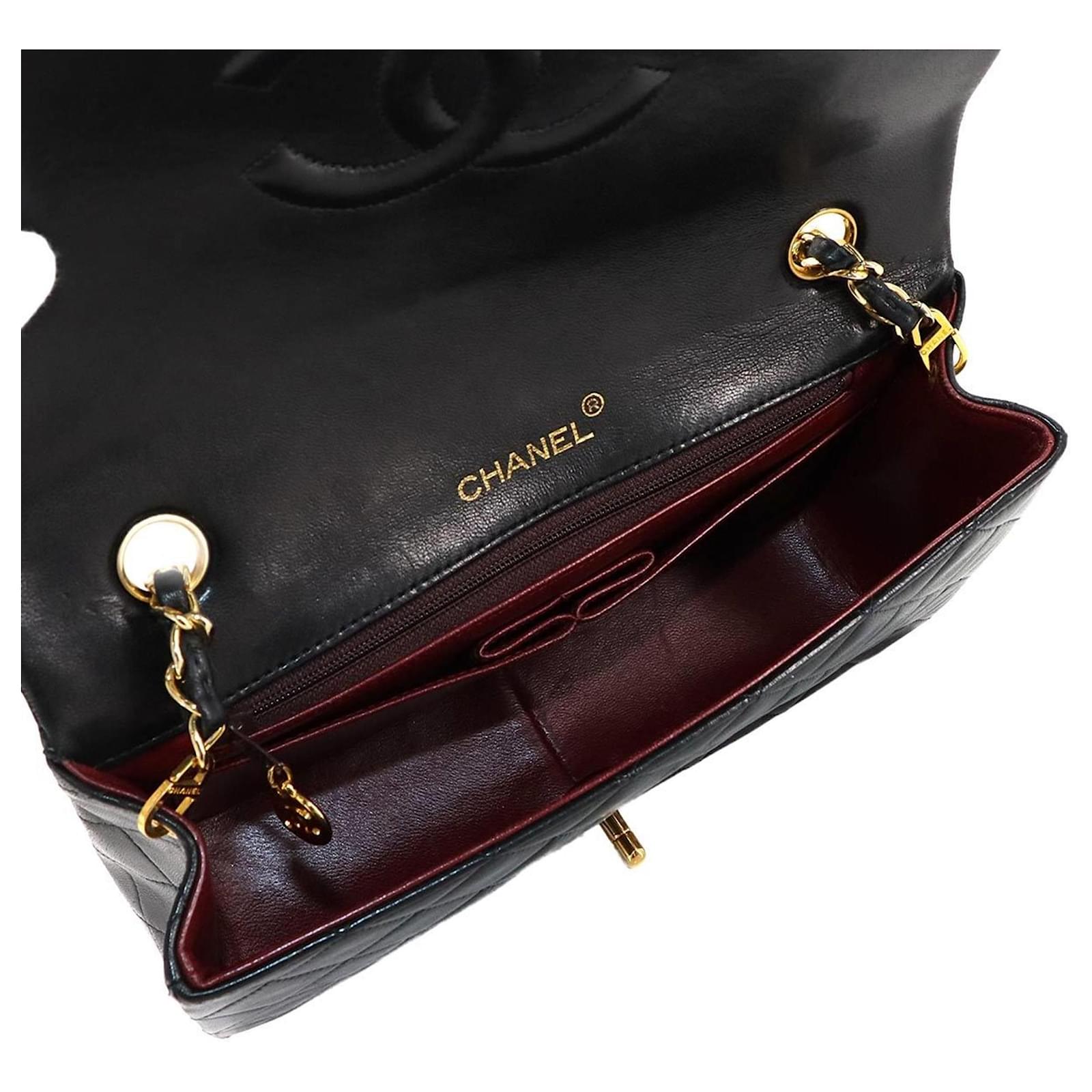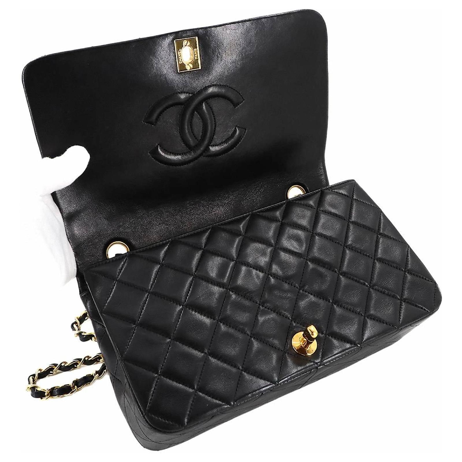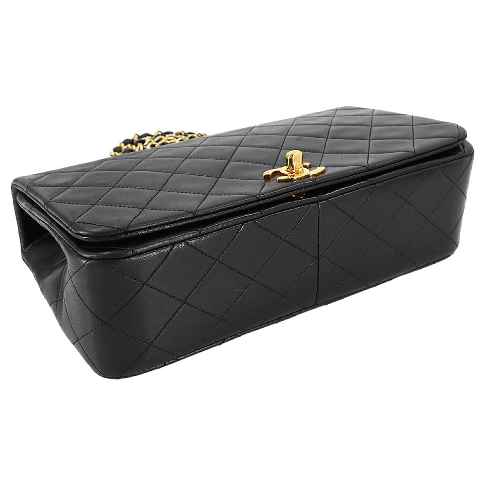 This Chanel Matelasse Chain Shoulder Bag is crafted from black lambskin leather and features gold metal fittings with a turn lock closure. The bag measures 13.5cm in height, 23cm in width, and 7cm in depth, making it a compact yet stylish accessory. \n\nIn terms of condition, it is classified as used but in mint condition, with insignificant traces of use, including minor peeling in the inner pocket. The item comes with a guarantee card and is presented in a way that reflects its quality. For a complete understanding of its condition, potential buyers are encouraged to review the provided images.