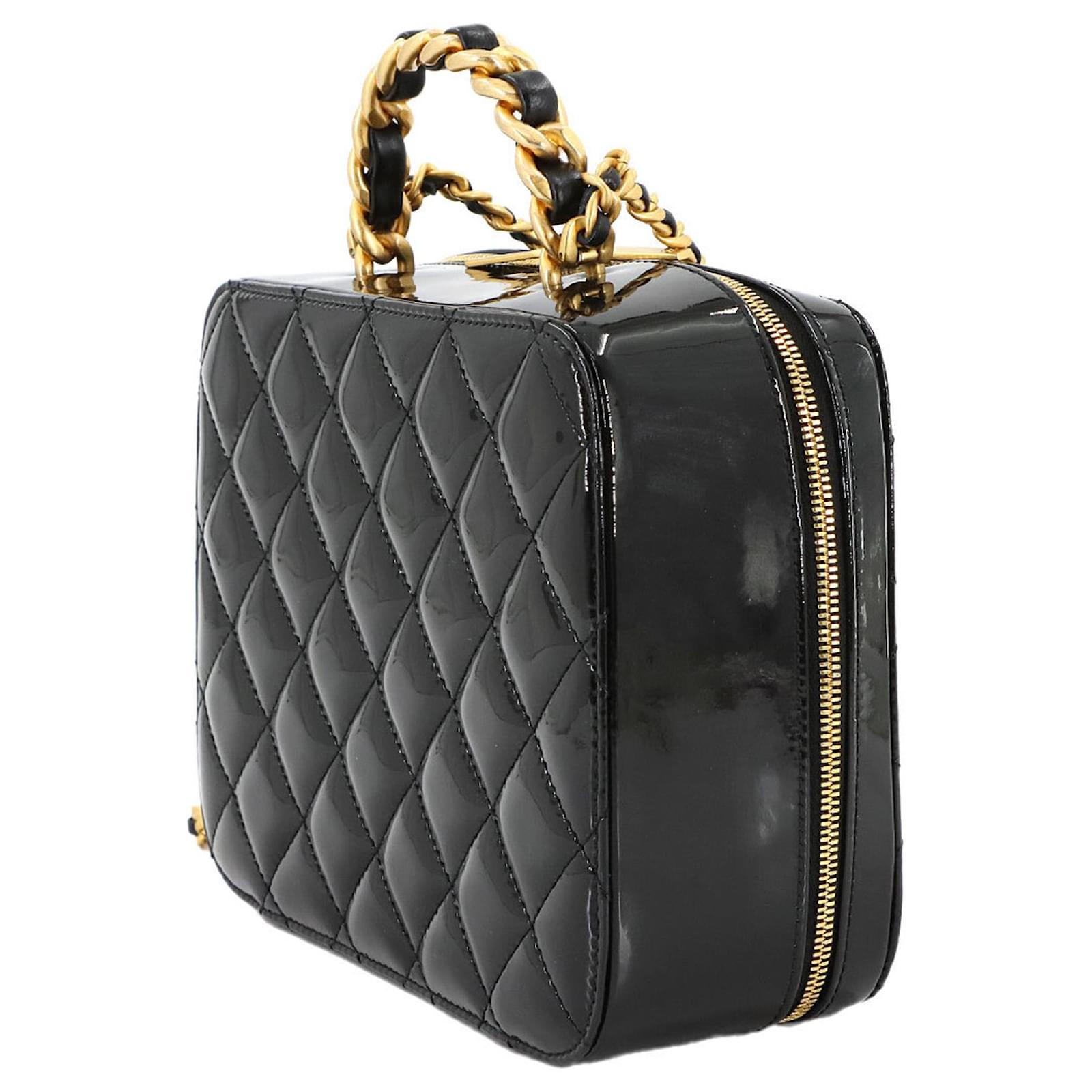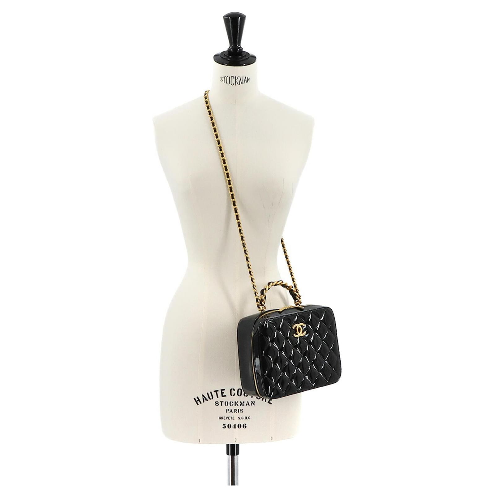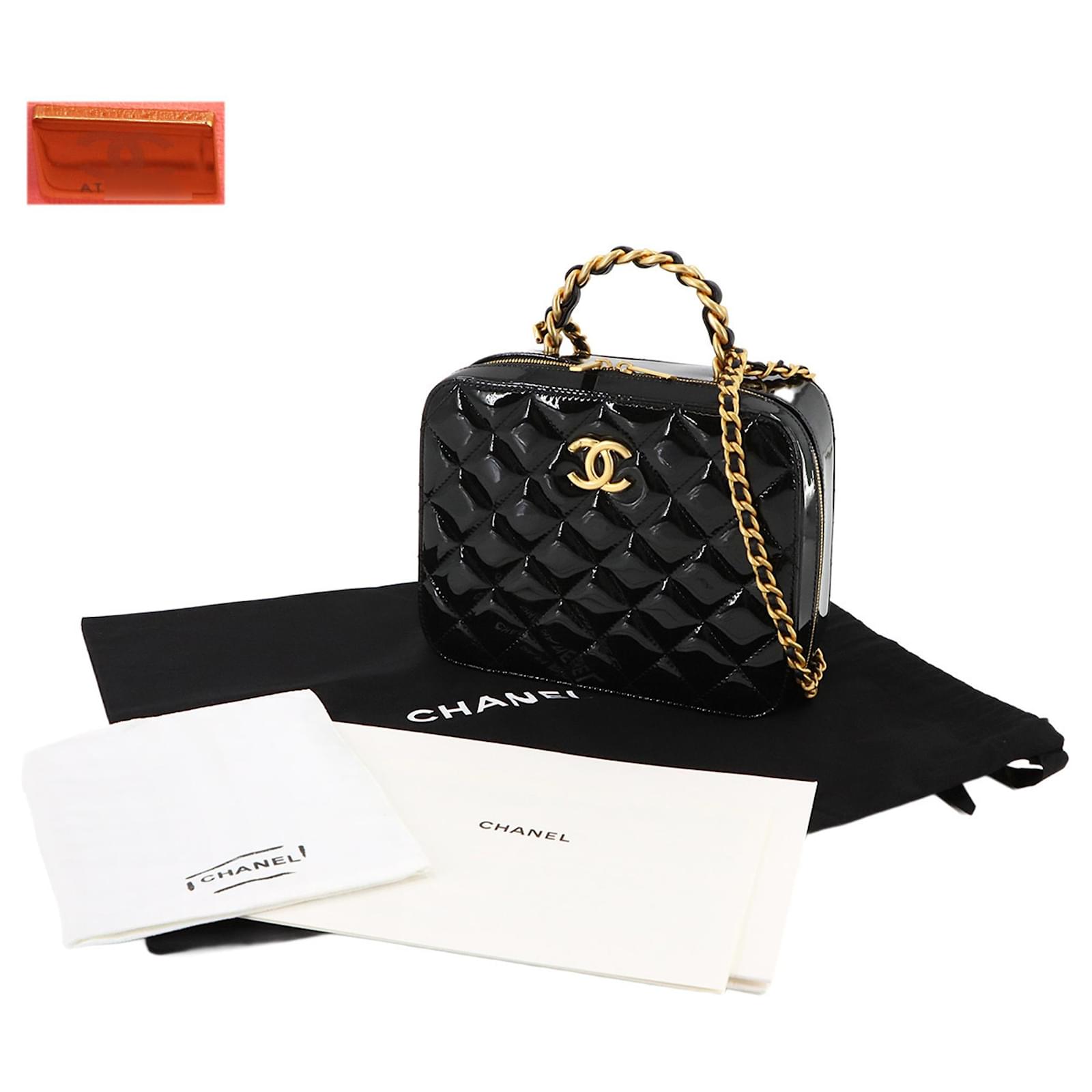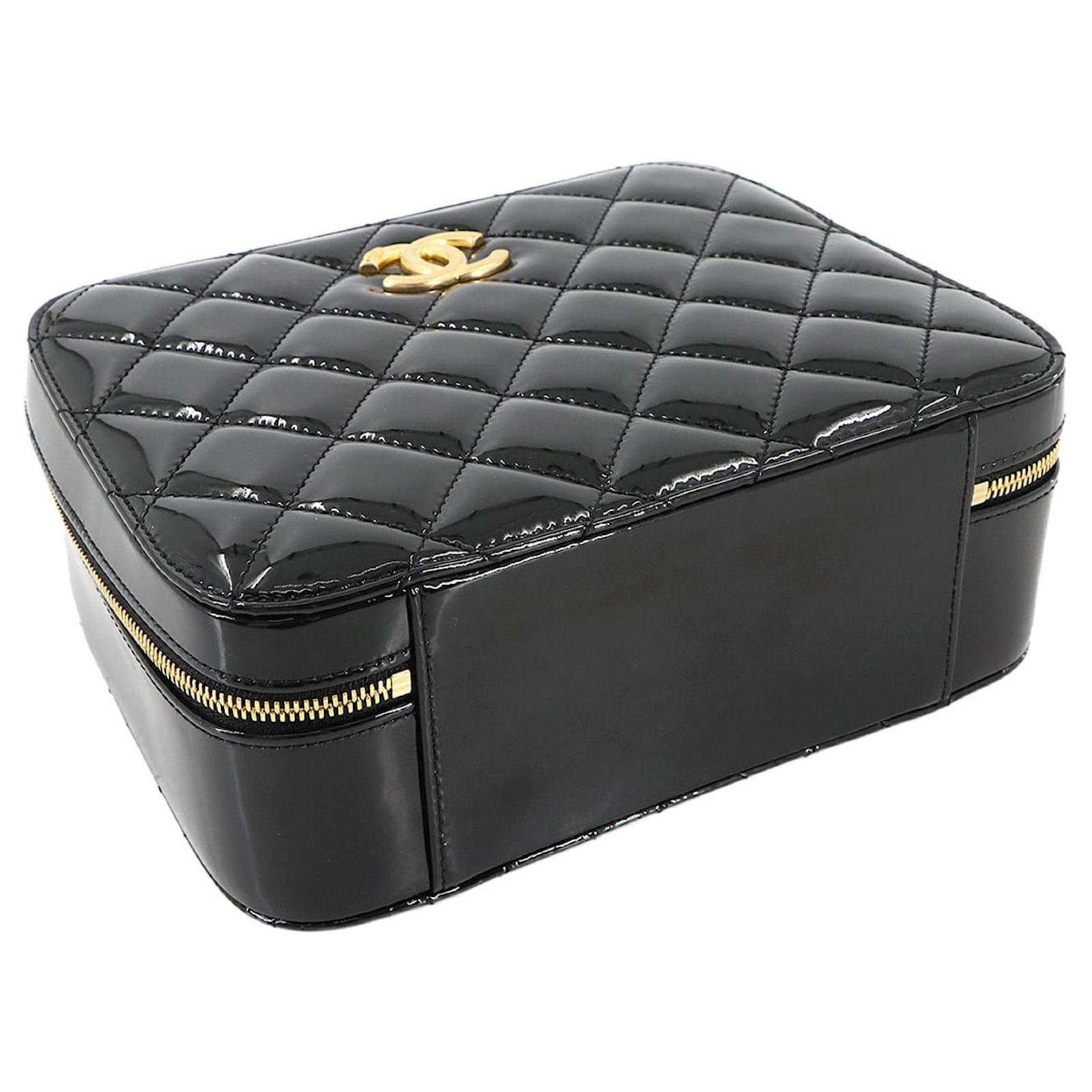 The Chanel Matelasse Vanity 2way Hand Chain Shoulder Bag is crafted from black enamel leather, offering a sophisticated design suitable for various occasions. Measuring 16cm x 20cm x 7.5cm, this handbag features gold hardware that complements its elegant appearance. \n\nThis item is in opened but never used condition, classified as Rank N, indicating it has been a display item with insignificant traces of use, scratches, and dirt. Included with the bag are a cloth and a dust bag, ensuring proper care and storage. For a complete understanding of the item’s condition, potential buyers are encouraged to review the provided images.