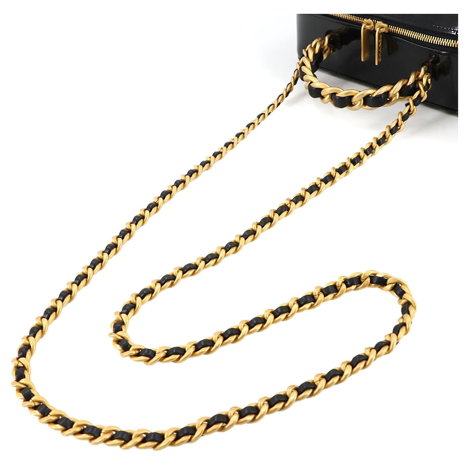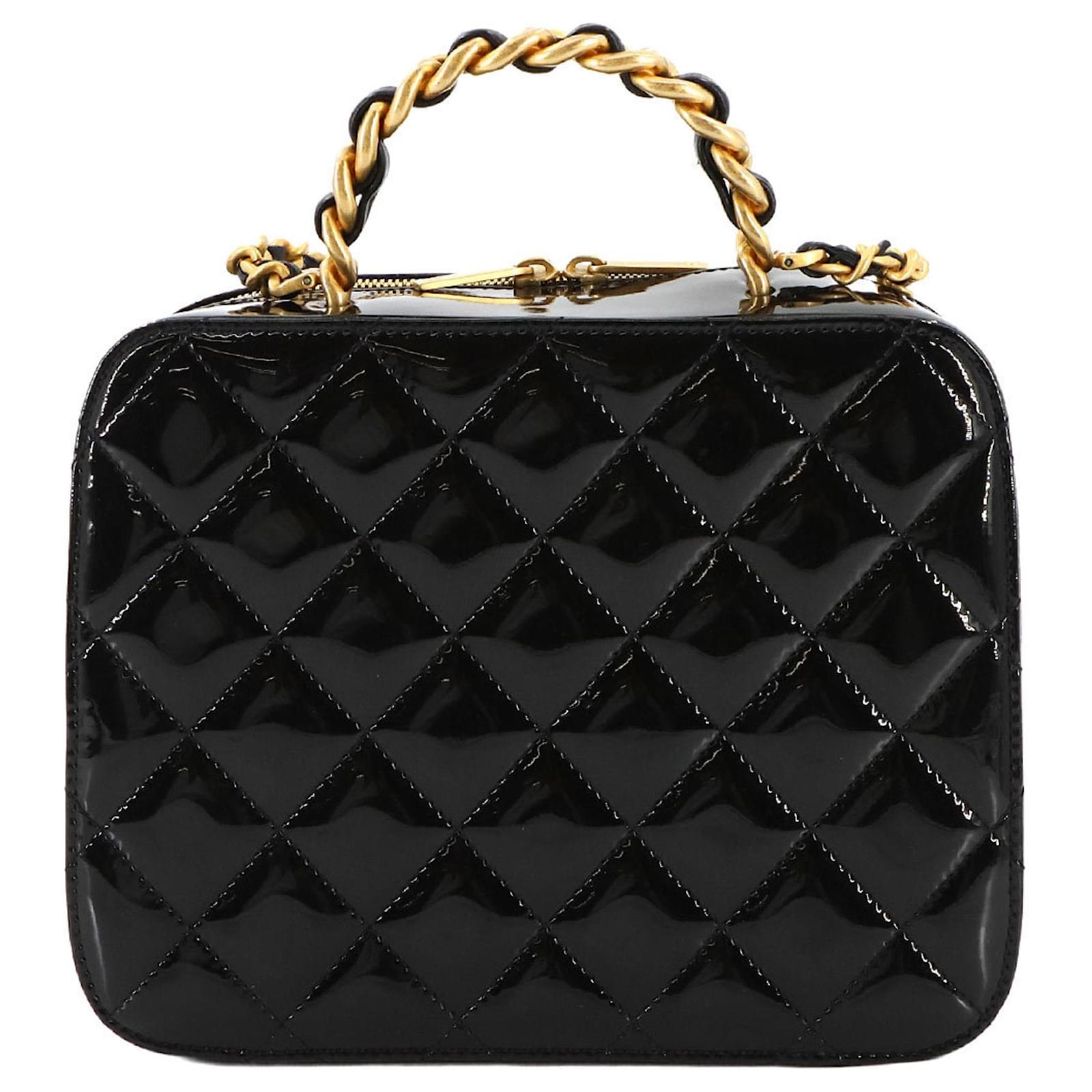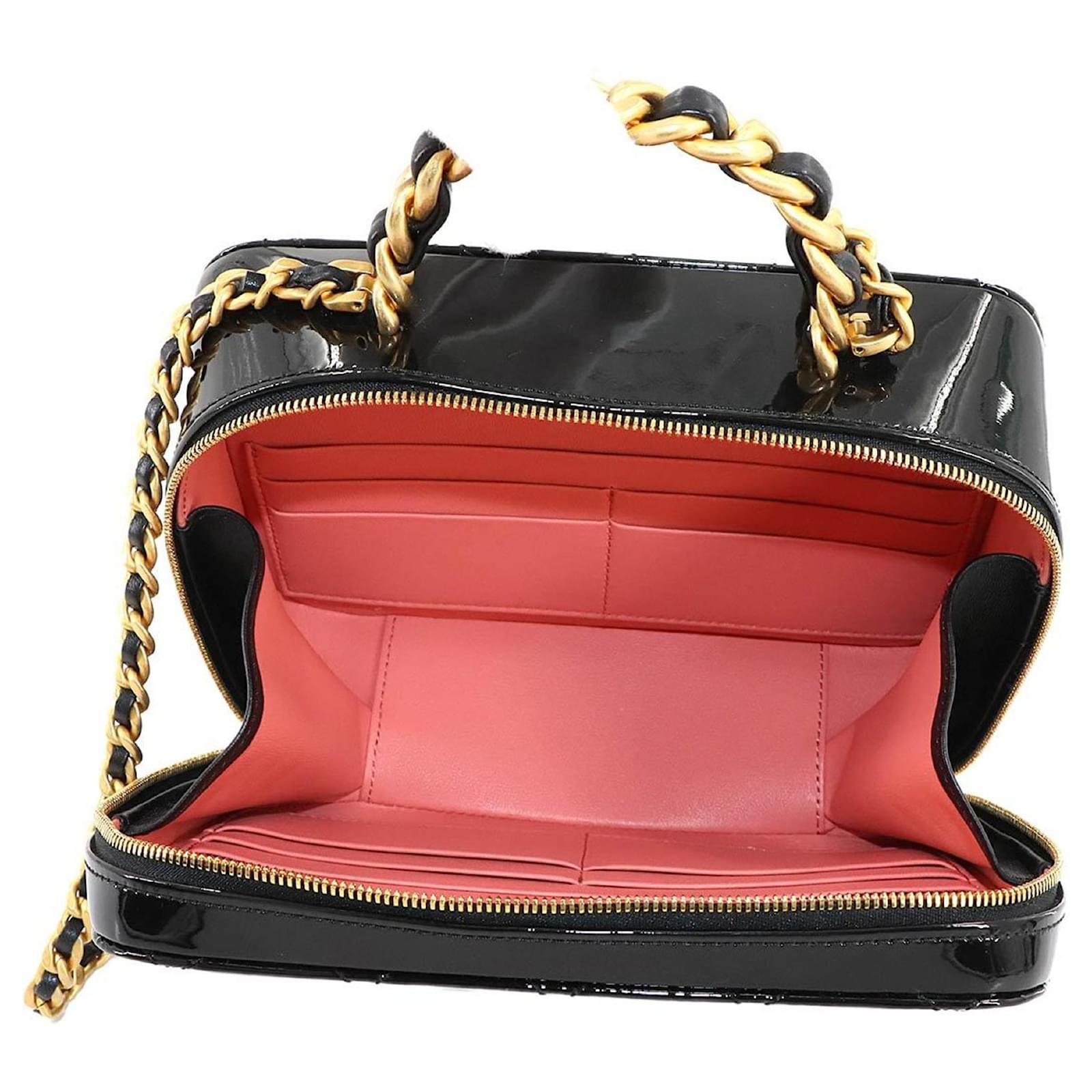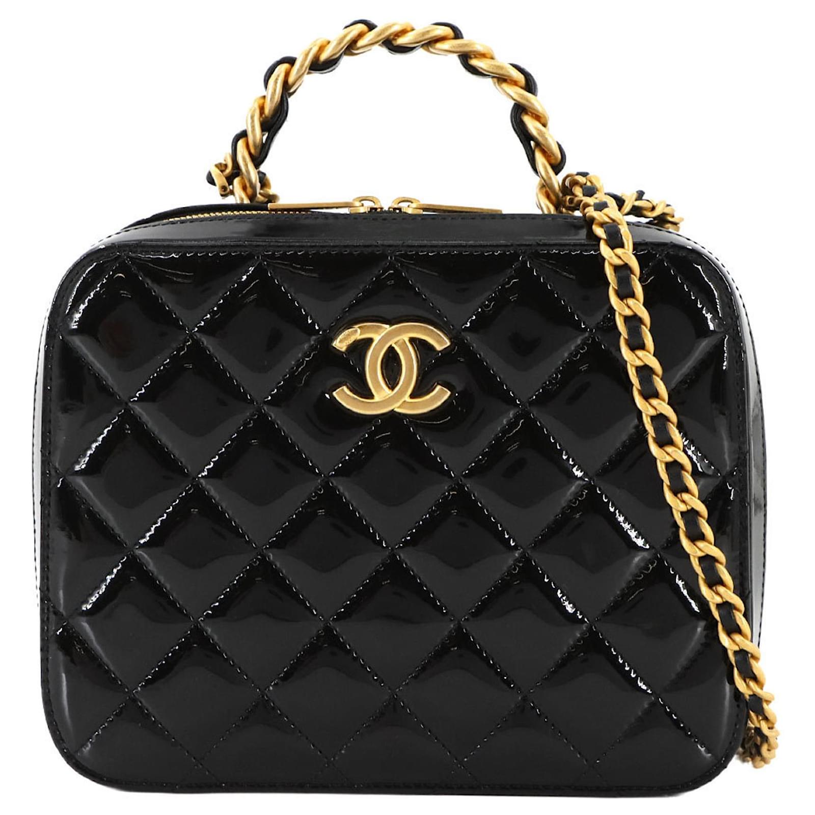 The Chanel Matelasse Vanity 2way Hand Chain Shoulder Bag is crafted from black enamel leather, offering a sophisticated design suitable for various occasions. Measuring 16cm x 20cm x 7.5cm, this handbag features gold hardware that complements its elegant appearance. \n\nThis item is in opened but never used condition, classified as Rank N, indicating it has been a display item with insignificant traces of use, scratches, and dirt. Included with the bag are a cloth and a dust bag, ensuring proper care and storage. For a complete understanding of the item’s condition, potential buyers are encouraged to review the provided images.