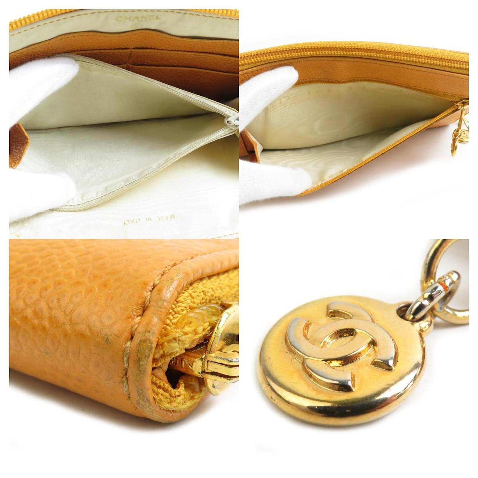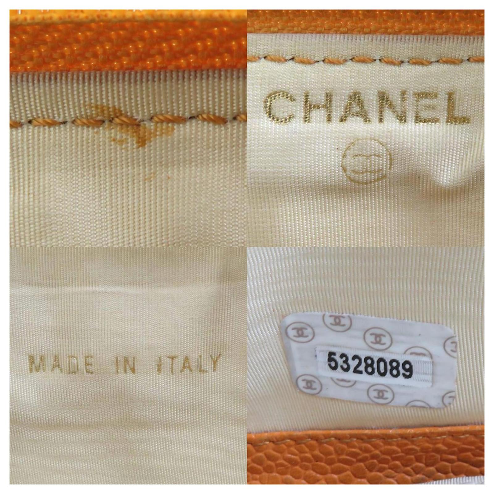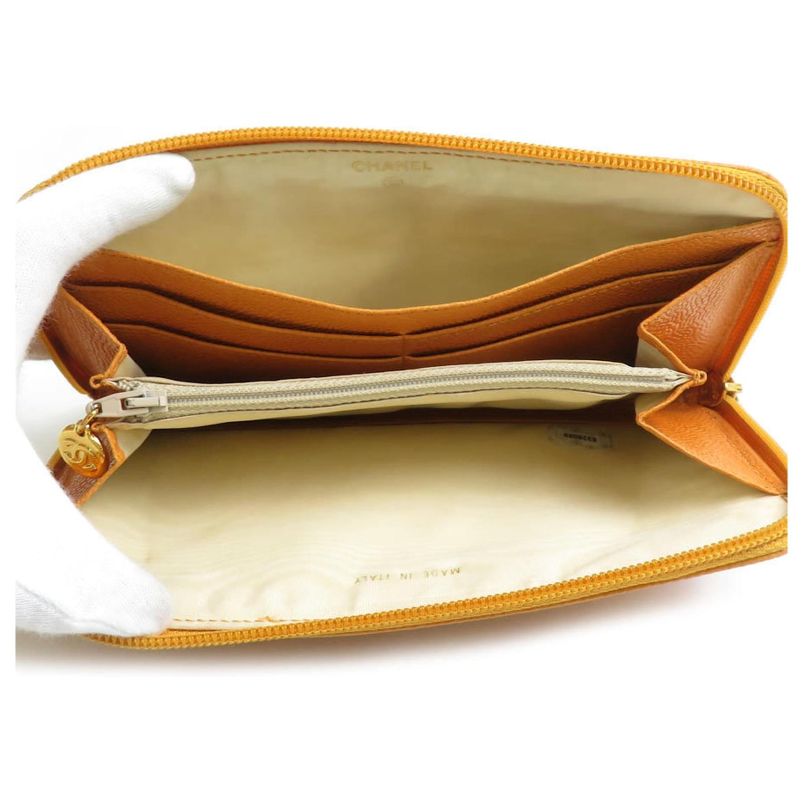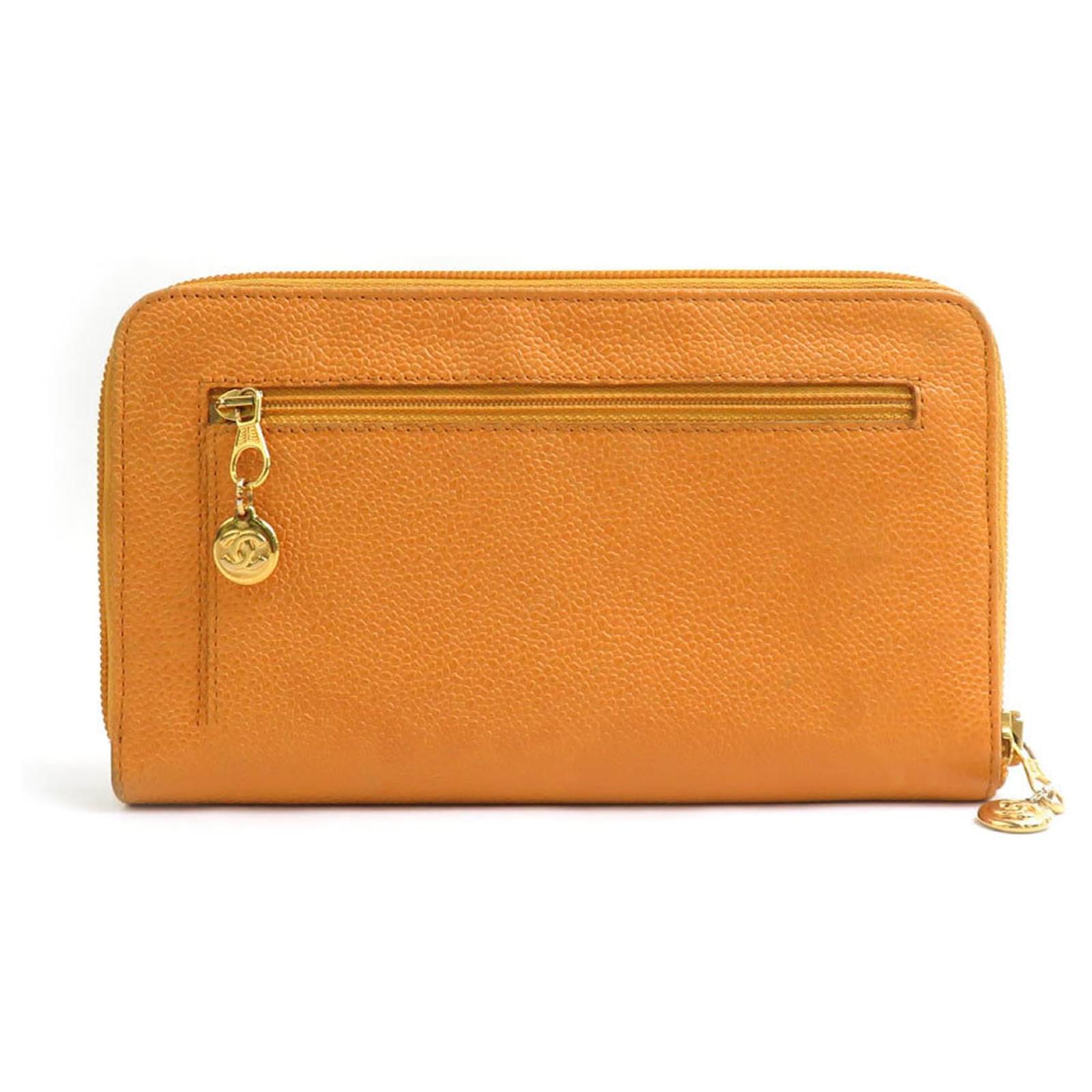 This Chanel long wallet features a bi-fold design crafted from embossed grained calfskin leather in a vibrant orange hue. Measuring 12cm x 20cm x 1.5cm, it is both stylish and functional. The wallet is made in Italy and is classified as used, with a condition ranking of AB, indicating it shows slight traces of usage, including minor scratches and dirt. There is also slight discoloration on the hardware. Please refer to the images for a detailed view of the item’s condition. No additional accessories are included with this wallet.