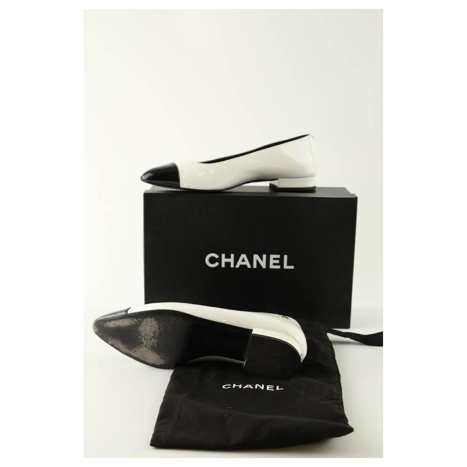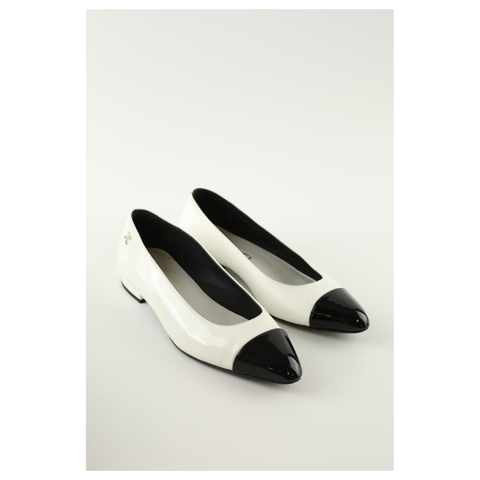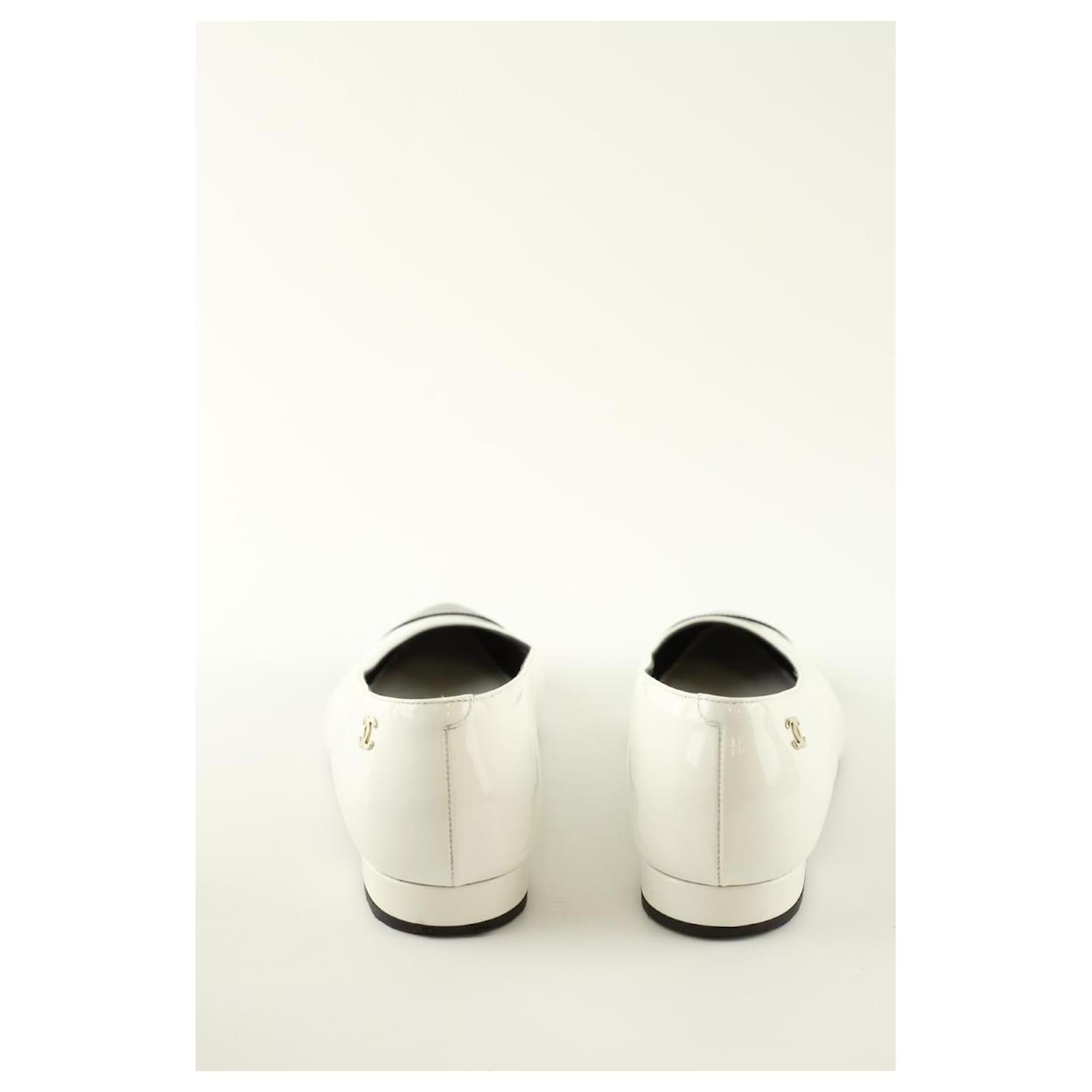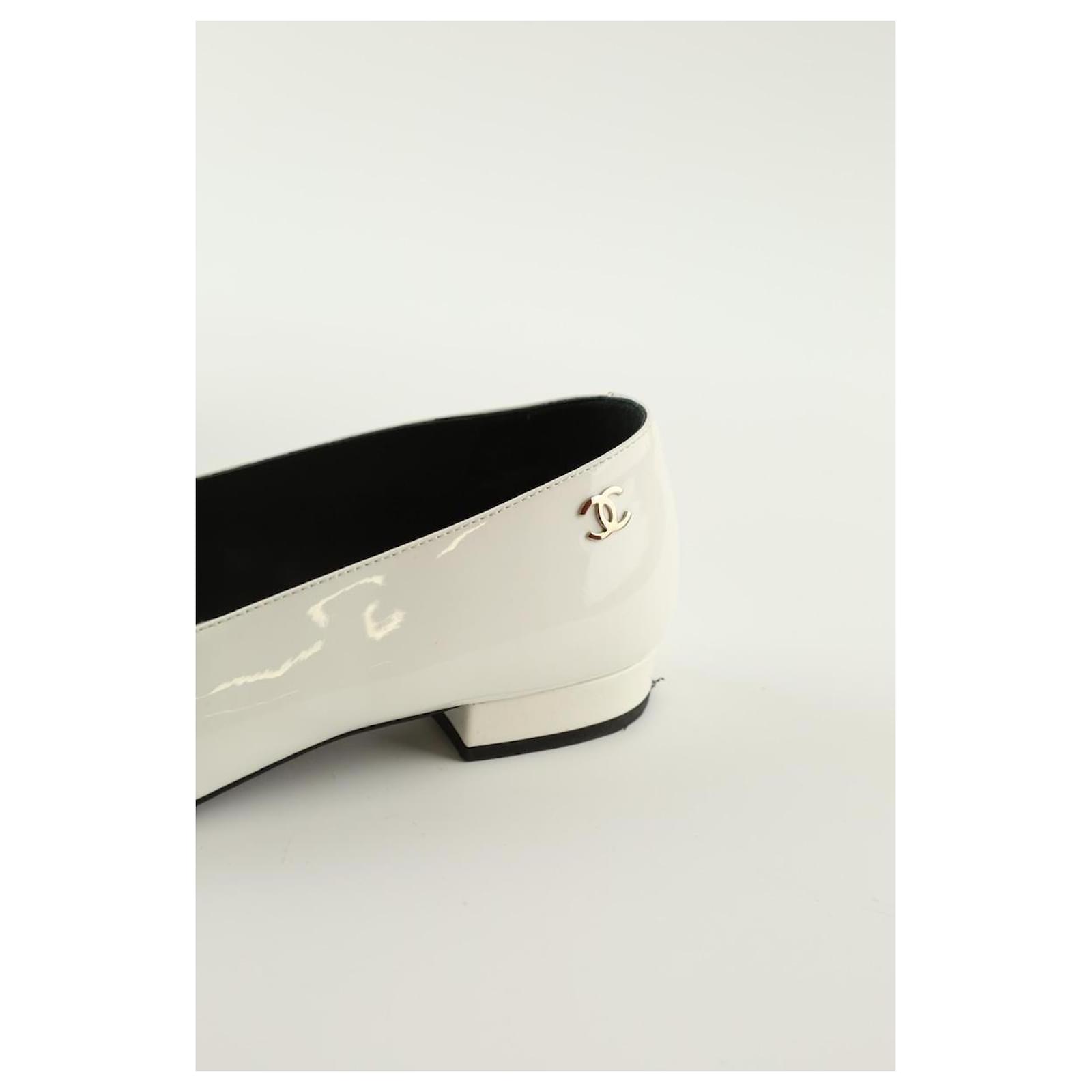 Second-hand Chanel white ballerinas. Main material patent leather. Size 37. Heel height: 2cm. With pouch. With box. Women’s collection. Very good condition. Reference: 015220038.