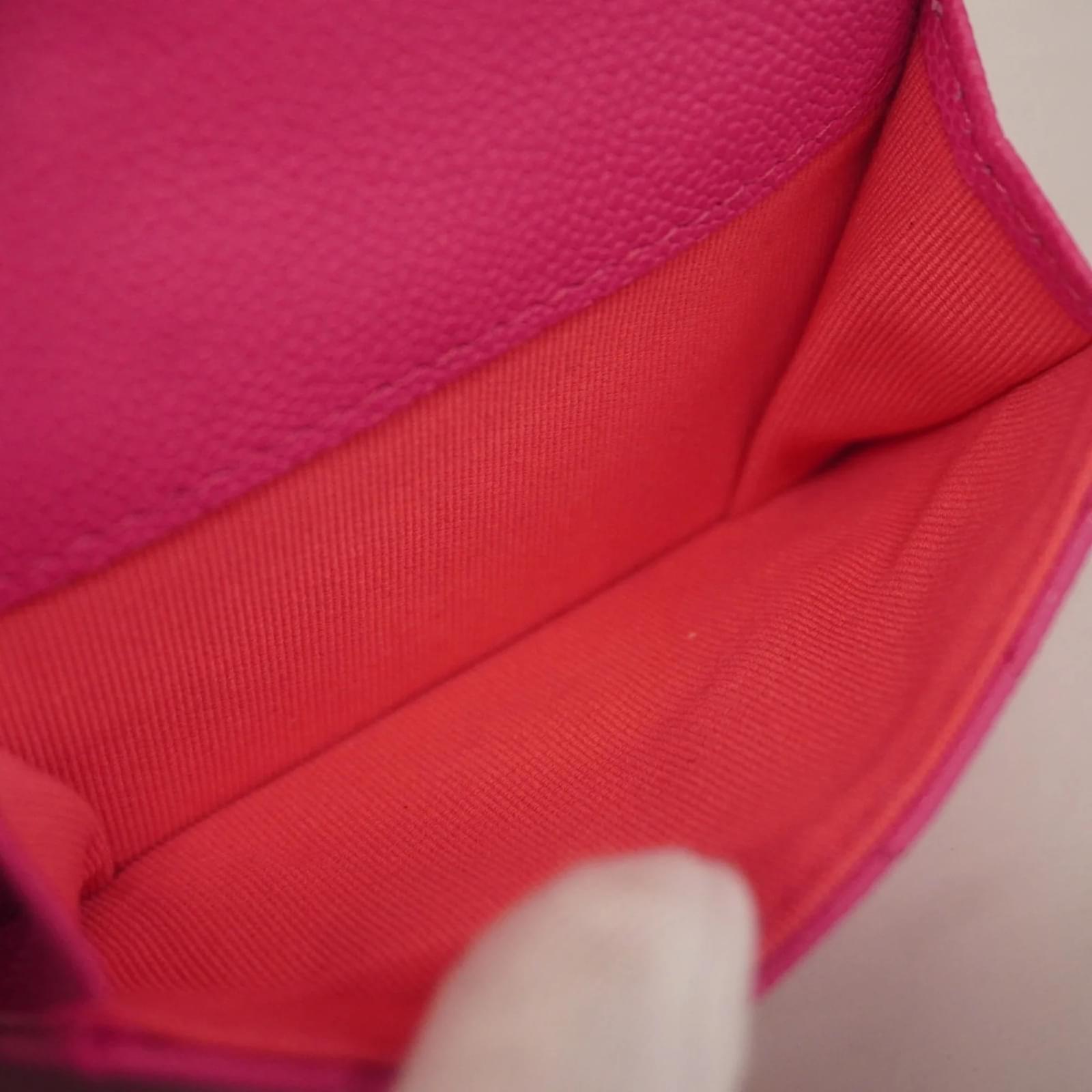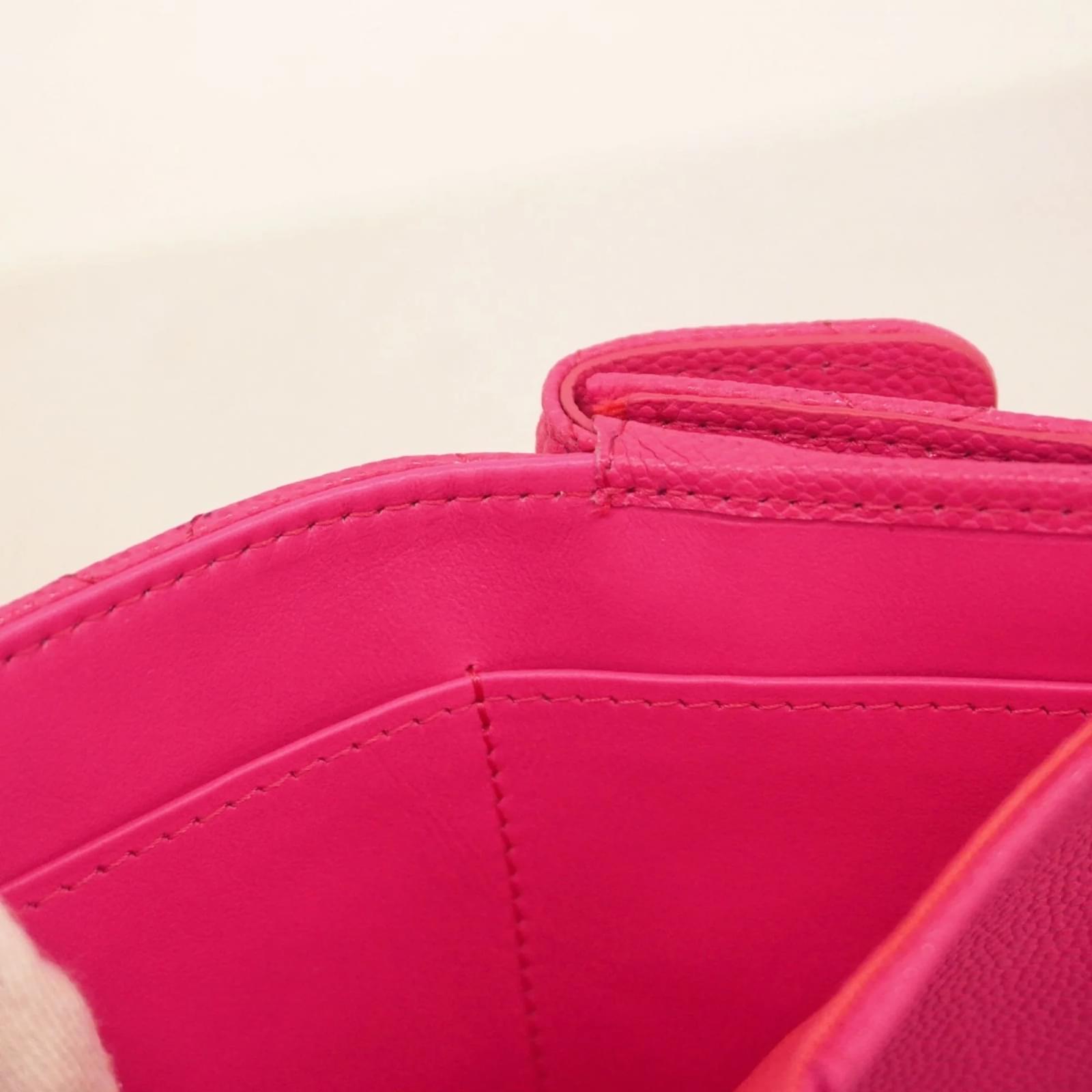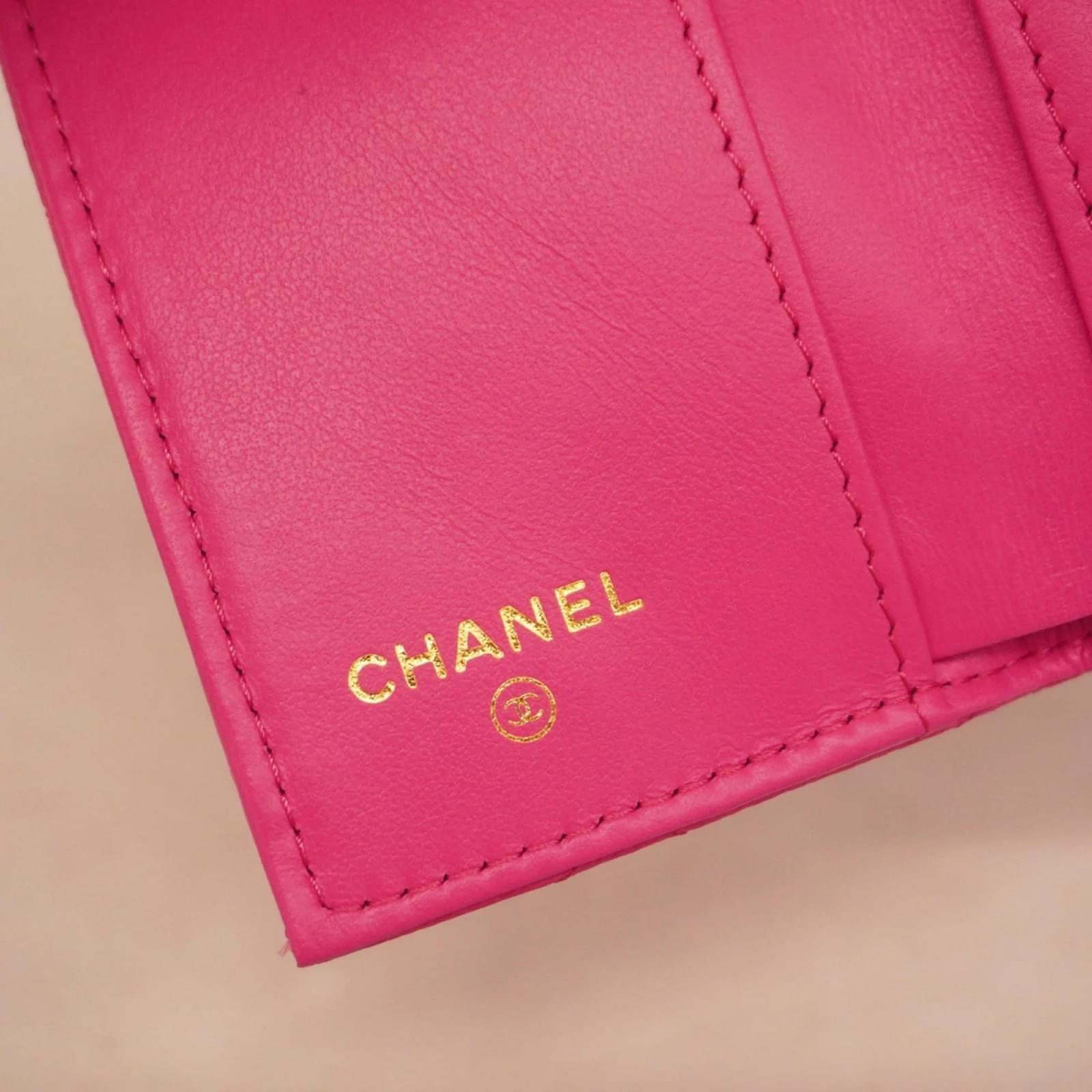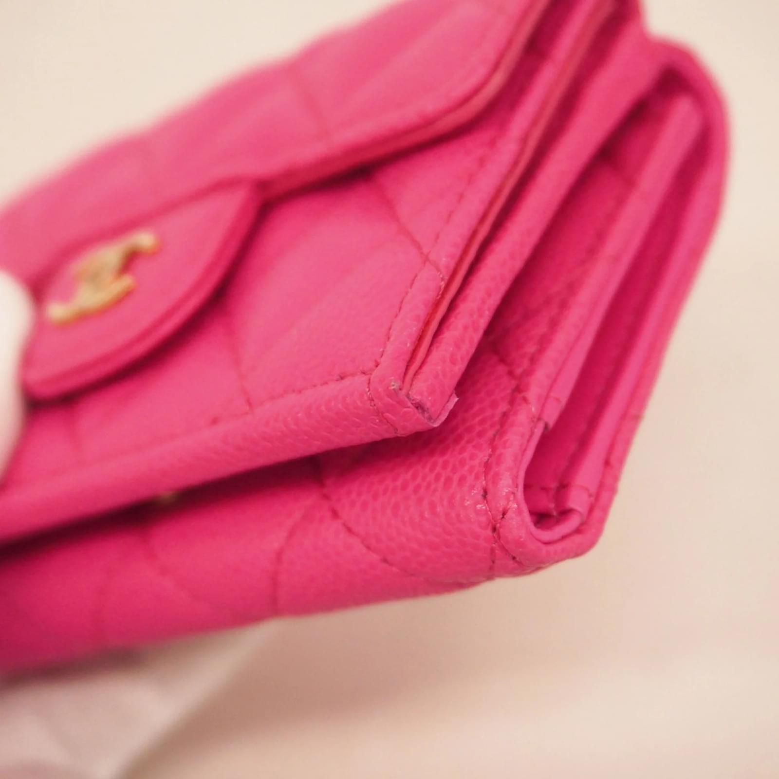This Chanel tri-fold wallet is crafted from grained calfskin in a soft pink hue, measuring 7.5cm x 10.5cm x 3.5cm. It features a classic matelassé design, making it a stylish accessory for everyday use. The wallet is in very good used condition, with minor traces of usage, including some insignificant scratches and dirt. It comes with a box and dust bag for protection. Before purchasing, it is advisable to review the images for a detailed view of the item’s condition and included accessories.