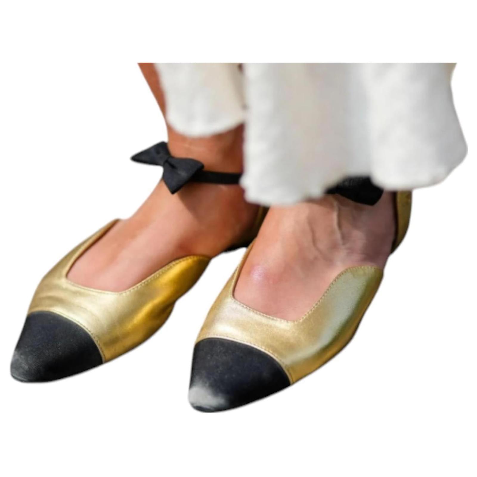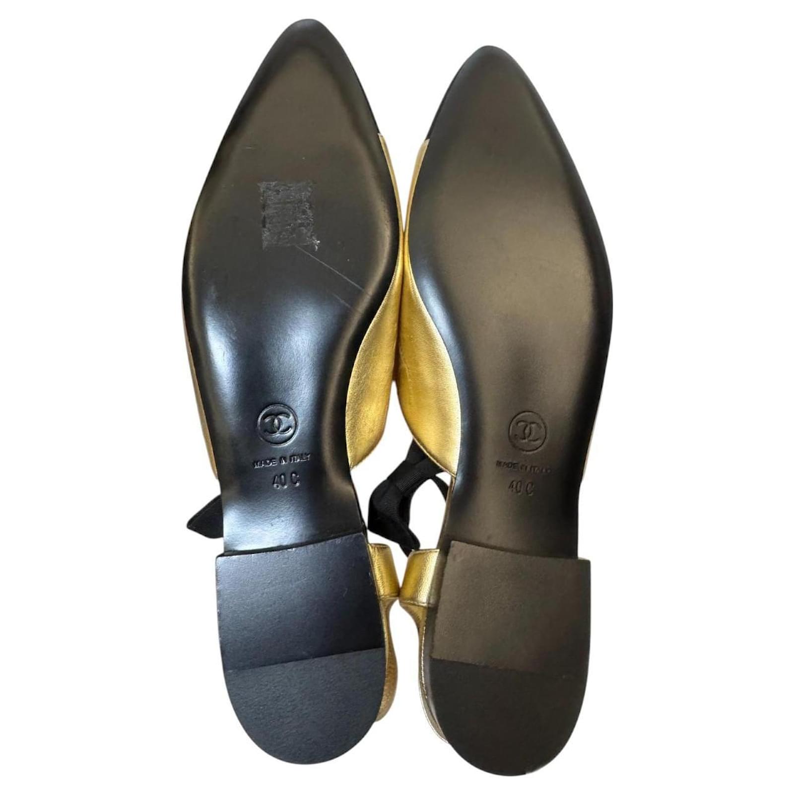 Chanel 2020 Interlocking CC Logo Slingback Flats\r\nChanel Leather Slingback Flats\r\nFrom the 2020 Collection\r\nGold & Metallic\r\nInterlocking CC Logo\r\nCanvas Trim\r\nSemi-Pointed Toes with Bow Accents\r\nElasticized Straps\r\nSize eu40\r\ncondition like new