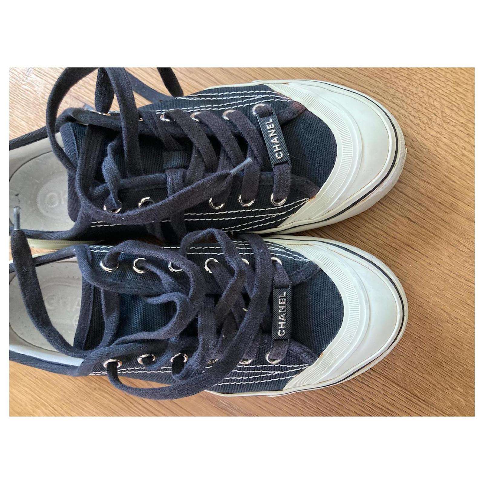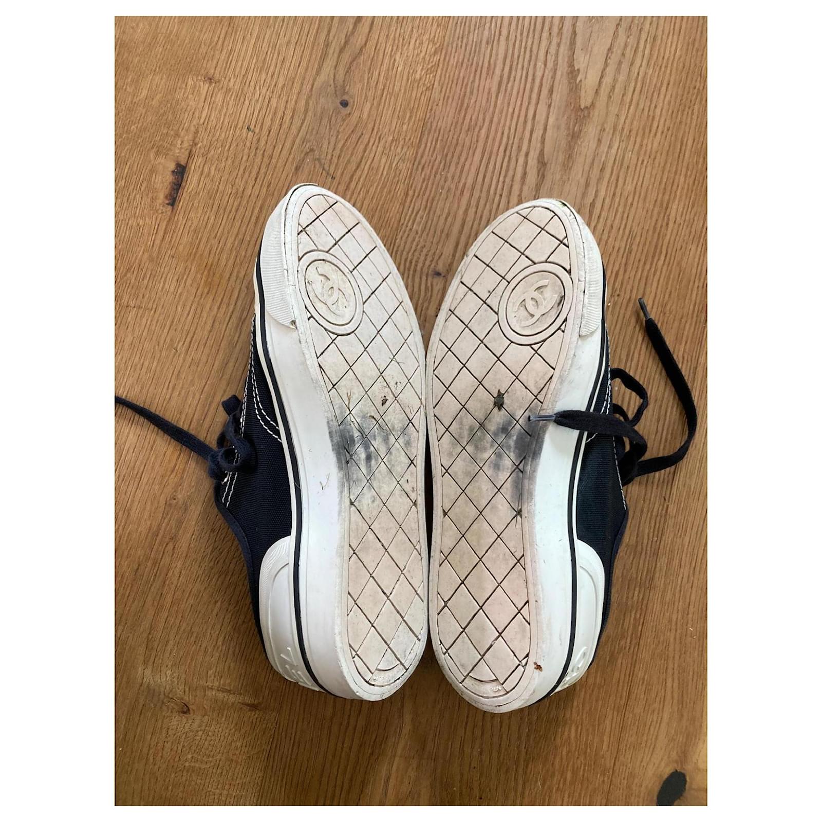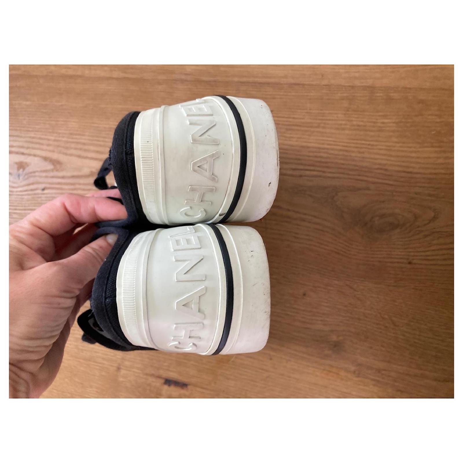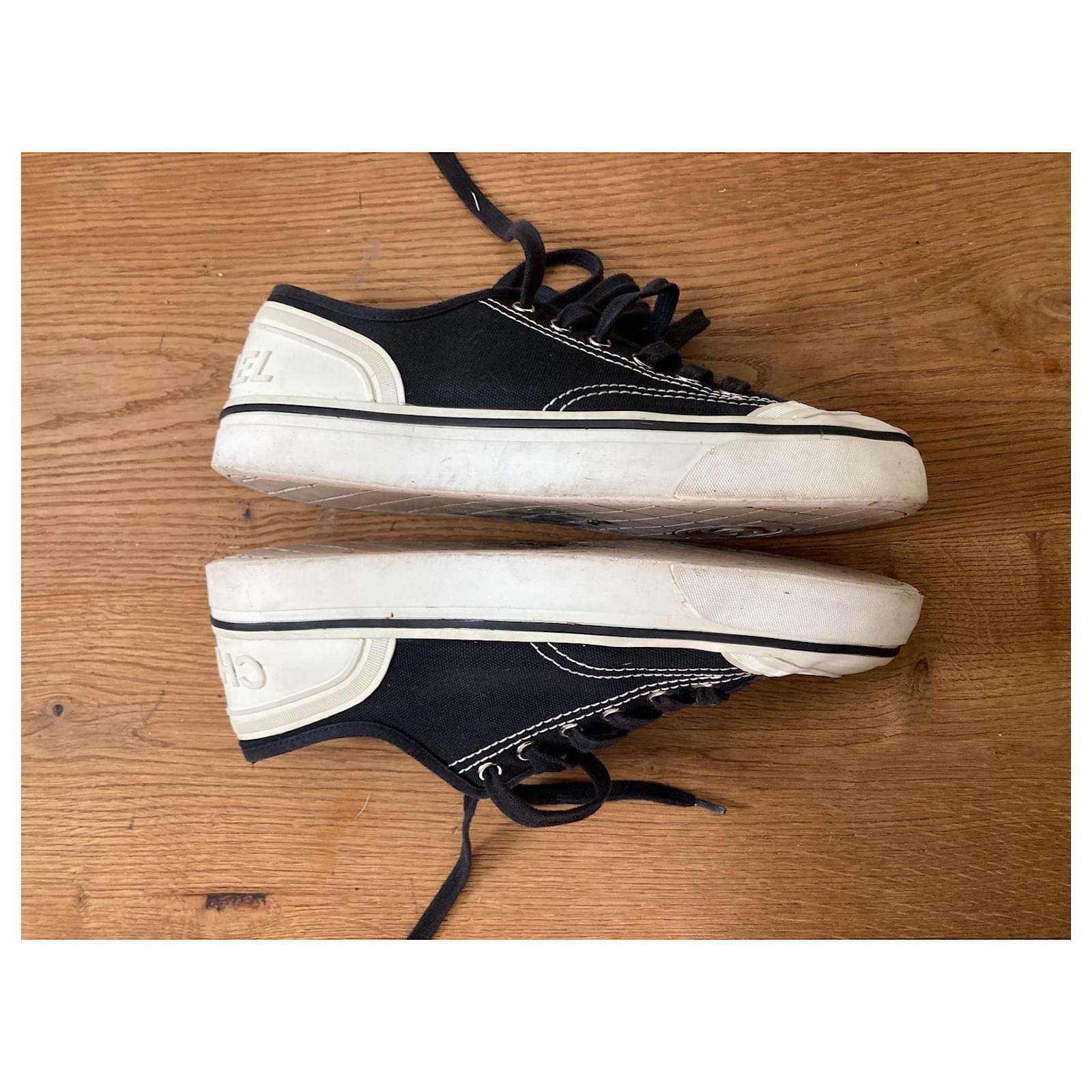 Pre-loved Chanel sneakers, size 38. Stylish black canvas with iconic logo detail. Perfect for adding a touch of luxury to your casual summer look. Signs of wear on soles, please see photos. Grab a designer bargain! Sold as is.