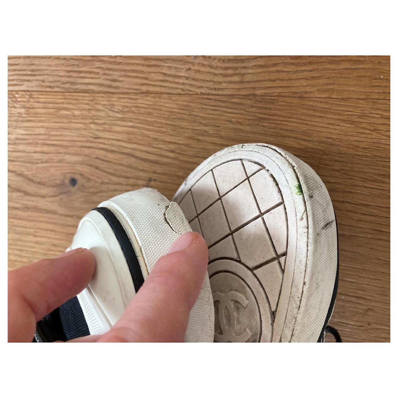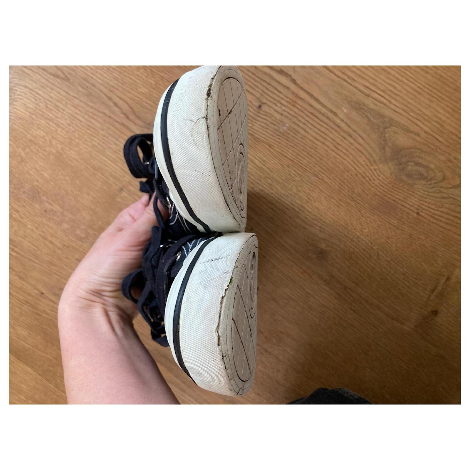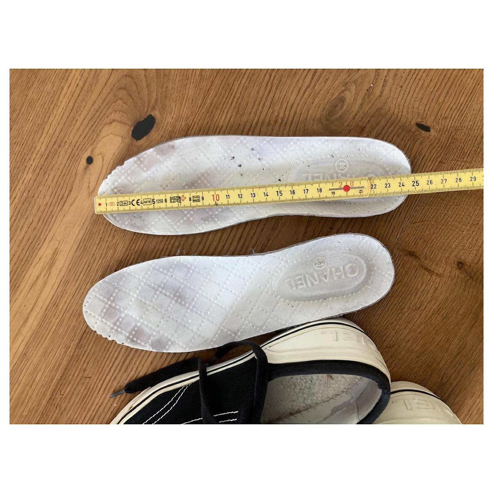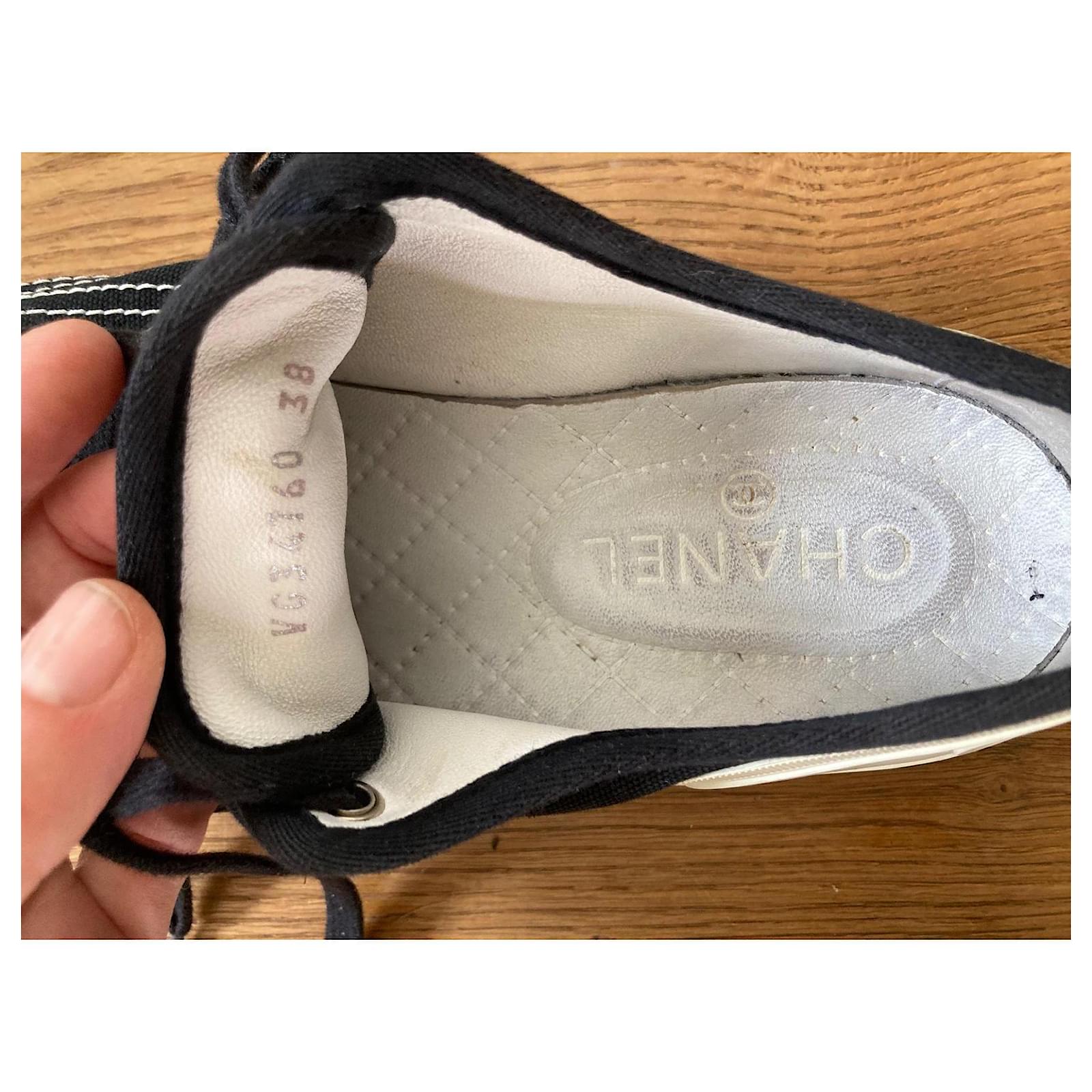 Pre-loved Chanel sneakers, size 38. Stylish black canvas with iconic logo detail. Perfect for adding a touch of luxury to your casual summer look. Signs of wear on soles, please see photos. Grab a designer bargain! Sold as is.