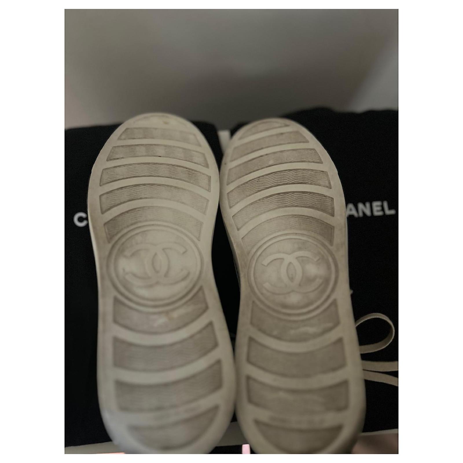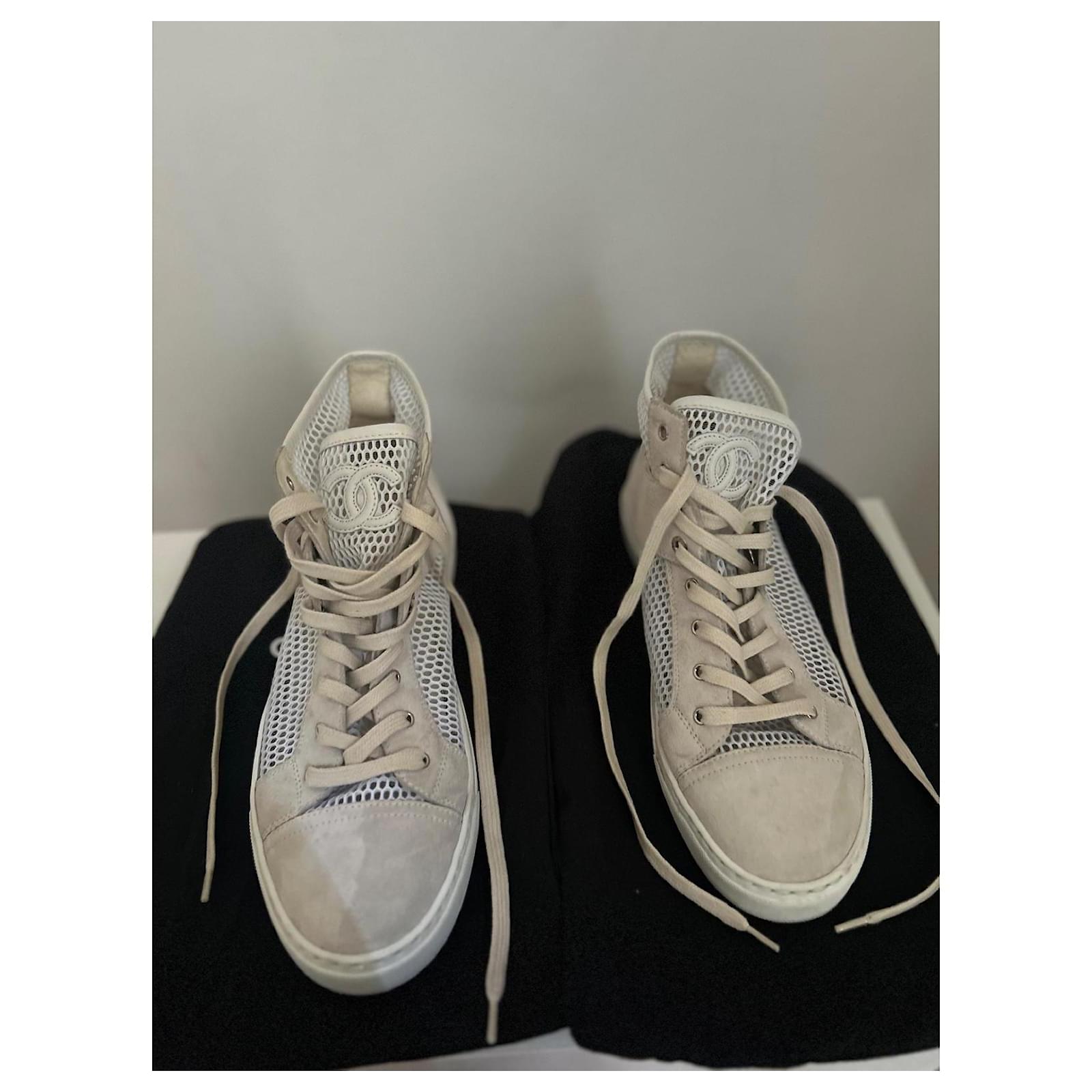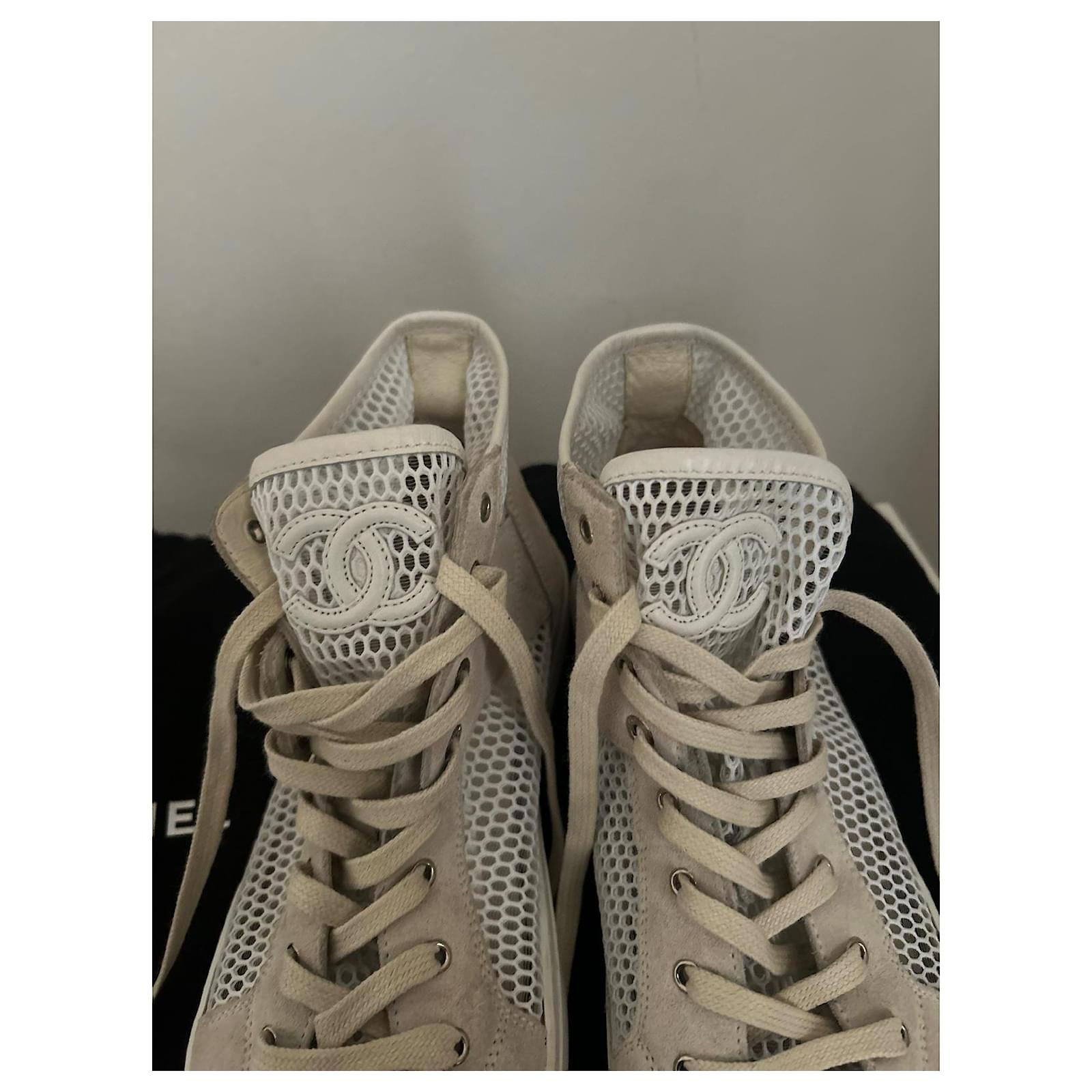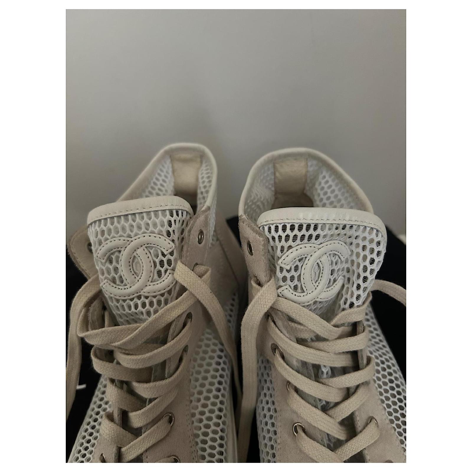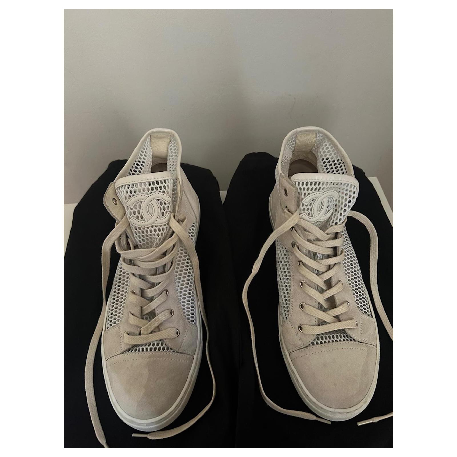 White canvas mesh Chanel sneakers with beige suede inserts.\r\nCC logo embroidered on the tongue.\r\nLightweight, breathable, and very comfortable model – ideal for spring-summer.\r\nLuxury piece, both chic and casual.