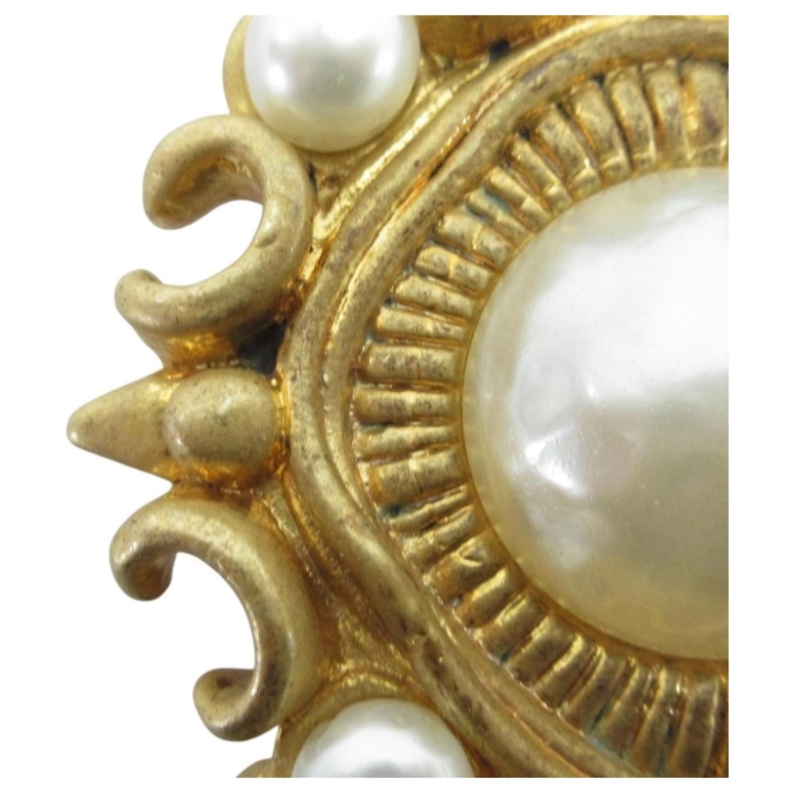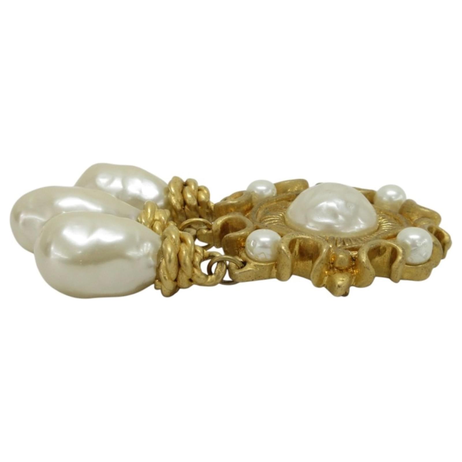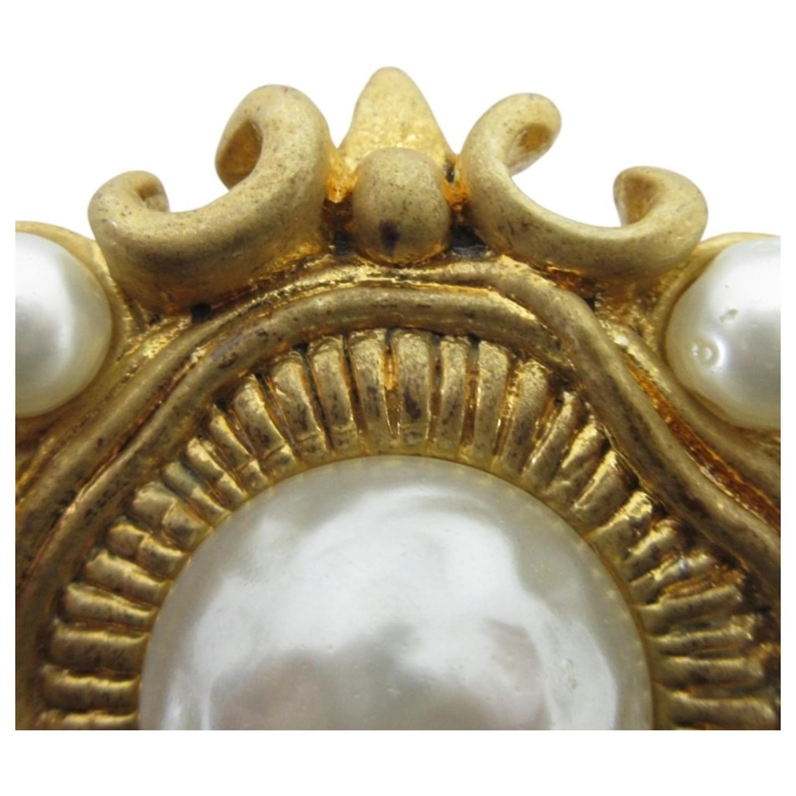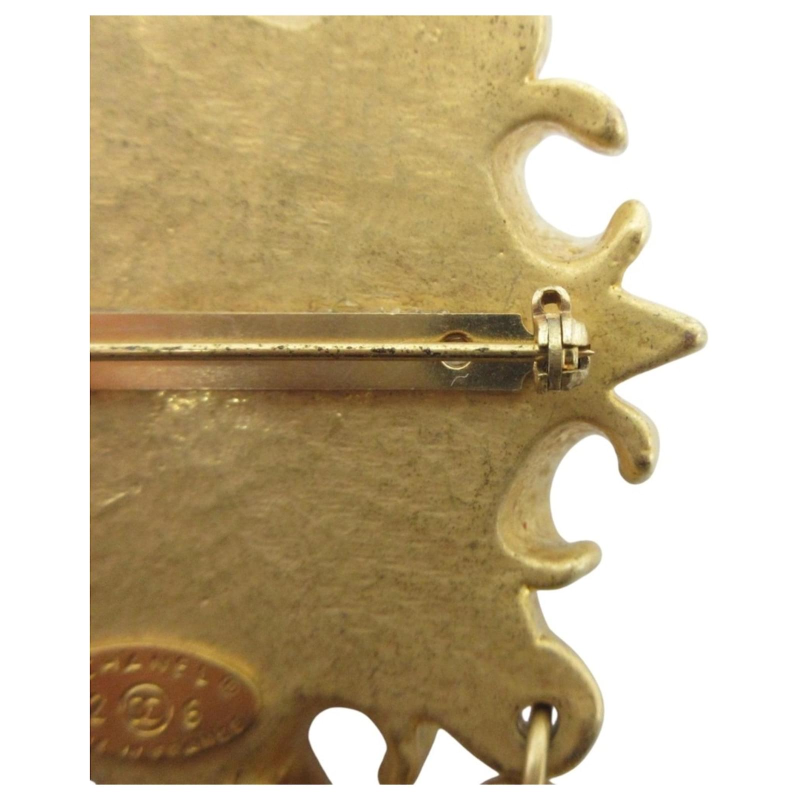 This Chanel brooch features a vintage design by Victoire de Castellane, showcasing a combination of gold and white elements. Measuring 10.5 cm by 6 cm (4.13 inches by 2.36 inches), it is a stylish accessory for ladies. The brooch is in very good used condition, classified as Rank A, with only a few traces of usage, including some insignificant scratches and dirt. There is minimal rust and peeling present. The item comes with its original box, and potential buyers are encouraged to review the images for a detailed view of its condition and included accessories.