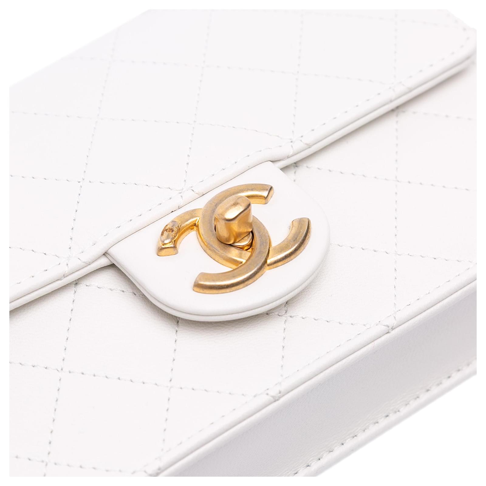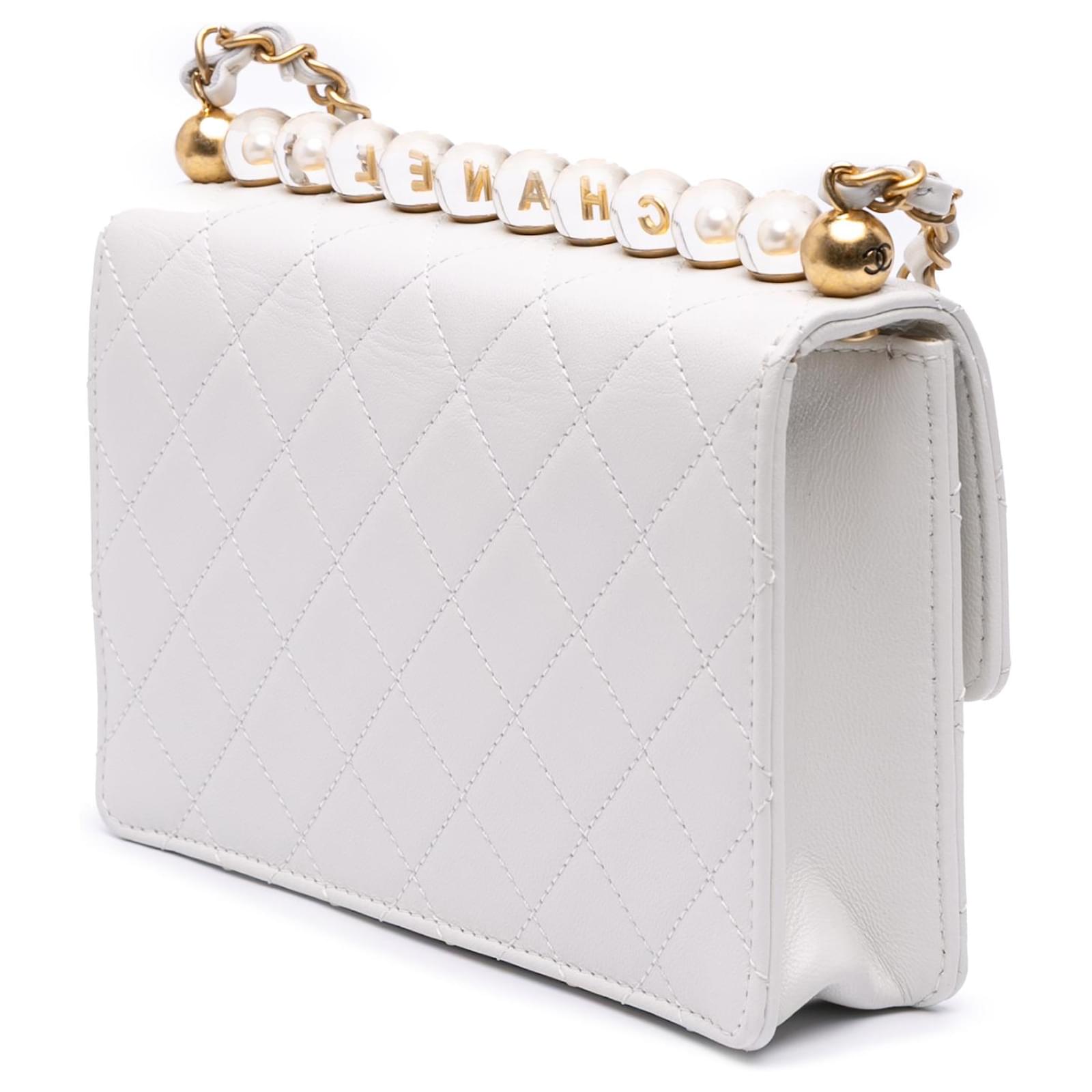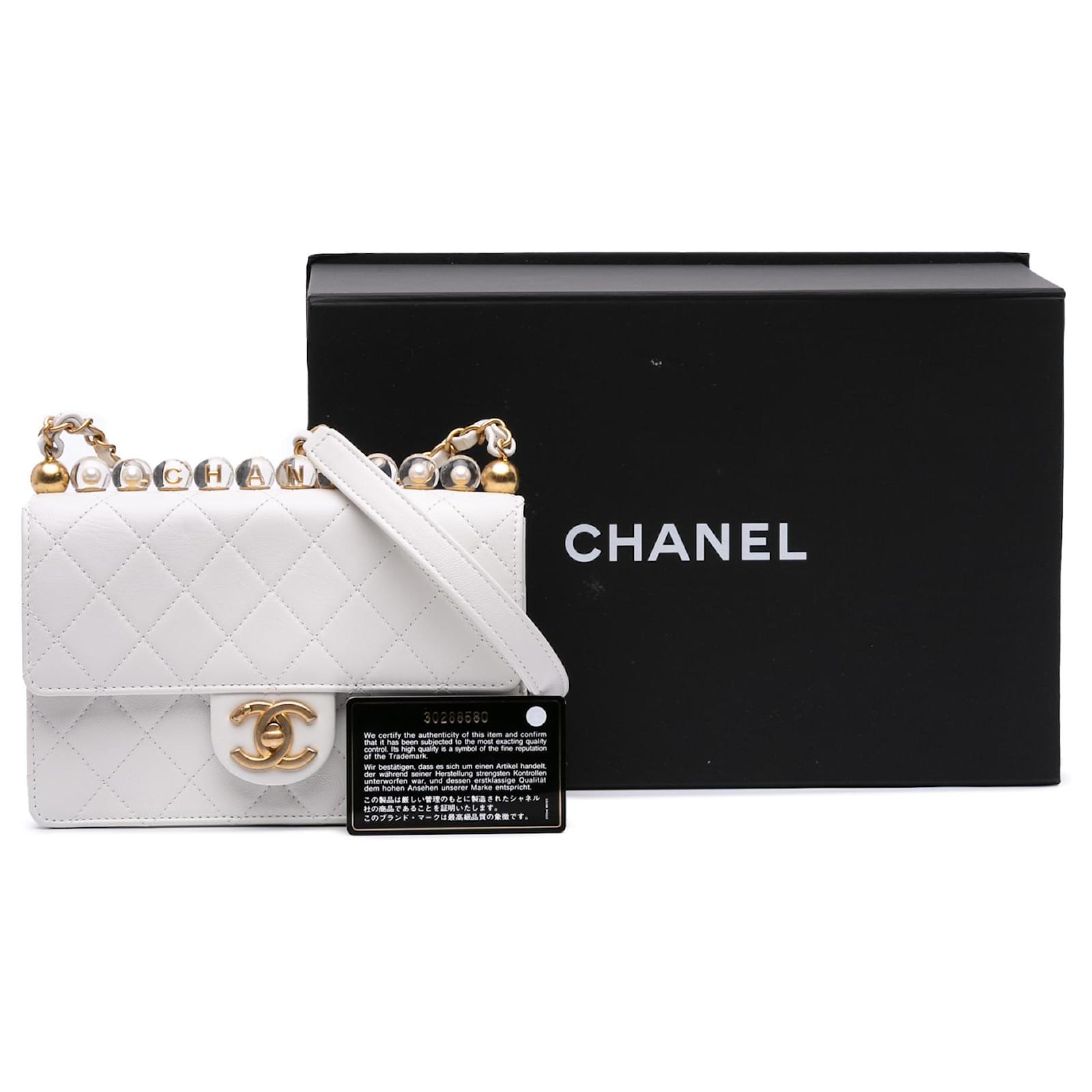 This crossbody bag features a quilted leather body with faux pearl detail, a leather woven chain strap, a front flap with a CC turn-lock closure, and interior zip and slip pockets. It carries an AB condition rating.\r\n\r\nExterior Back Creased. Exterior Bottom Creased. Lock Scratched. Exterior Front Creased. Interior Pocket Creased. Interior Lining Creased. Practical Attachment Scratched. Exterior Side Creased. \r\n\r\nDimensions: \r\nLength: 13 cm\r\nWidth: 20 cm\r\nDepth: 5 cm\r\nShoulder Drop: 57\r\n\r\nInclusions: Box, Authenticity Card\r\n\r\nColor: White\r\n\r\nMaterial: Leather x Lambskin Leather\r\n\r\nCountry of Origin: Italy\r\n\r\nSerial: 30288580\r\n\r\nBoutique Reference: PJC319647F956 \r\n