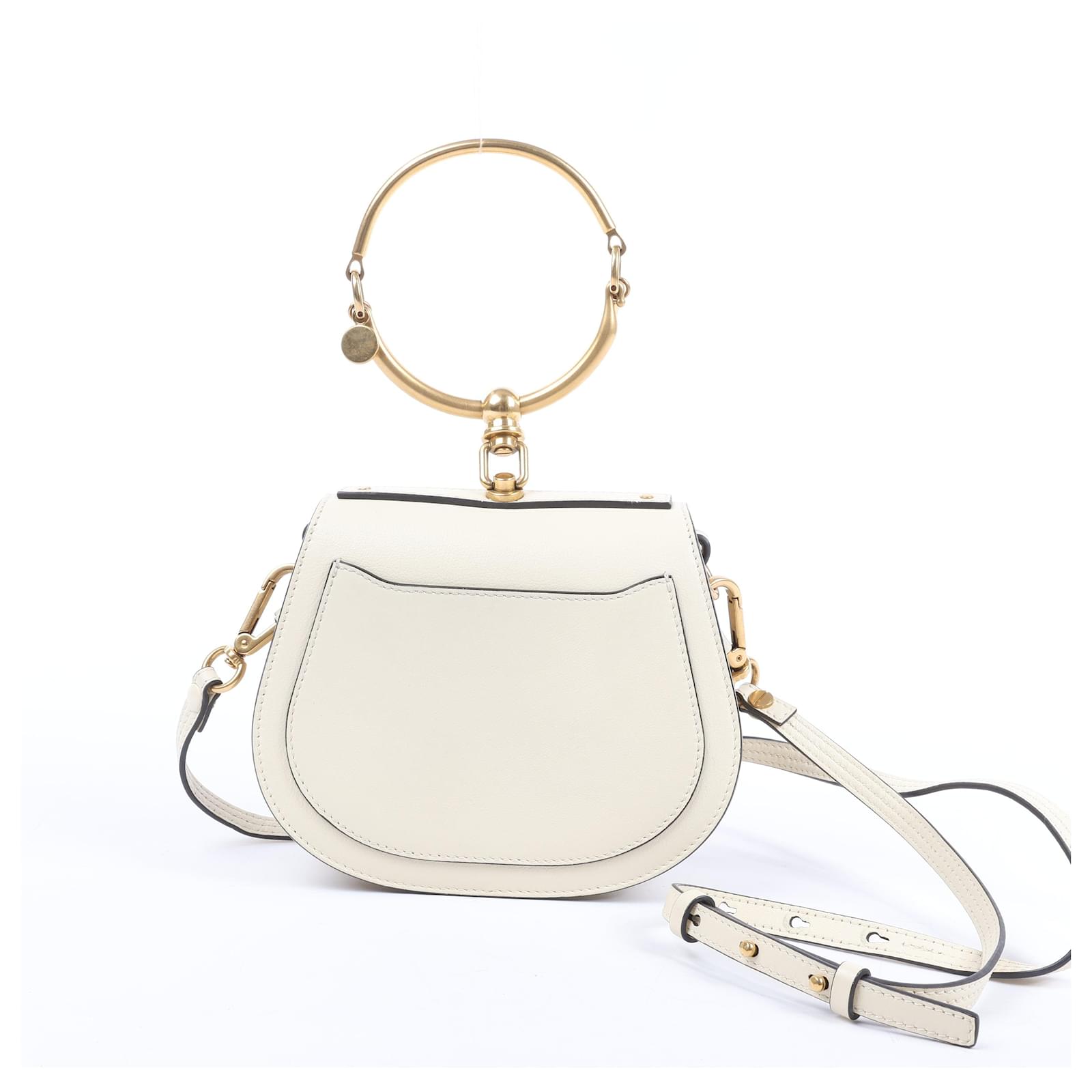 Chloé Nile Small Bracelet Bag in soft white leather, featuring a signature\ngold-tone bracelet handle and versatile 2-way wear. A chic statement piece\nblending Parisian elegance with modern edge.\nBrand: Chloe \nModel: Bracelet Nile\nSize: Small\nWidth: 16 cm\nHeight: 15 cm\nExterior Condition: Excellent\nInterior Condition: Excellent\nCondition Details: The exterior is in excellent condition, the suede part has\nrubbings and some stains. The hardware is bright and crisp, but with hairline\nscratches, inner flap still has protection sticker. The strap is clean, but with\ncreases. The interior is in very good condition.\nColour: Ecru\nInterior Colour: Beige\nHardware Colour: Gold\nMaterial: Leather, Suede\nComes With: Shoulder strap