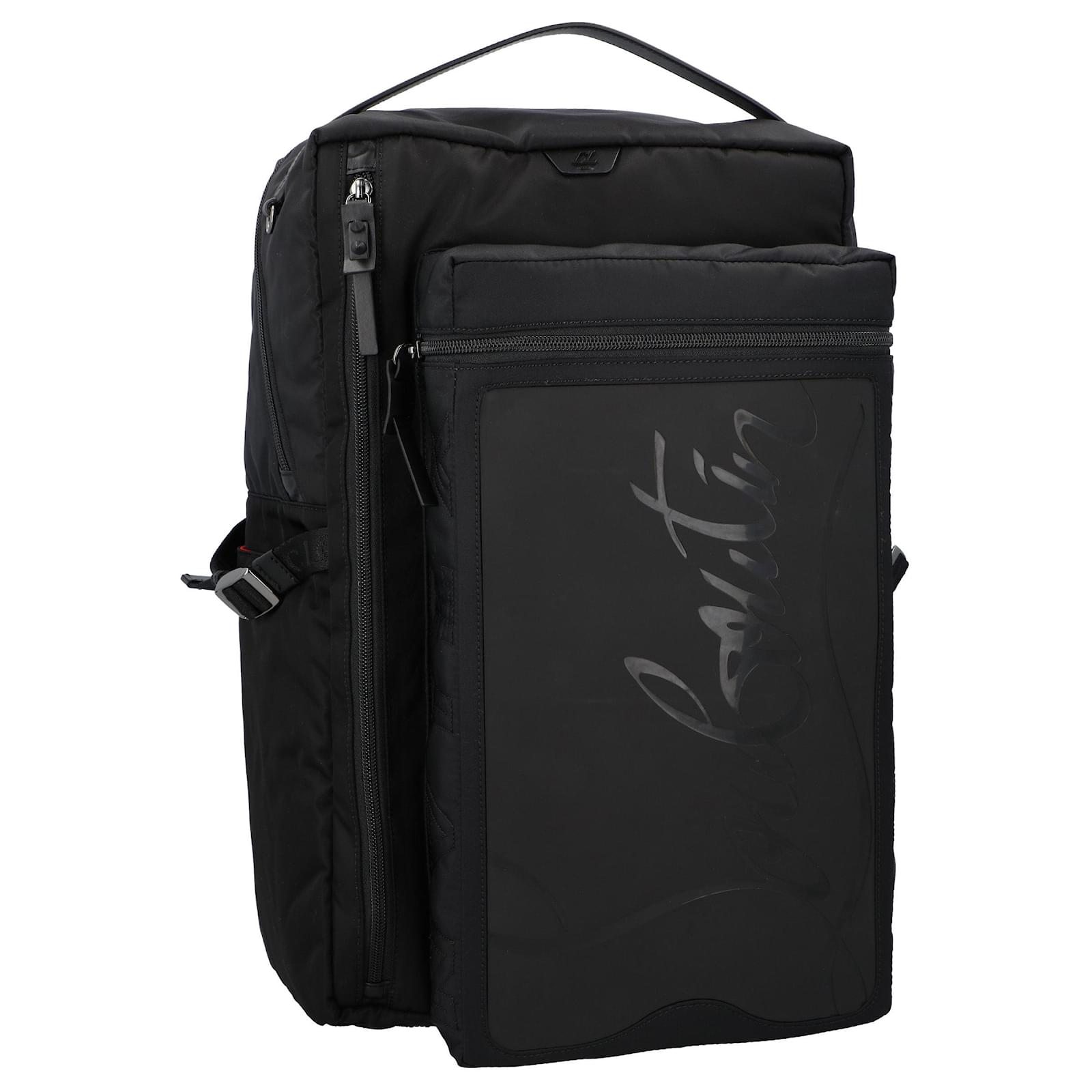 With its sporty lines, the Loubideal backpack showcases Maison Christian Louboutin’s technical prowess. It is crafted in black rubber and nylon and bears its creator’s signature on the front.\n\n- A 5 cm/2 inch handle and two shoulder straps allow it to be carried by hand or over the shoulder\n- Zip closure\n- 2 main compartments\n- 1 zipped pocket\n- 2 bottle pockets on the sides\n\nDimensions: H 42 x L 27 x W 20 cm\nColor : Black\nMaterial : RubberMeasurments: width: 200 mm length: 270 mm height: 420 mm handle drop: 50 mm \n Product Id: 416286 \n