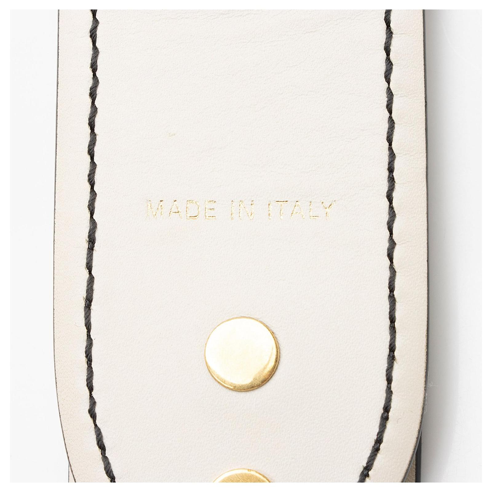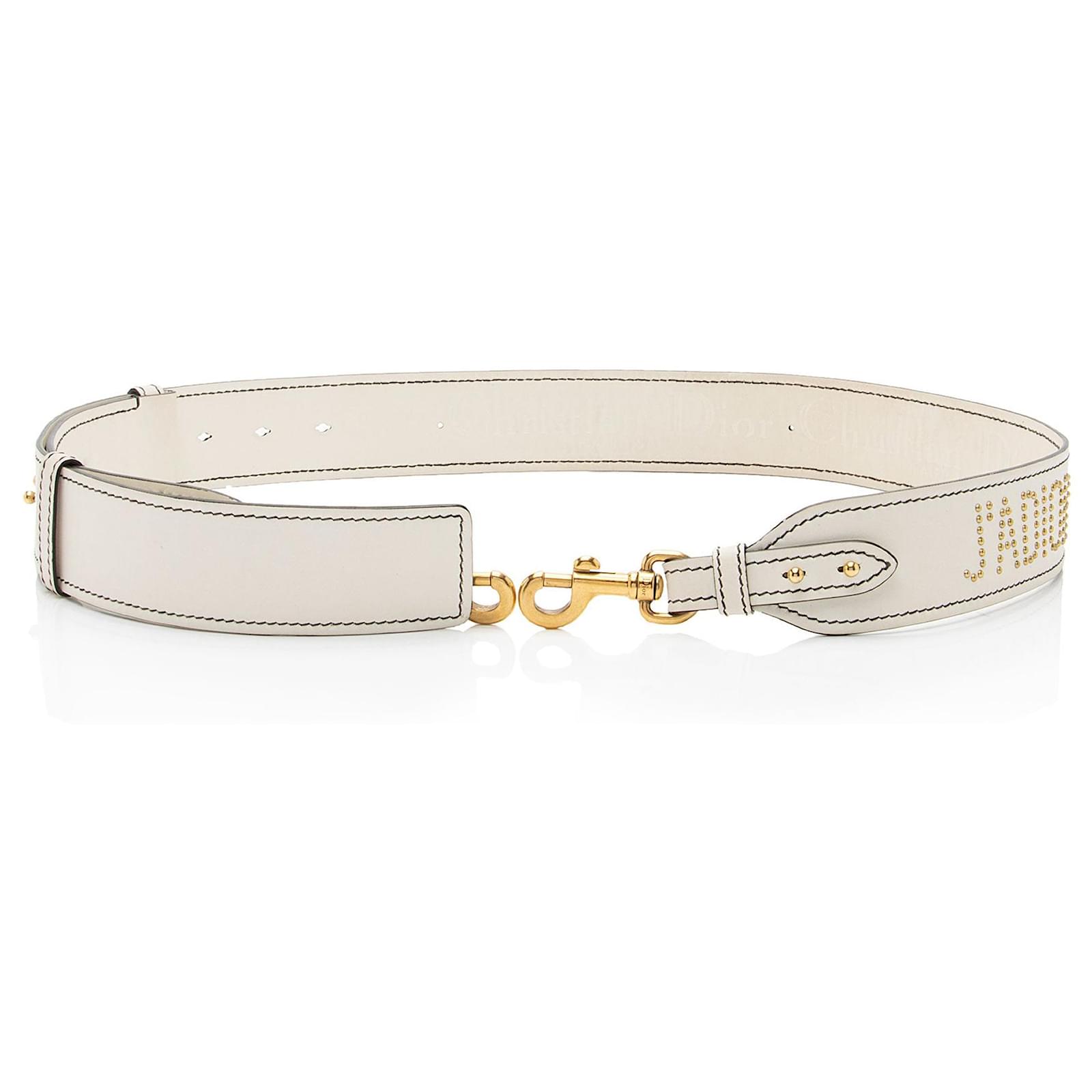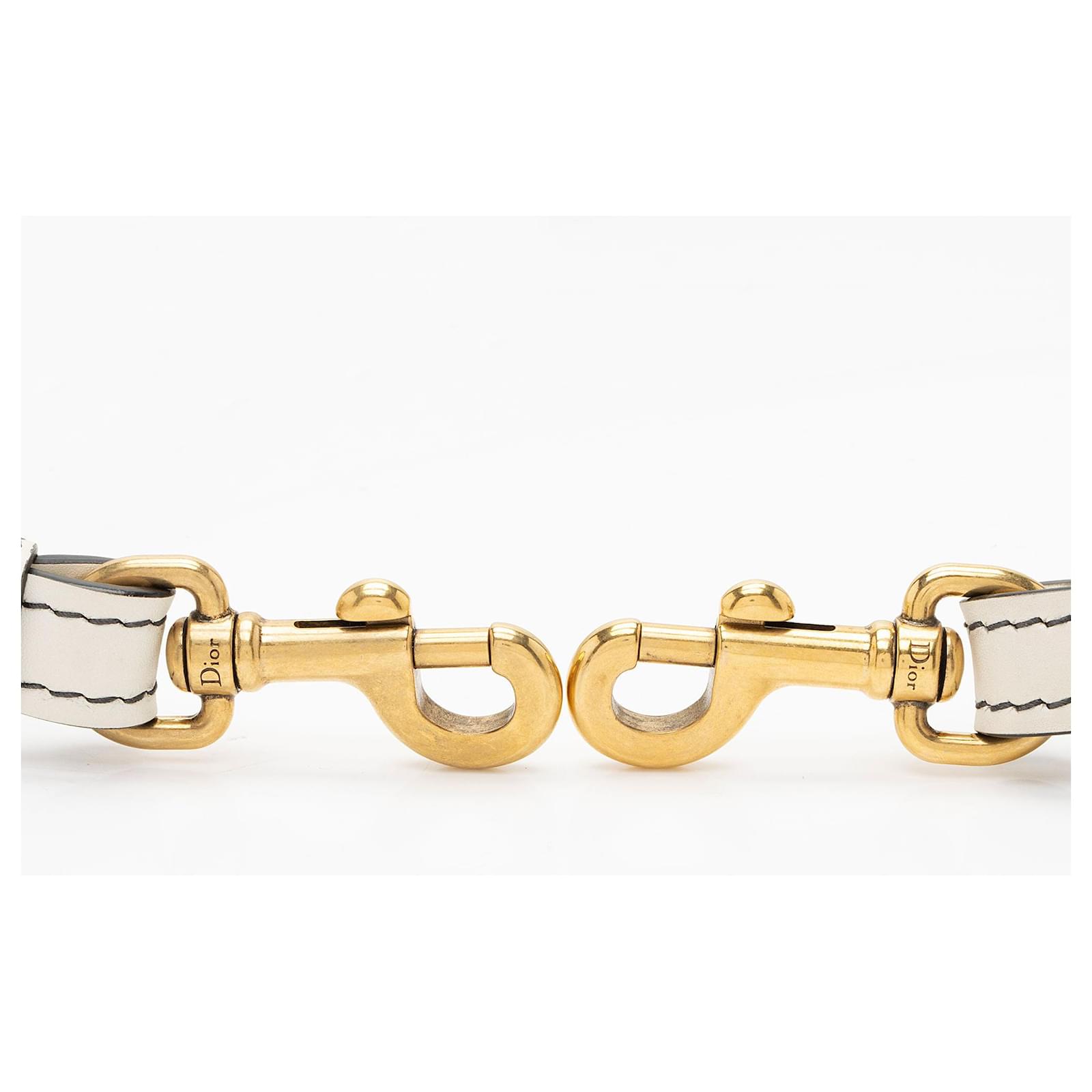 Launched in 1946, Christian Dior ushered in the ‘New Look’, raising hemlines and creating a silhouette so feminine it took the fashion world by storm. Under the first female Creative Director, Maria Grazia Chiuri (2016), Dior’s designs embrace women empowerment by redesigning femininity to be both feminine and feminist. This trend-setting label continues to set the standard for Haute Couture around the world, with scions of the industry at the helm such as Yves Saint Laurent, John Galliano, and Raf Simons.Condition Notes: Light creasing and minor marks throughout. Light surface scratches to hardware.Width: 2\”Depth: .25\”Length: 45\”, AdjustableType of Material: LeatherColor: WhiteHardware: Gold ToneClosure: Snap HookOrigin: Italy Measurments: width: 50 mm length: 1143 mm \n Product Id: 510815 \n