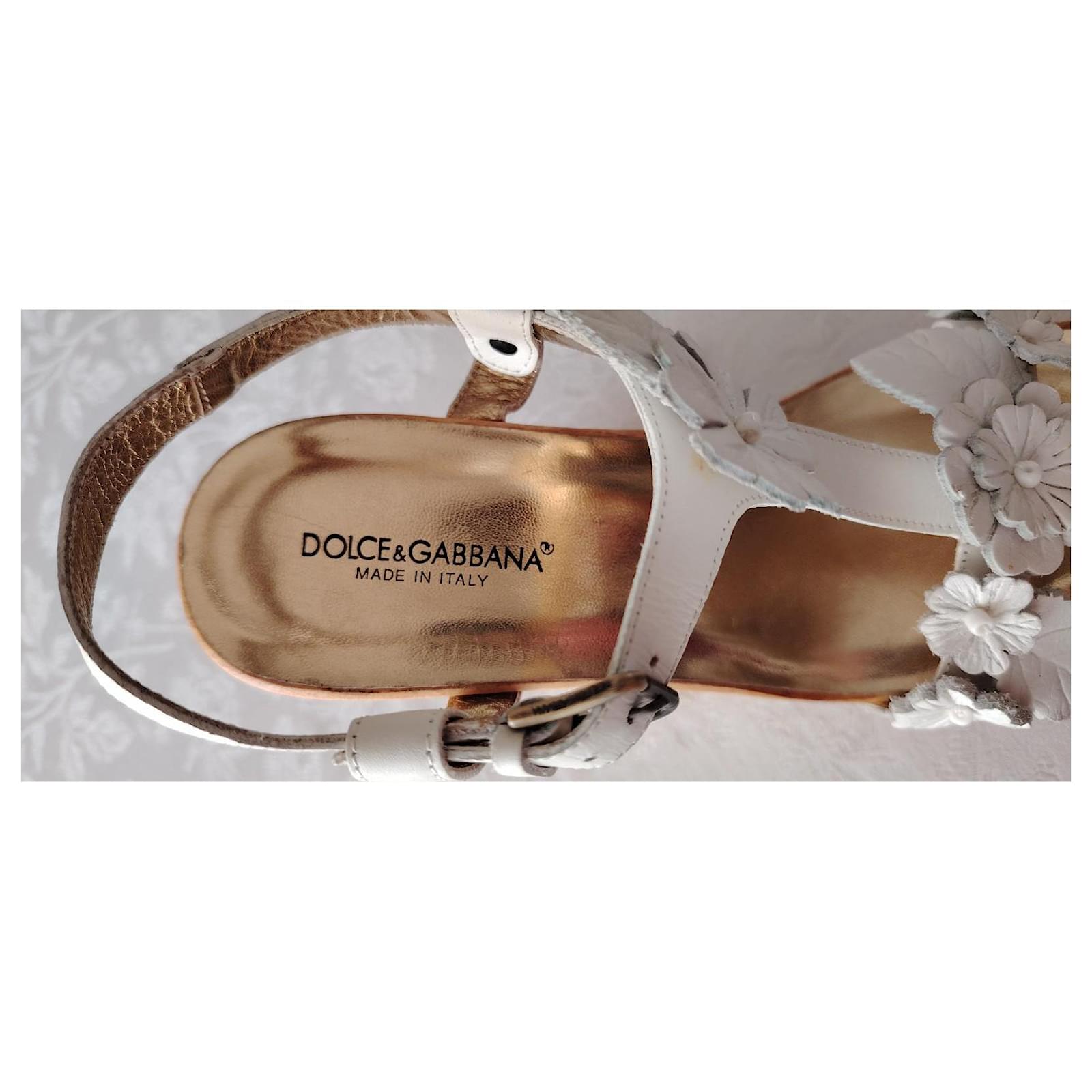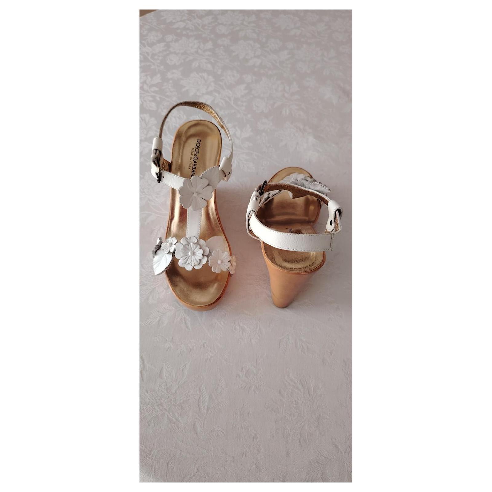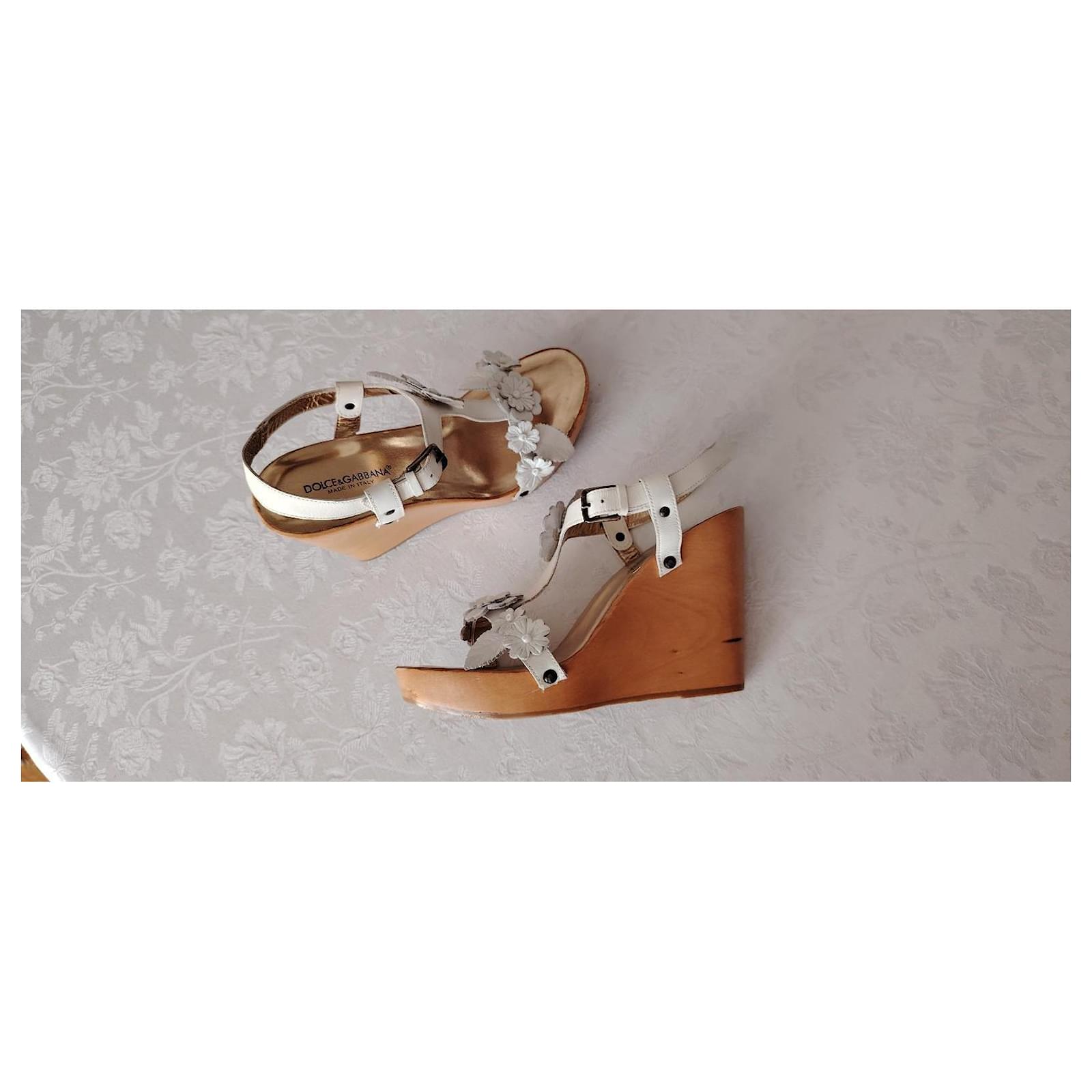 Symbol of craftsmanship and attention to detail, the wedge is made of wood and features the DG logo created with high-frequency technique that gives it three-dimensionality and volume.\nDetails:\nWooden wedge sandal,\nAdjustable strap,\nLeather band embellished with floral applications,\nGolden kid leather insole with embossed logo,\nRubber sole,\nSize: 37.5 (IT),\nDimensions:\nSole length: 24 cm,\nHeel: 11 cm,\nPlatform: 2 cm,\nMade in Italy,\nCondition: NEW, never used.\nPackaging: Item comes with a branded dust bag.