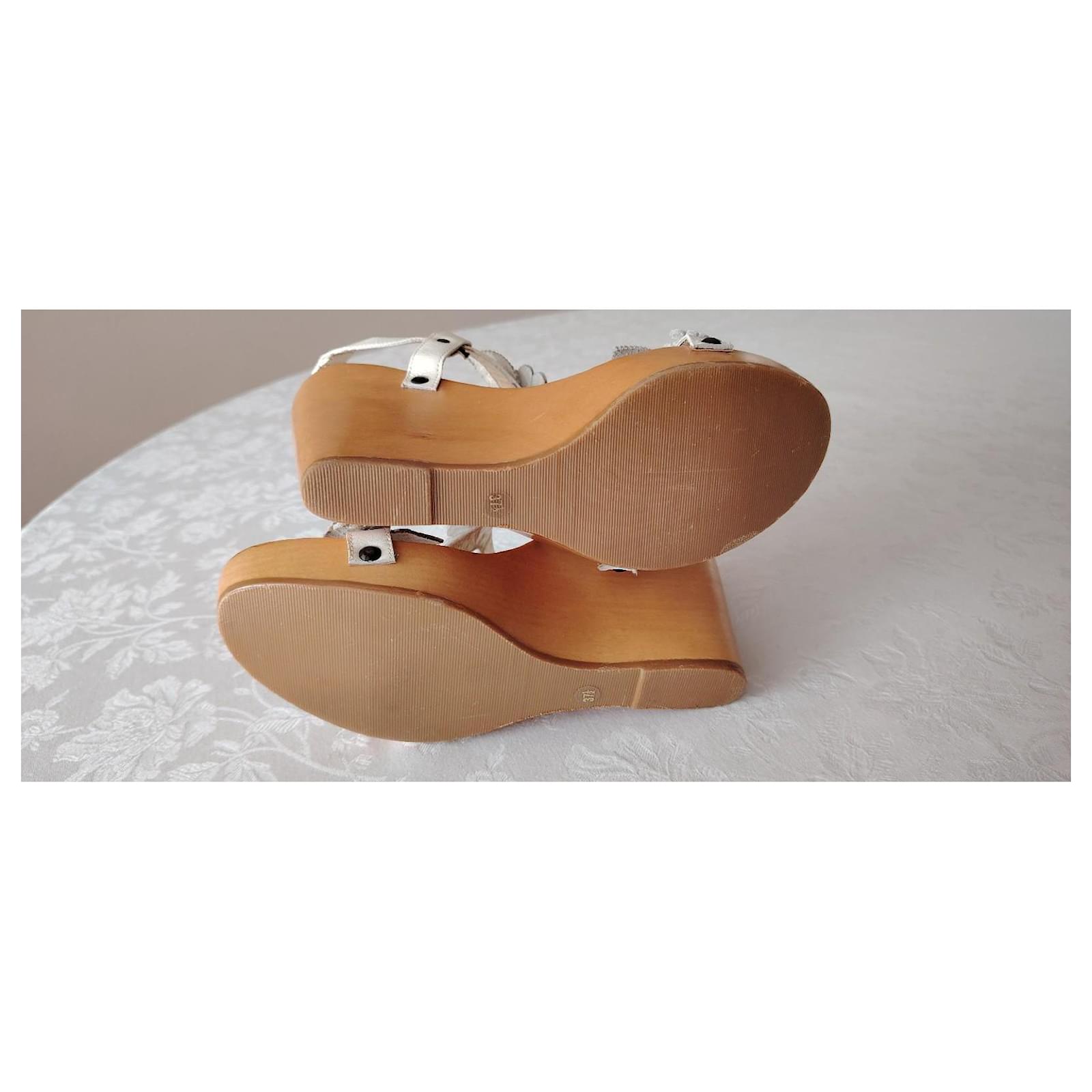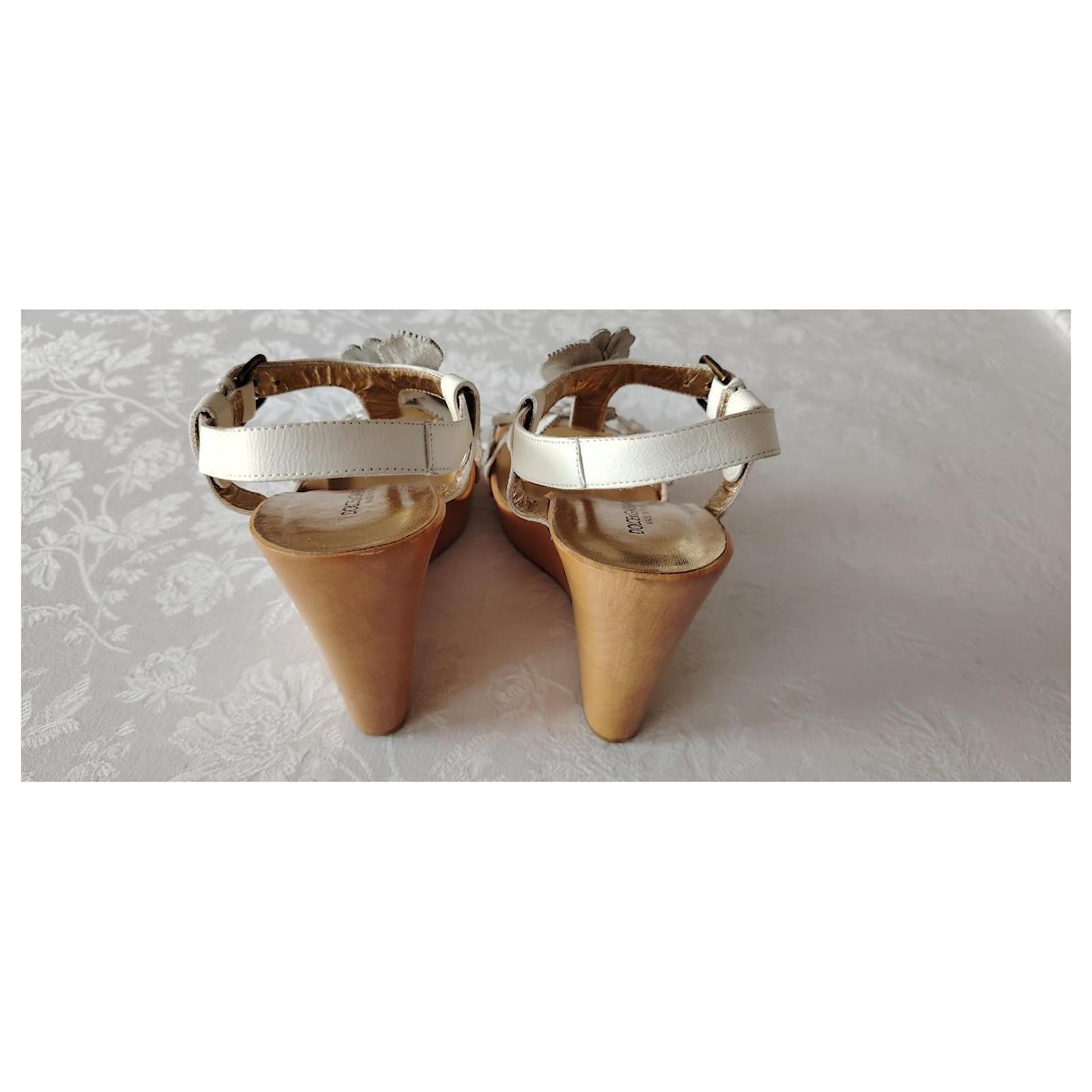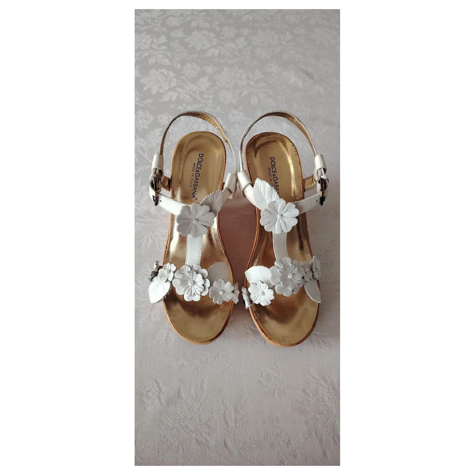 Symbol of craftsmanship and attention to detail, the wedge is made of wood and features the DG logo created with high-frequency technique that gives it three-dimensionality and volume.\nDetails:\nWooden wedge sandal,\nAdjustable strap,\nLeather band embellished with floral applications,\nGolden kid leather insole with embossed logo,\nRubber sole,\nSize: 37.5 (IT),\nDimensions:\nSole length: 24 cm,\nHeel: 11 cm,\nPlatform: 2 cm,\nMade in Italy,\nCondition: NEW, never used.\nPackaging: Item comes with a branded dust bag.