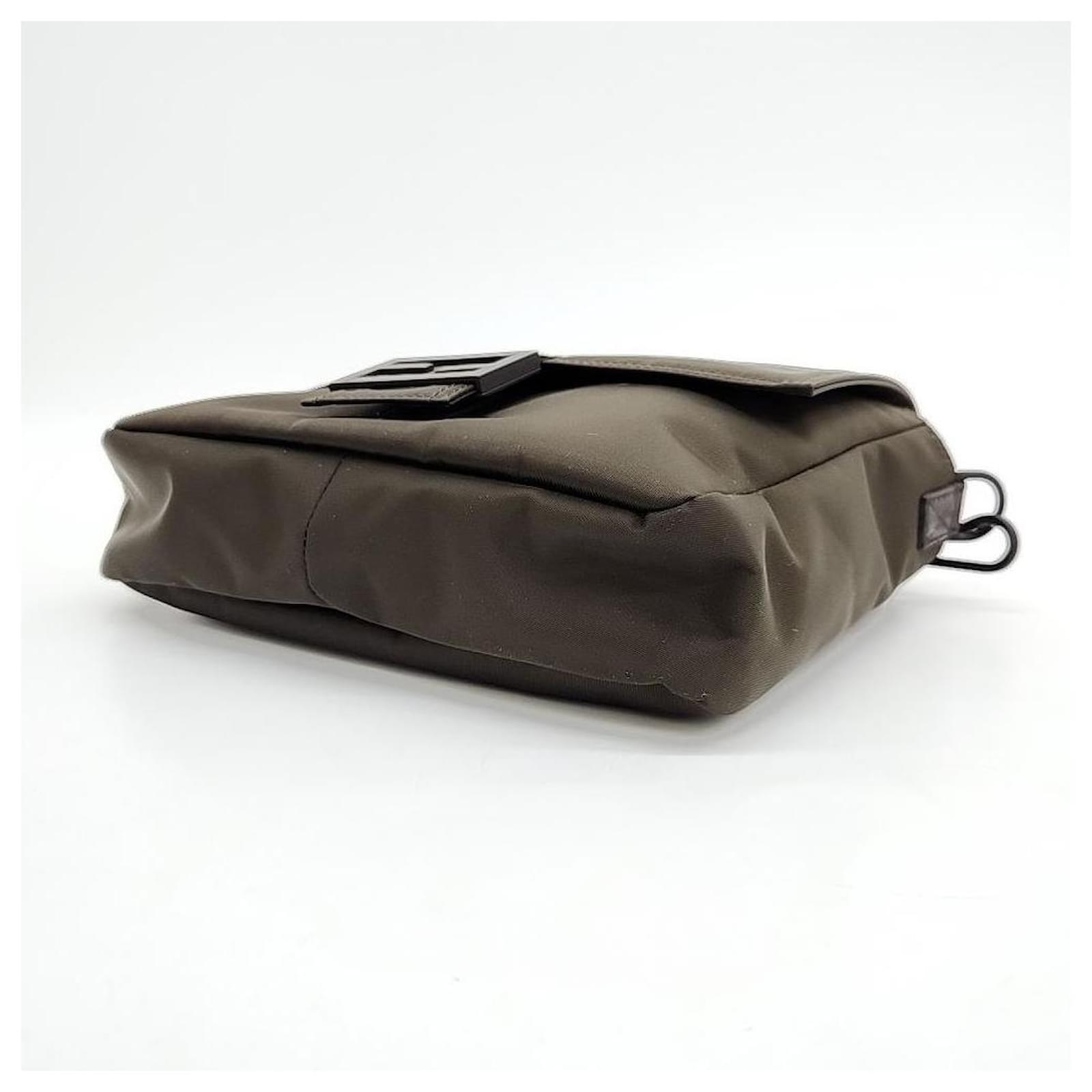 Contents: It is a cross bag made of Econyl material with a magnetic flap opening and has good storage capacity. Body – Good except for compression during storage Strap (excluding) – Good Inside – Good Edges – Good\n\nComes with Dust, Booklet & Tag\n\nCOO: ITALY\nGender: MEN\nColor: KHAKI\nDimension: 23.5cm x 21.5cm x 6cm\nCondtion: GOOD\nDesigner: FENDI Measurments: width: 60 mm length: 235 mm height: 215 mm \n Product Id: 501713 \n