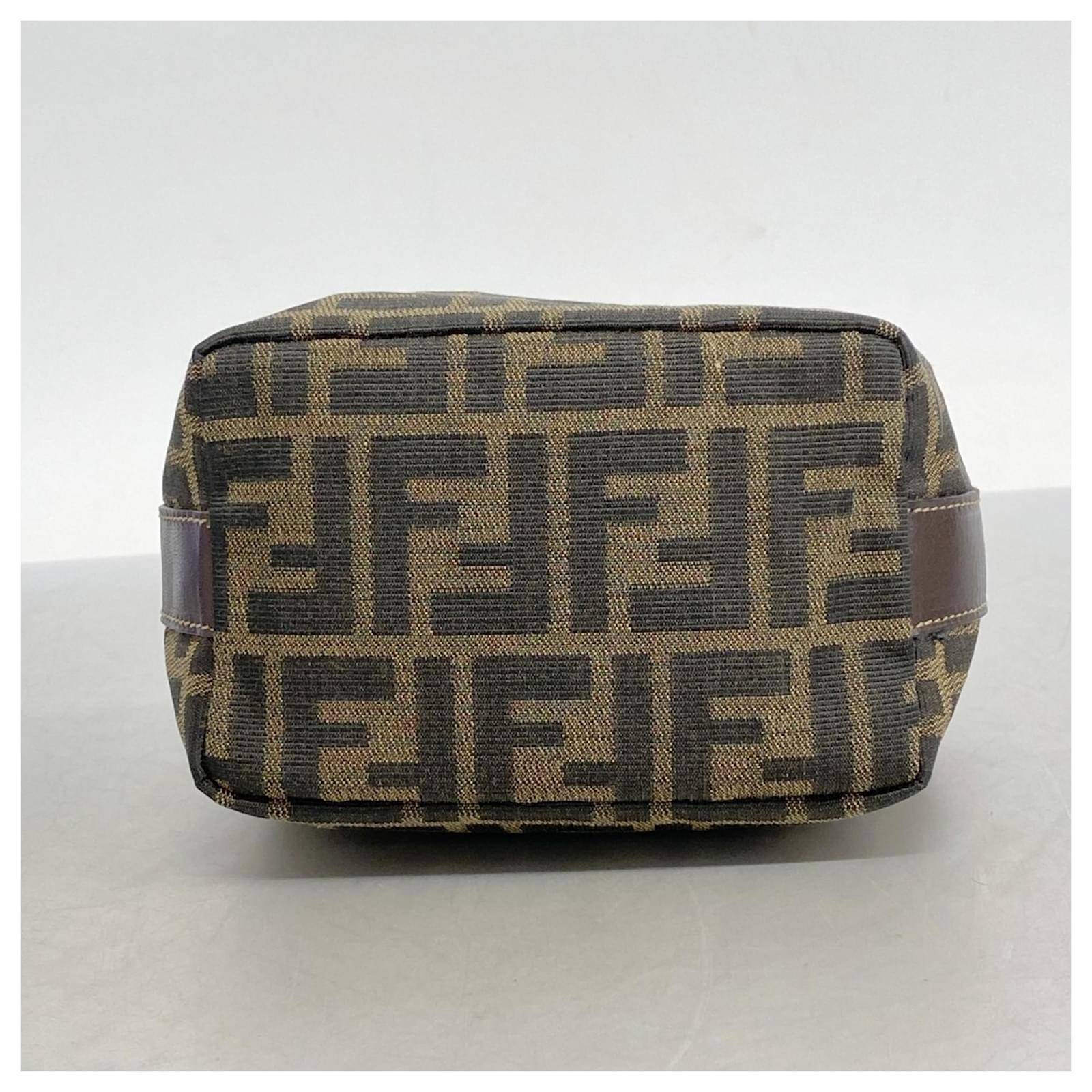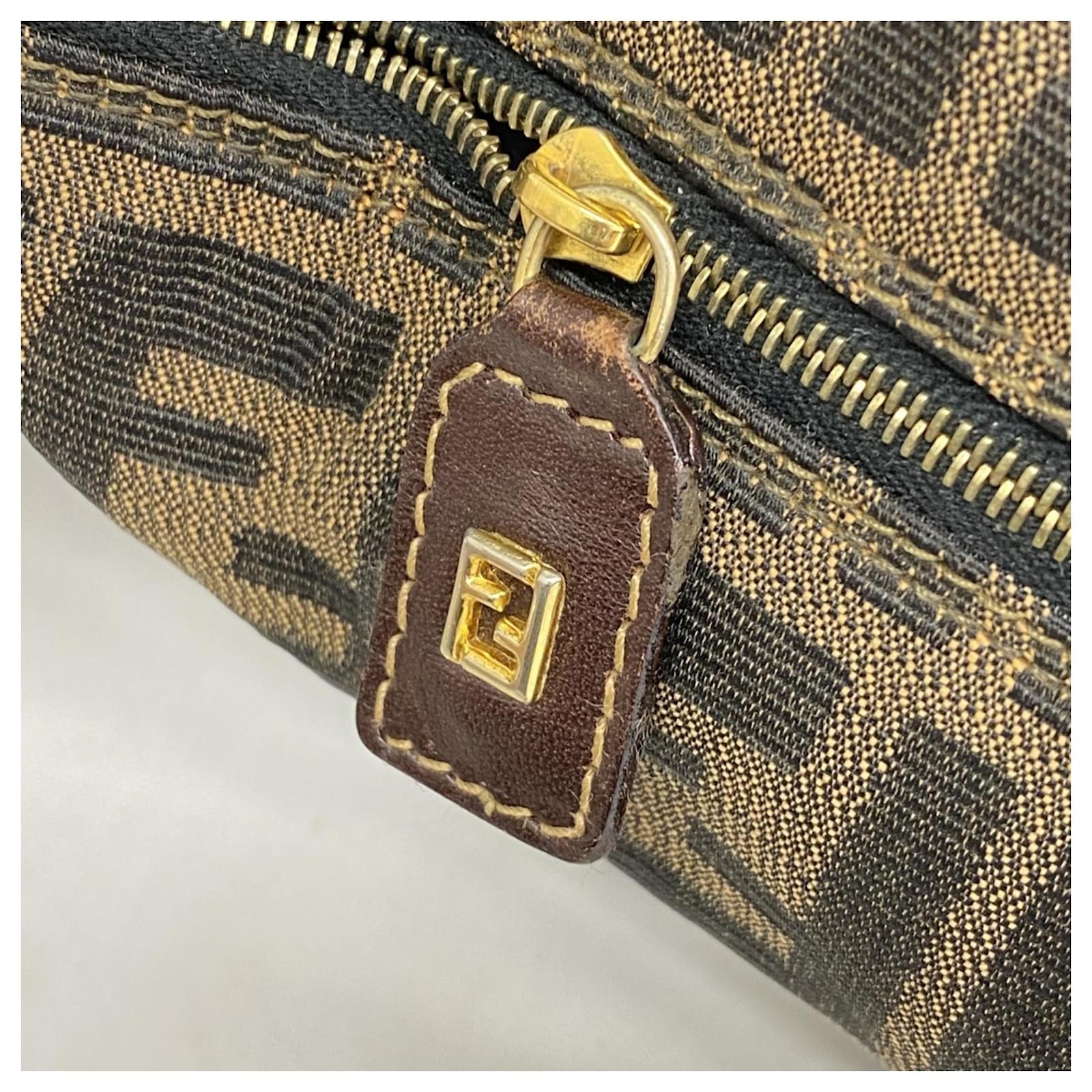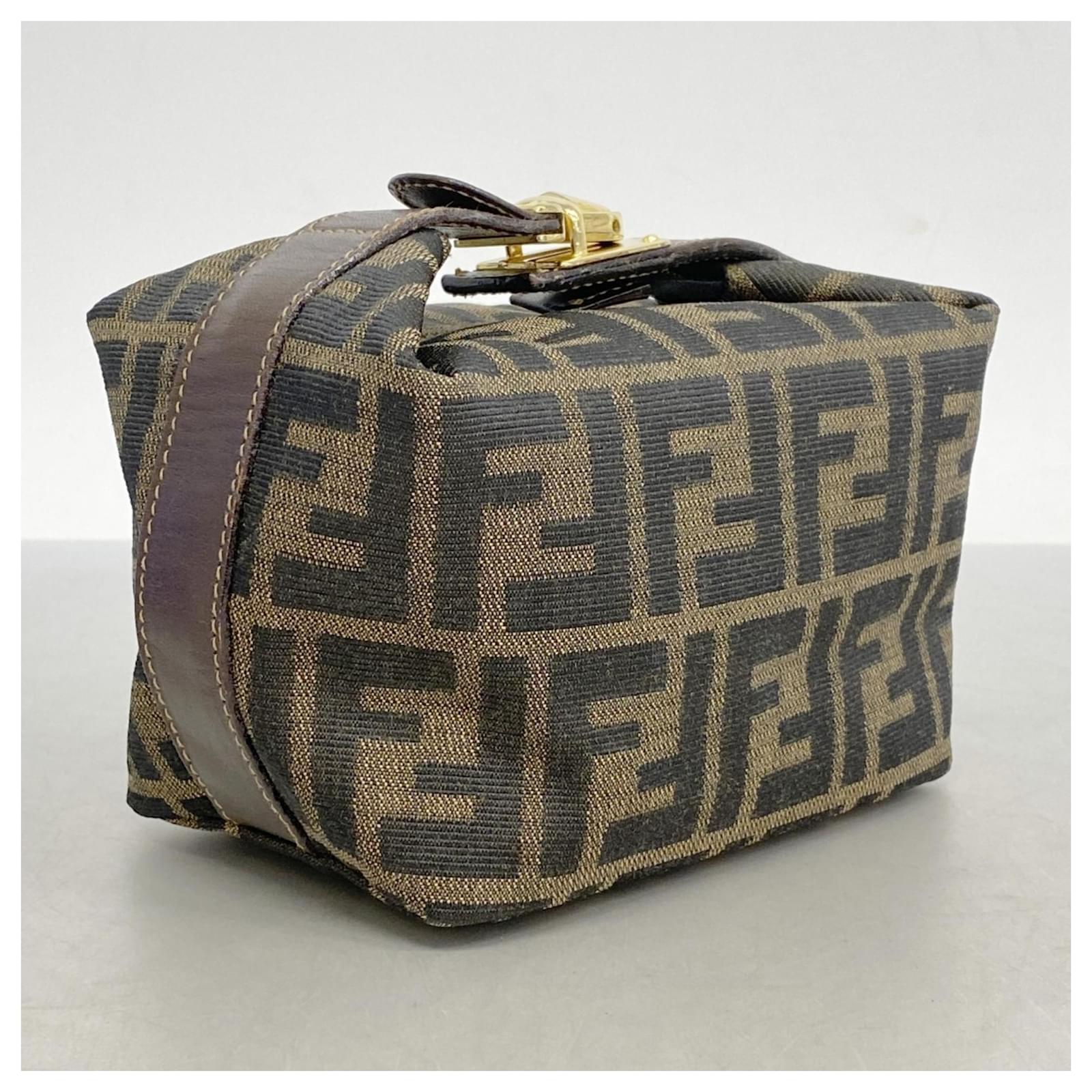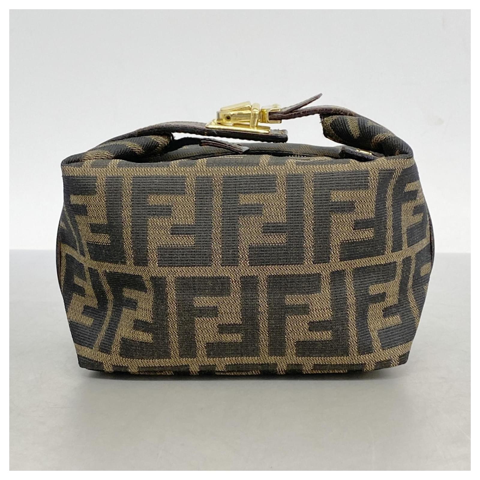 This Fendi pouch is crafted from brown nylon canvas and features gold hardware, making it a stylish accessory for everyday use. Measuring 10cm x 14.5cm x 10cm (approximately 3.93” x 5.7” x 3.93”), it is designed for practicality while maintaining a chic appearance. \n\nThe pouch is classified as used but remains in good condition, with slight traces of usage, scratches, and dirt. It is advisable to review the provided images for a clear understanding of its condition. Please note that no additional accessories are included with this item.