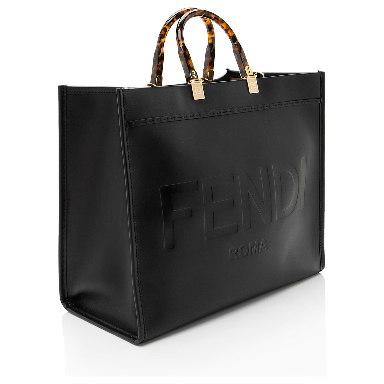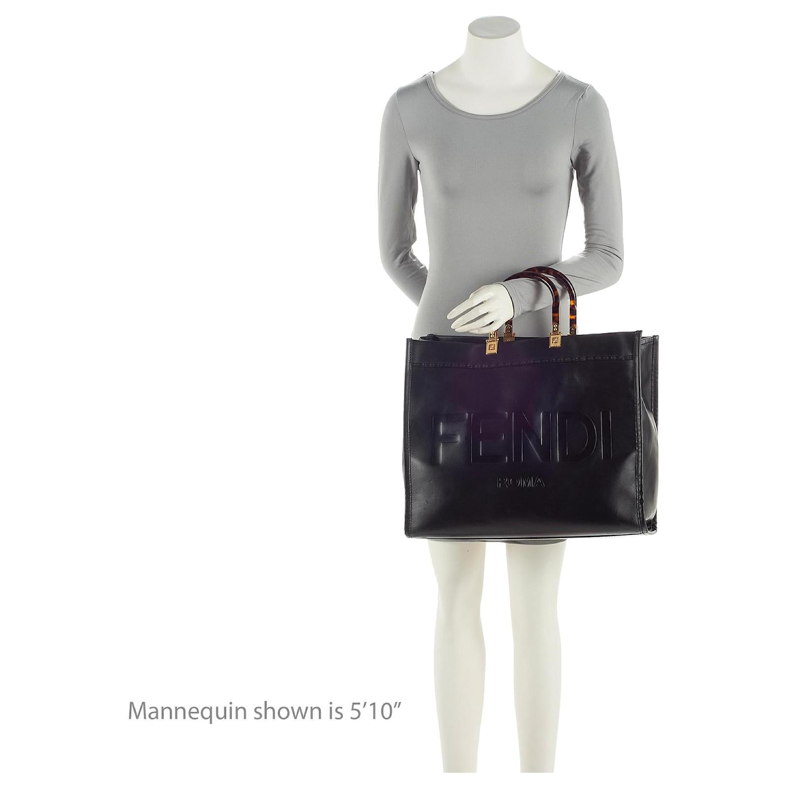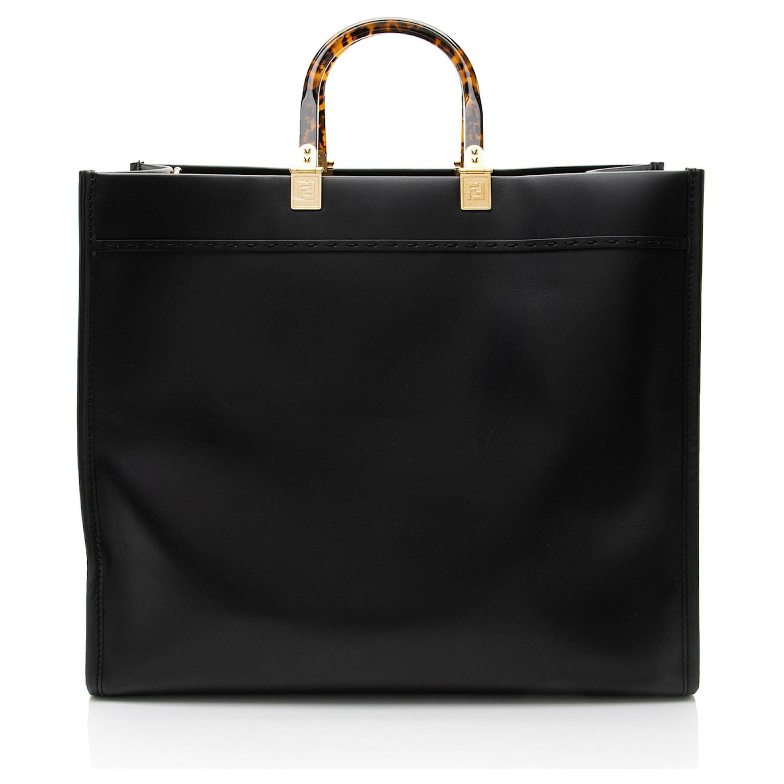 Founded in 1925, the high Italian fashion house of Fendi is renowned for their quality, glamour, and uniquely-creative designs. Fendi’s FF logo print is making a comeback by re-introducing the all-logo FF Capsule Collection, FF Reloaded, launched in Spring of 2018. From 1965 until his recent death in 2019, Karl Lagerfeld led Fendi for the longest collaboration in fashion, holding an innovative and cutting-edge legacy.\nCondition Notes: Light scuffs throughout exterior. Light scuffs to exterior corners. Light surface scratches to hardware. Minor marks throughout interior.\nWidth (at base): 16\”\nHeight: 14\”\nDepth: 8.25\”\nHandle Drop: 4.5\”\nType of Material: Leather, Plexiglass\nColor: Black\nLining: Beige Alcantara\nPockets: None\nHardware: Gold Tone\nClosure: Open\nOrigin: Italy\nMeasurements: width: 406 mm height: 355 mm handle drop: 114.3 mm\nProduct Id: 511149