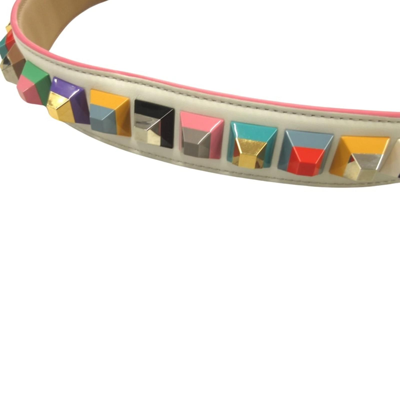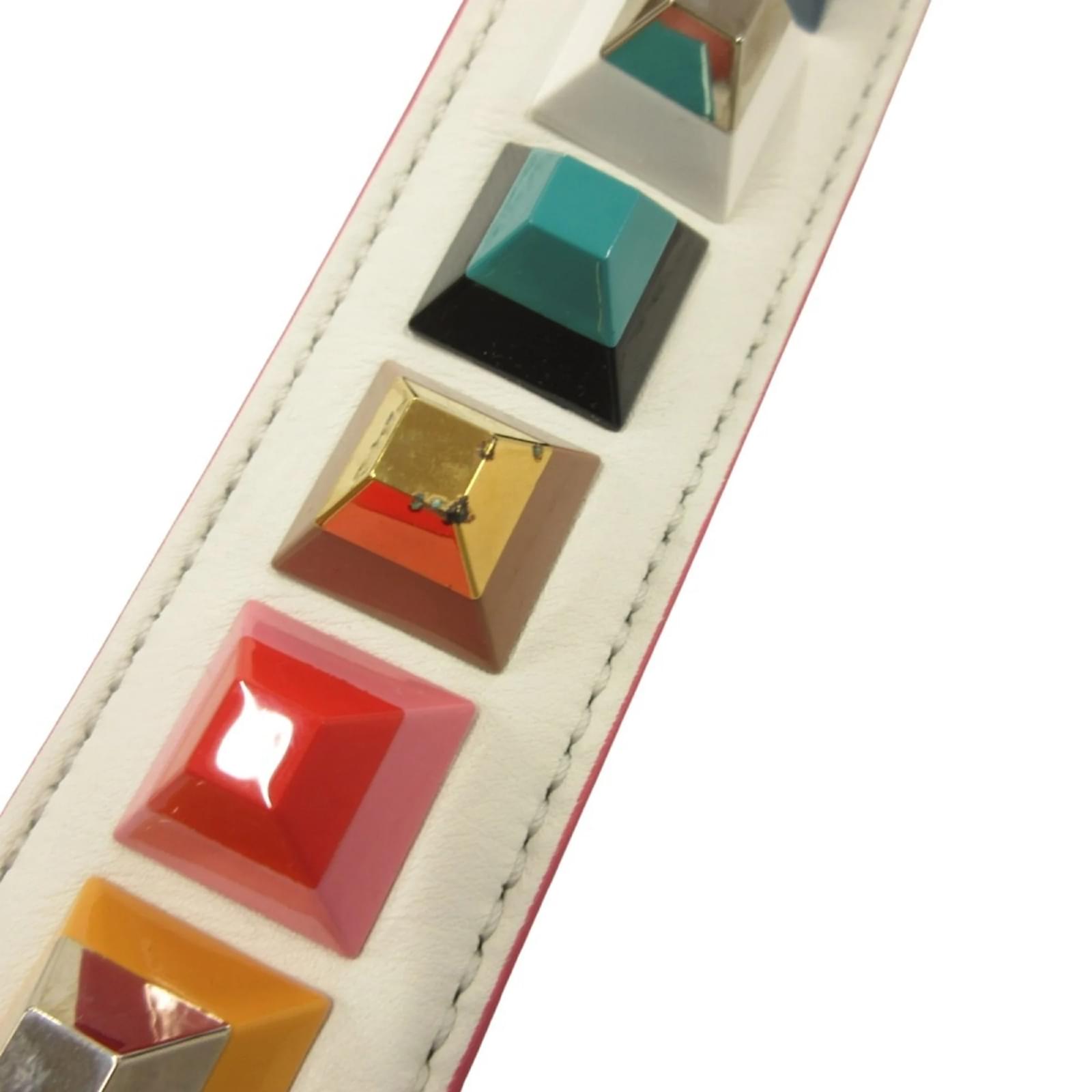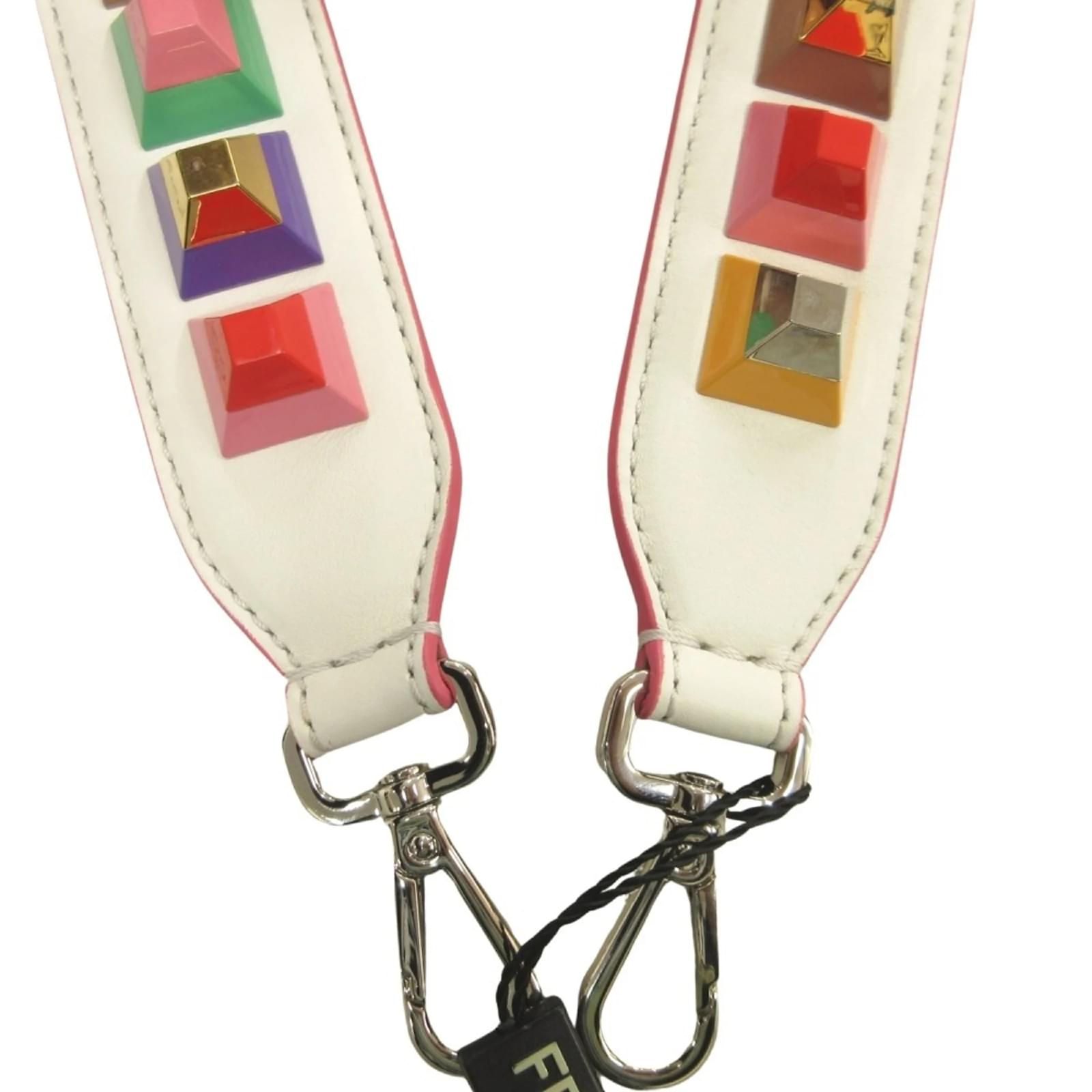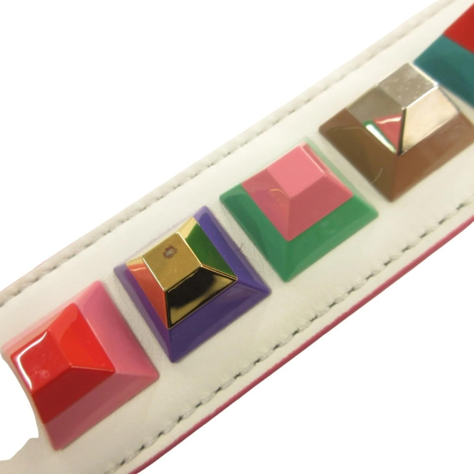 The Fendi Studded Strap You Webbing Shoulder Leather Bag Accessory features a multi-color design crafted from leather. This strap, suitable for both men and women, has a handle/strap length of 90cm (35.43 inches). The item is in opened condition but has never been used, classified as Rank S, indicating it is a display item. There is a note regarding potential metal corrosion, and interested buyers are encouraged to review the images for a clear understanding of the item’s condition and included accessories.