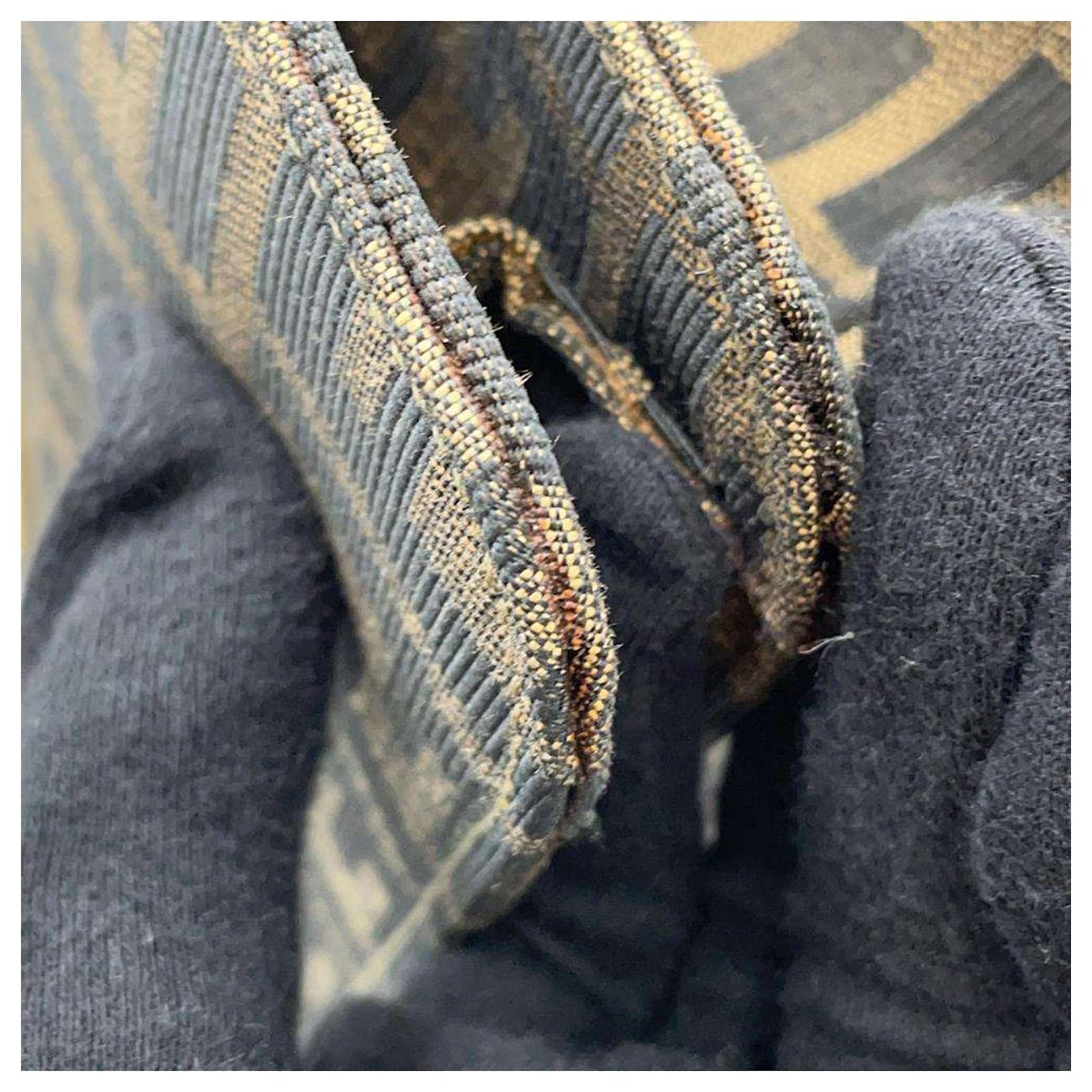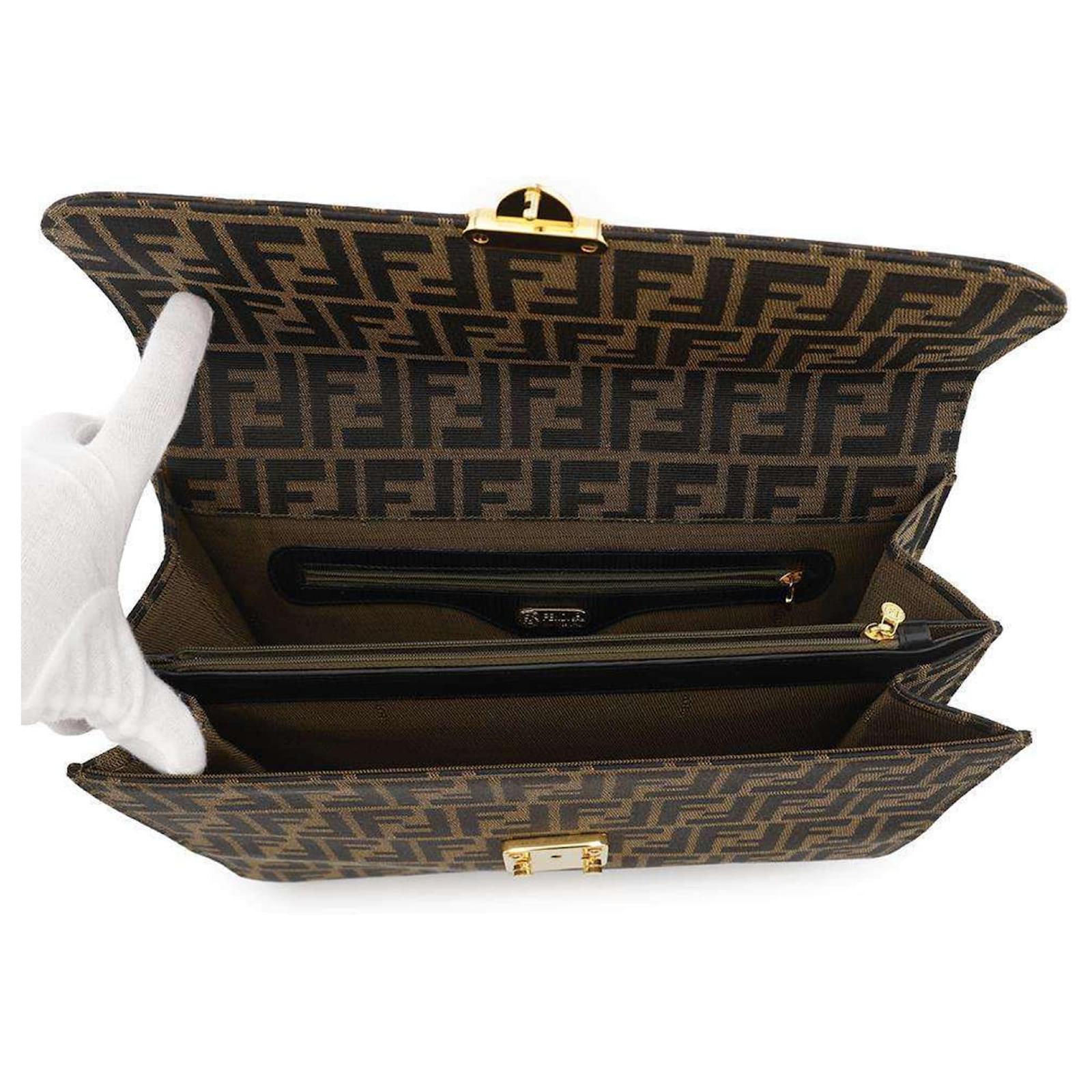 This Fendi handbag features a classic Zucca pattern, crafted from a combination of canvas and leather in a rich brown color with gold hardware accents. The dimensions of the bag are 24cm in height, 32.5cm in width, and 8cm in depth, with a strap length of 105.5cm. Weighing 1.1kg, it is designed for both style and practicality. \n\nThe bag is in very good used condition, classified as Rank A, with only minor traces of usage, including some insignificant scratches and dirt. There are a few lint balls on the exterior, and the hardware shows some peeling. It comes with a dust bag and a shoulder strap. Potential buyers are encouraged to review the images for a detailed view of the item’s condition and included accessories.