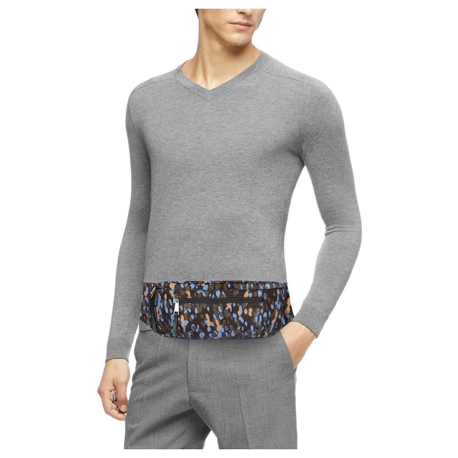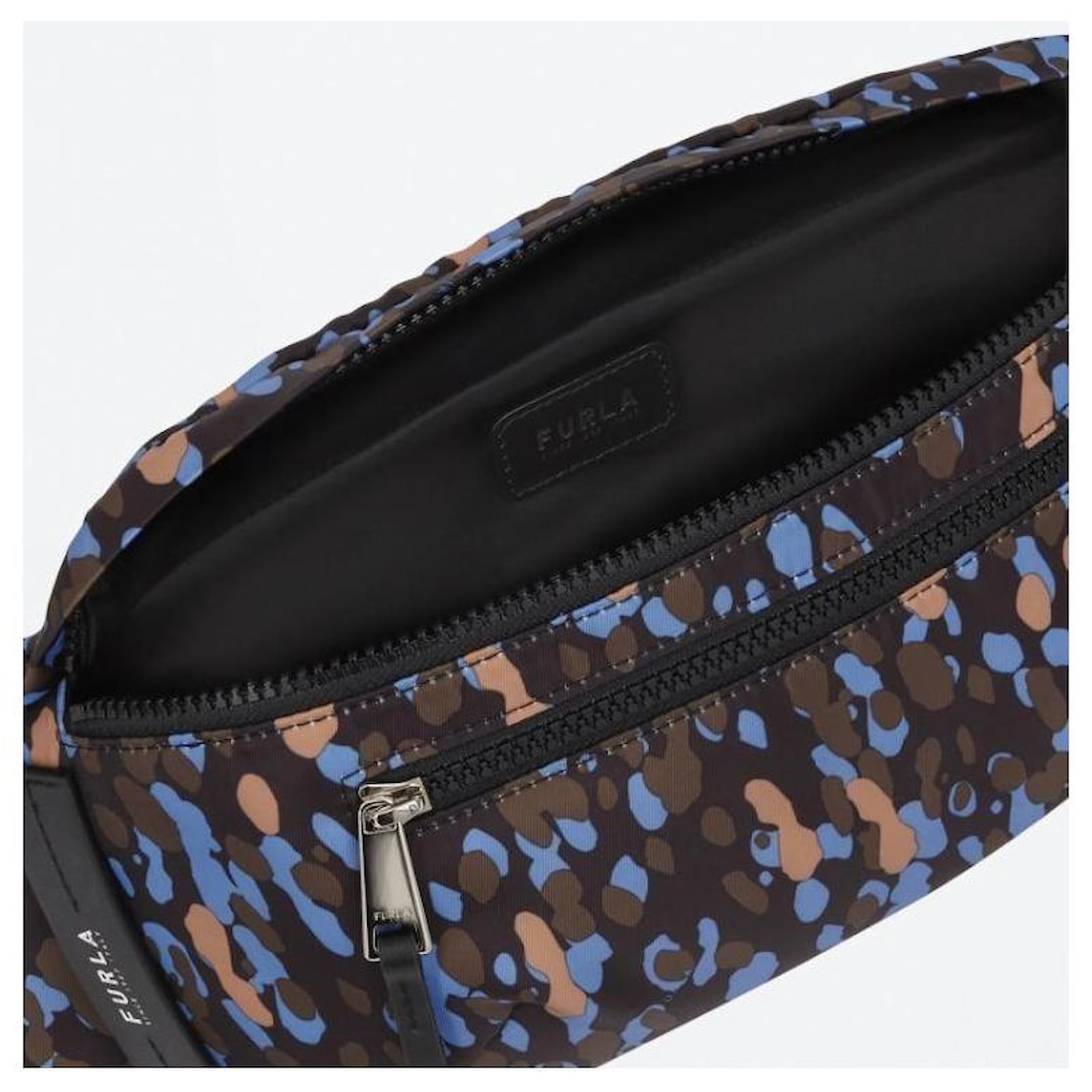 Furla nylon and leather pouch, multicolored blue, dimensions 22 x 13 x 5.5 cm, printed, front zipper pocket, zipper closure.