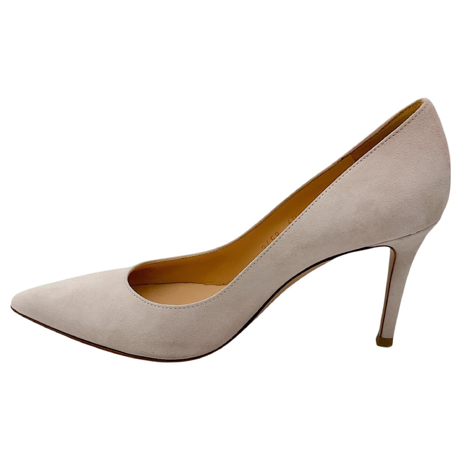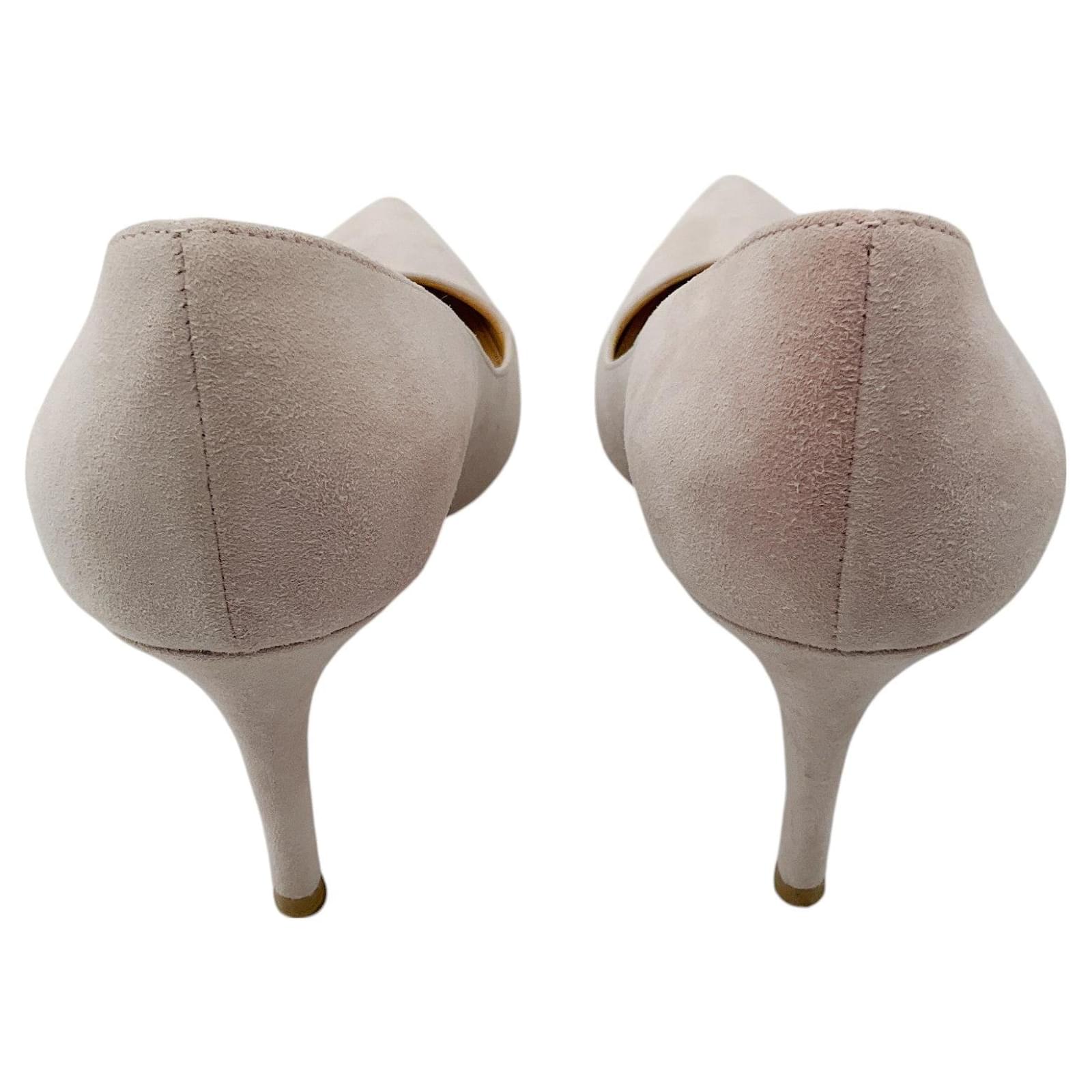 Gianvito Rossi Light Pink 85mm Suede Pumps\n2458 60320\nCondition: Good condition\n*In good condition. Minimal scuff marks visible on soles. Please refer to photos.\n*As with all suede items these are delicate and may have a slight discoloration (due to the nap in the fabric) and minor indentations (due to the soft supple material).\nMaterial: Suede\nIncludes: N/A\nCountry of origin: Italy\n*Please note as with most designer shoes they may run small.\nHeel Height: 3.5\”\nSole: Leather\nHardware: N/A\nColor: Pink\nSize: US 6.5 / IT 36.5\nCategory: Shoes\nSubcategory: Heels\nItem Number: 18612-3228 GS-625-DI\n** Photos are of the actual item **\n** Roundabout Couture Certified Authentic **