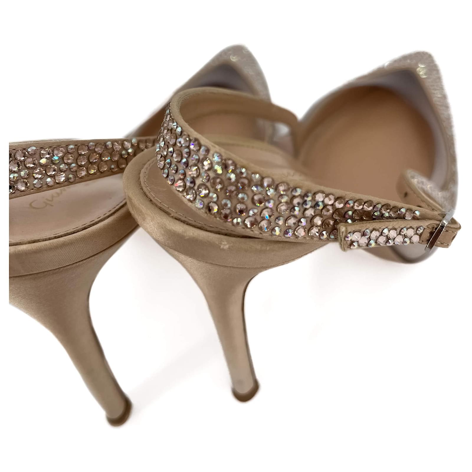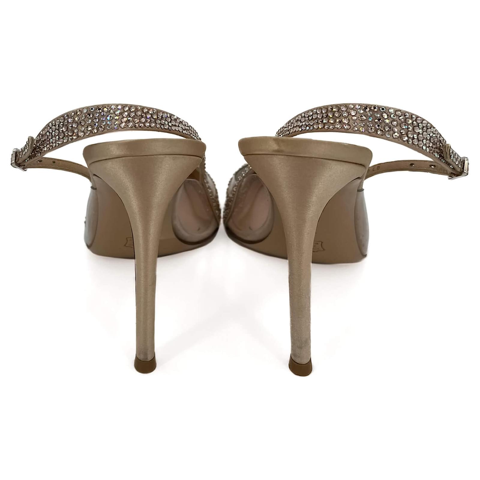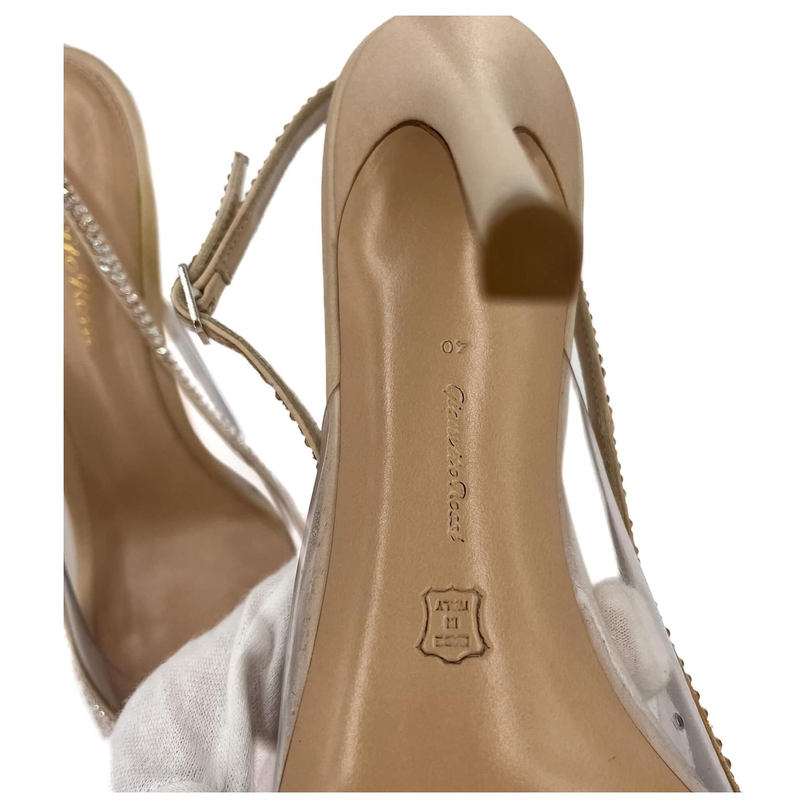 These Gianvito Rossi Slingback Crystal Pumps in pink combine elegance and glamour, perfect for making a statement. Embellished with sparkling crystals across the pointed toe and slingback strap, they bring a dazzling finish to any outfit. Crafted in leather and featuring a clear PVC insert, these pumps provide a modern, barely-there aesthetic while maintaining a sophisticated silhouette. With a 40mm heel height, they’re an ideal choice for both evening events and special occasions.\nAccessories : dust-bag\nHardware condition :minor signs.\nExterior condition :scratches – light , rubbing – light , wear – light , discoloration – light\nInterior condition :clean , odourless\nCollection :Slingback Strap\nSize : 40\n