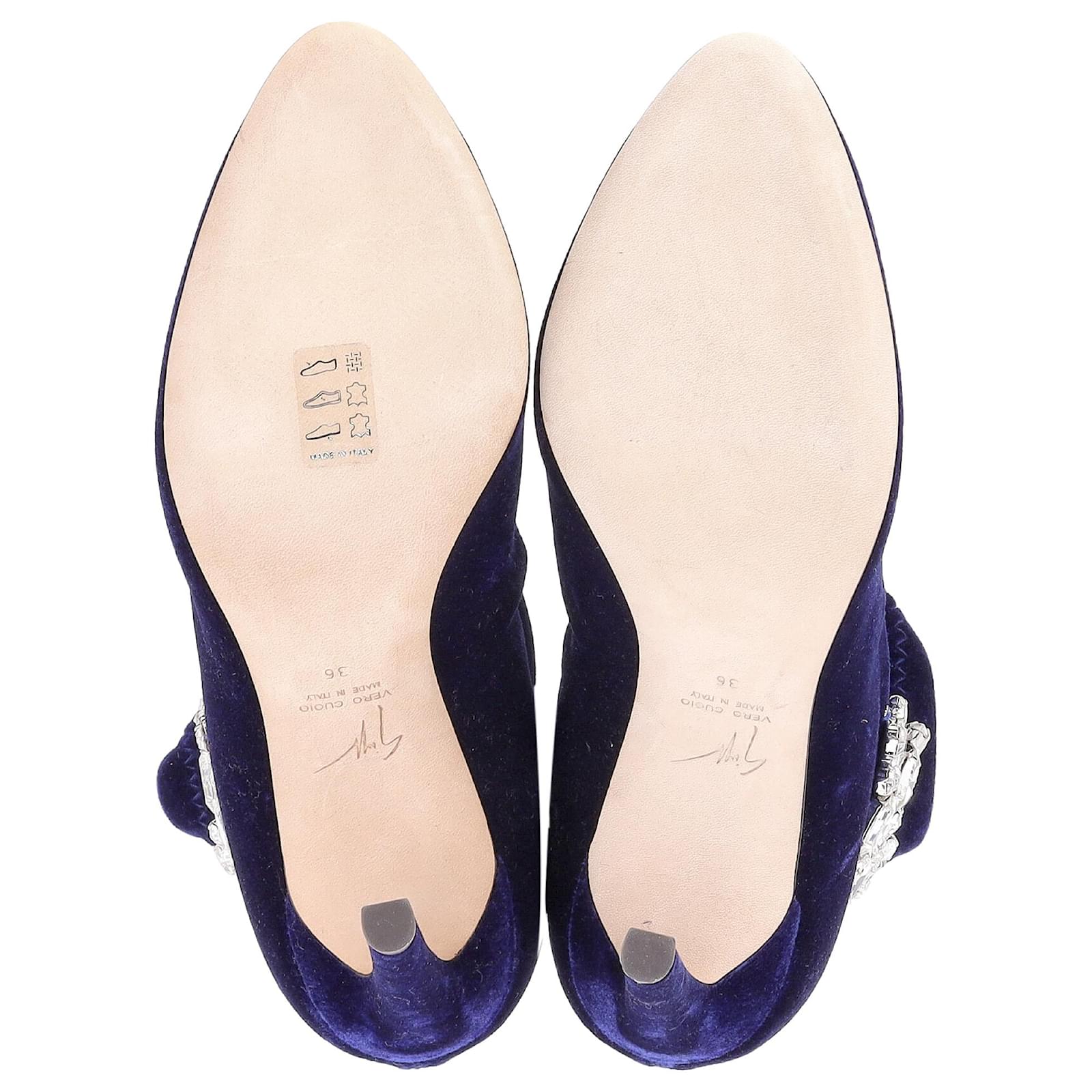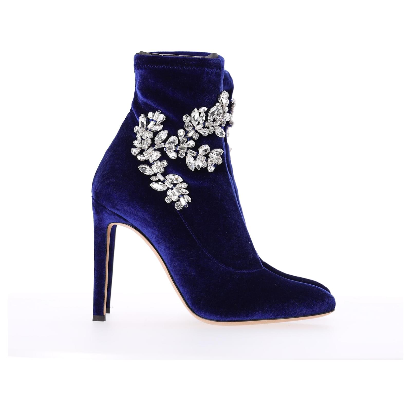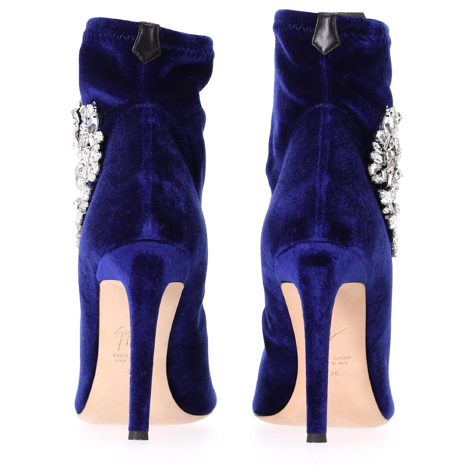 How can one not fall in love with these gorgeous boots from Giuseppe Zanotti! Crafted from velvet, these boots feature almond toes and gorgeous crystal embellishments. They are elevated on 12 cm heels and made comfortable with leather-lined insoles. Perfect conversation starters, we say!\n\n\nGiuseppe Zanotti Celesta Crystal Embellisehd Ankle Boots in Blue Velvet\nCondition: Very good\nSigns of wear: No visible sign of wear. No Mark at insole., Lightly used but very well maintained. Minor mark at soles & creasing, light scuffing at the soles and heels.\nPackaging: None\nColor: blue\nMaterial: \nSize: EU36\nMeasurements: Heel height: 105; Insole length: 230\nSKU: NAPPUFRSH424970W \n Product Id: 424970 \n