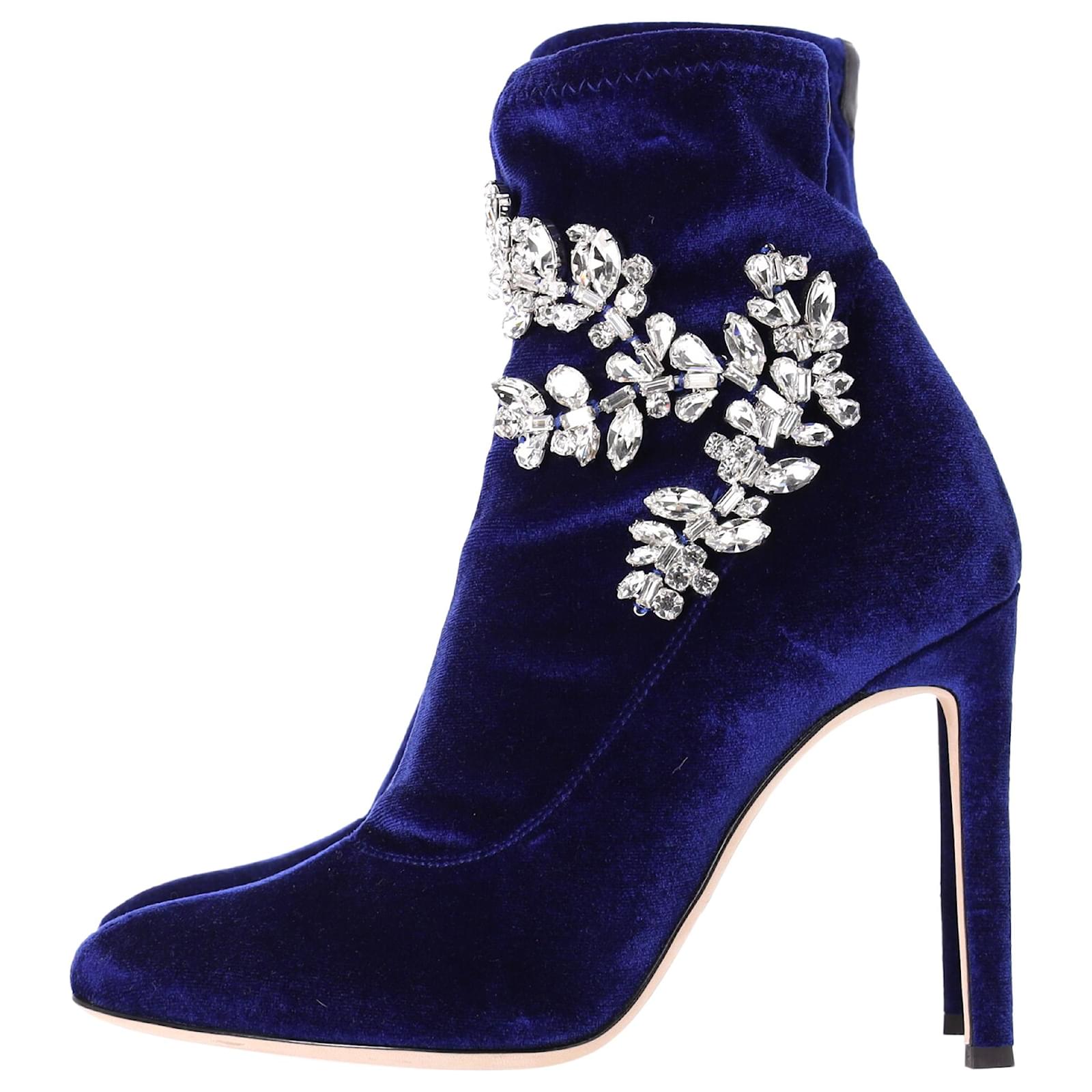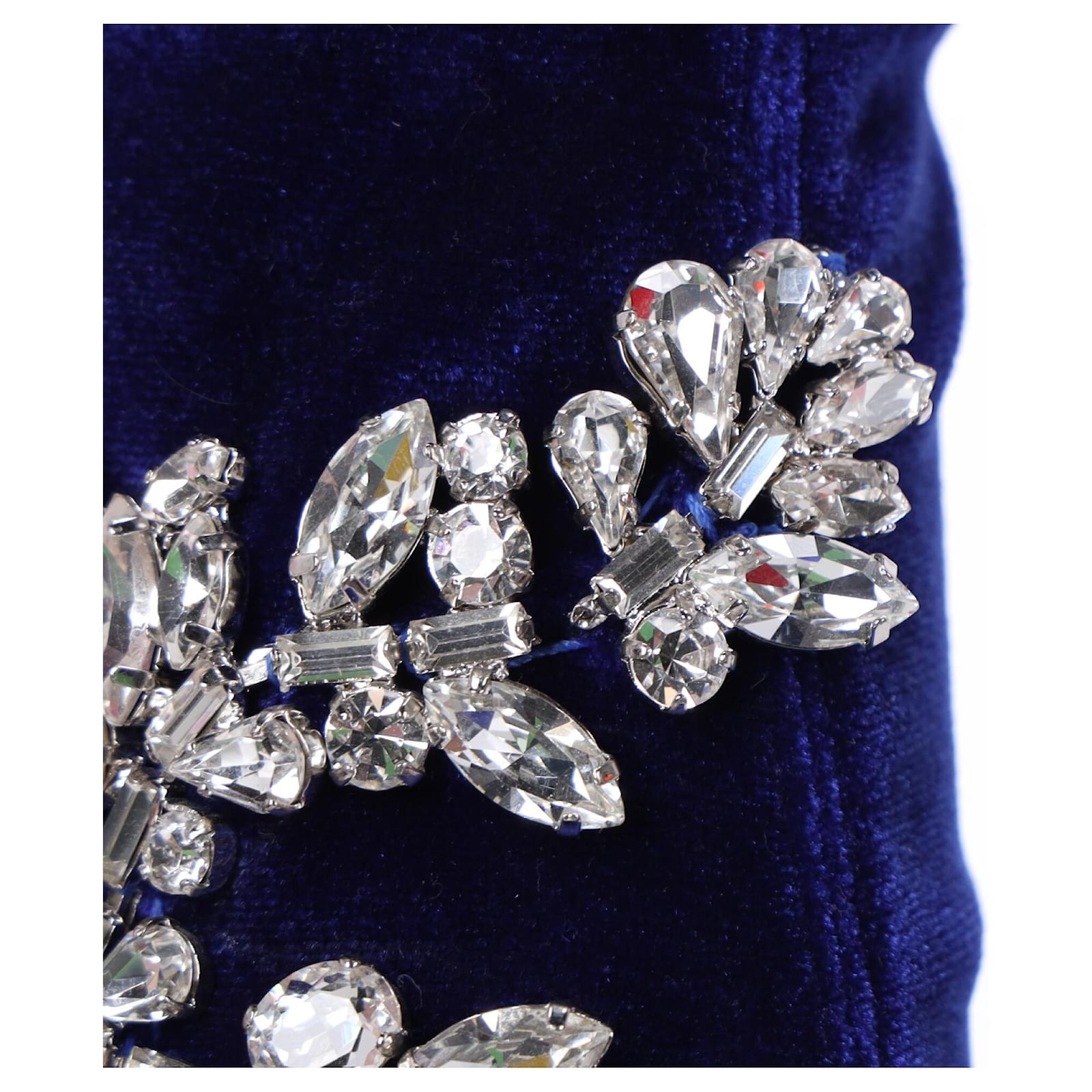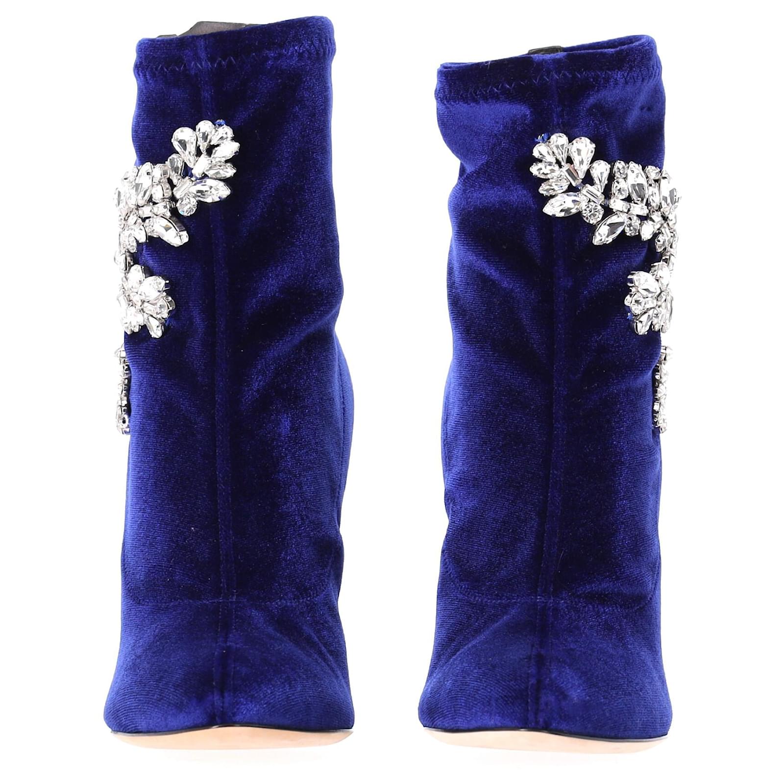 How can one not fall in love with these gorgeous boots from Giuseppe Zanotti! Crafted from velvet, these boots feature almond toes and gorgeous crystal embellishments. They are elevated on 12 cm heels and made comfortable with leather-lined insoles. Perfect conversation starters, we say!\n\n\nGiuseppe Zanotti Celesta Crystal Embellisehd Ankle Boots in Blue Velvet\nCondition: Very good\nSigns of wear: No visible sign of wear. No Mark at insole., Lightly used but very well maintained. Minor mark at soles & creasing, light scuffing at the soles and heels.\nPackaging: None\nColor: blue\nMaterial: \nSize: EU36\nMeasurements: Heel height: 105; Insole length: 230\nSKU: NAPPUFRSH424970W \n Product Id: 424970 \n