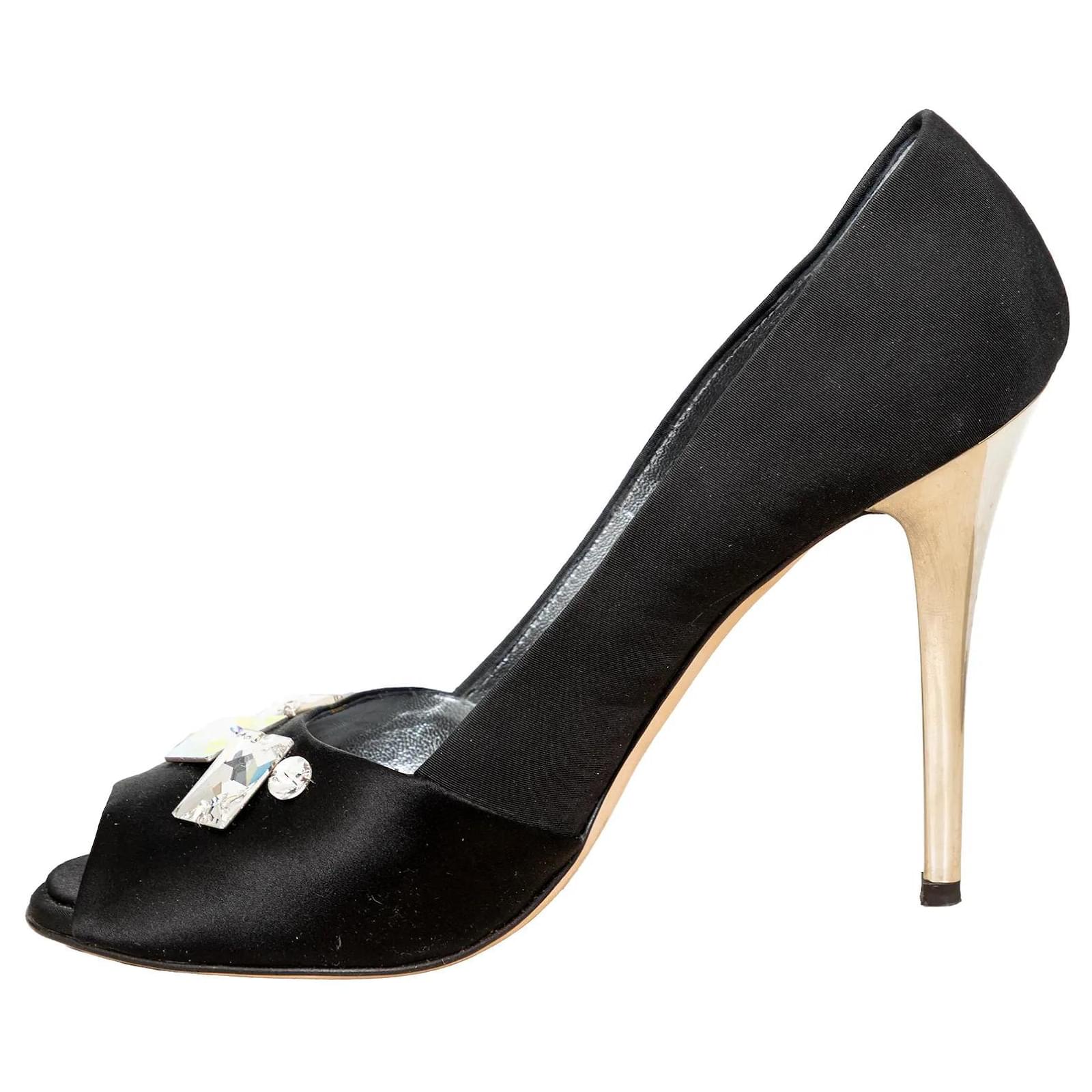 Giuseppe Zanotti peep toe pumps in black satin, featuring crystal embellishment on the upper and a striking golden heel.\n\nInclusion: box. \n\nRemarks: there are minimal signs of wear.\n\nInsole Length:25\nHeel:11.5\nFabric | Leather
