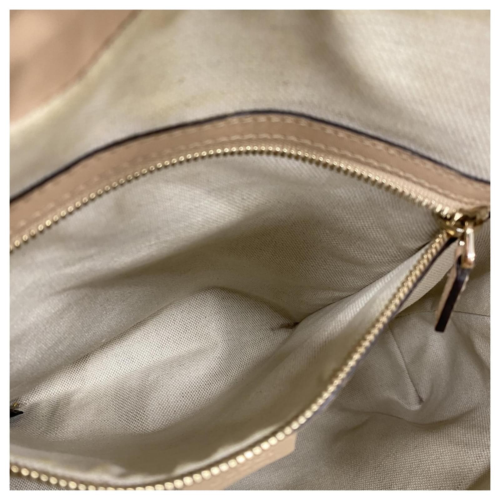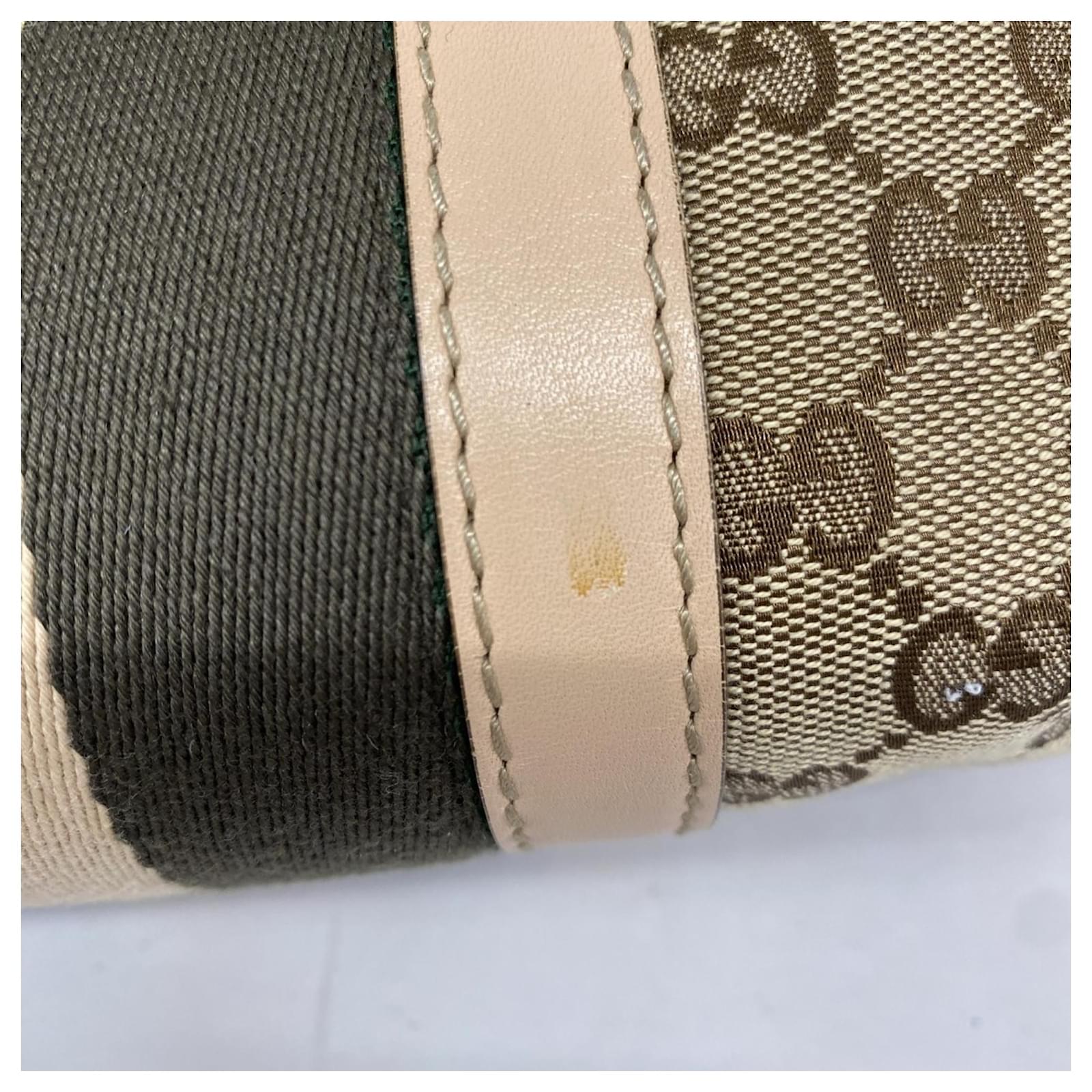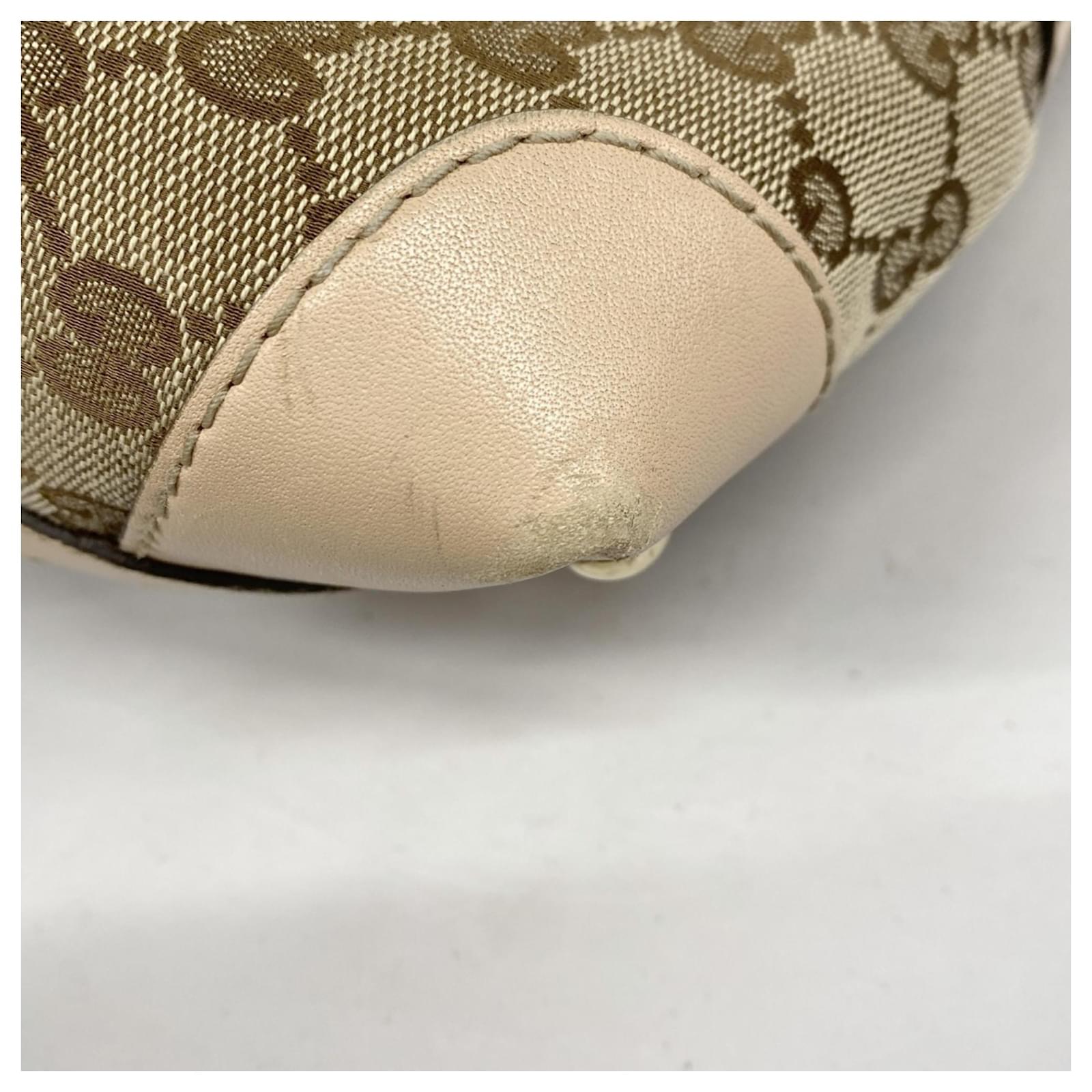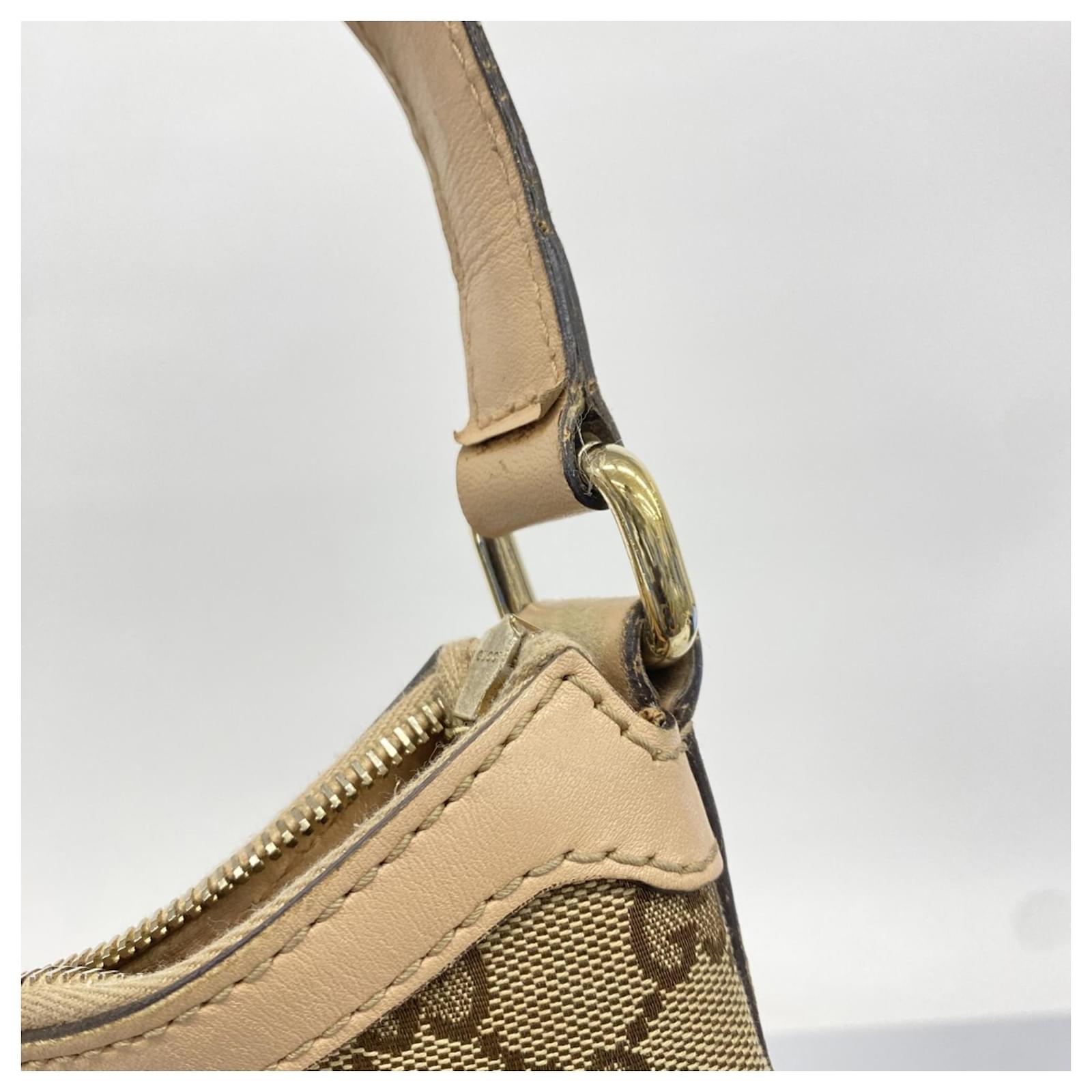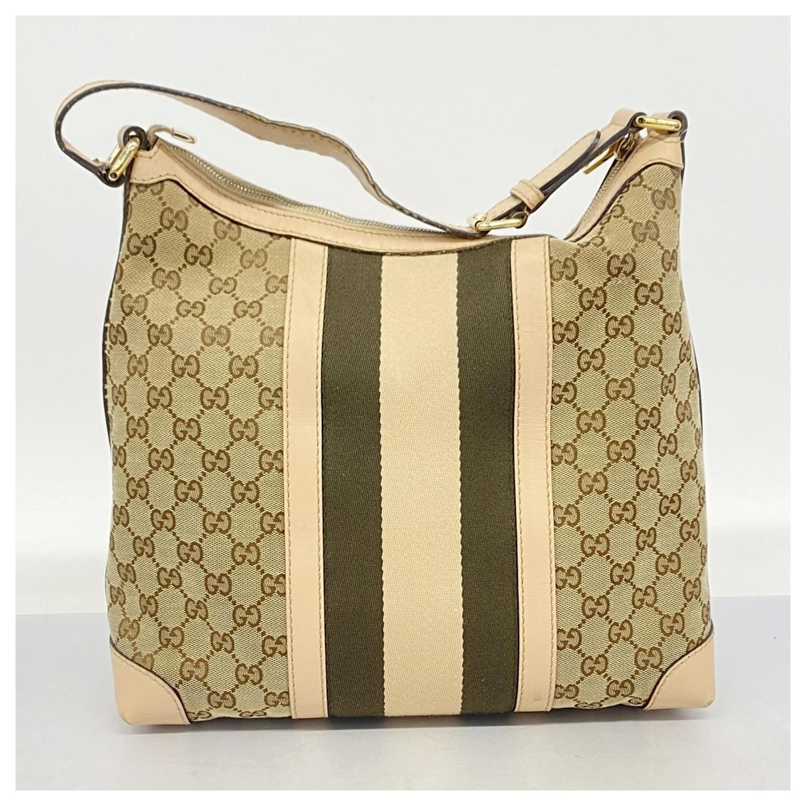 This Gucci shoulder bag is crafted from brown GG canvas and features champagne gold hardware. With dimensions of 27cm x 30.5cm x 13cm, it offers a practical size for daily use. The bag is classified as used but remains in good condition, showing slight traces of use, scratches, and dirt. It comes with a dust bag for storage. Potential buyers are encouraged to review the images for a detailed view of the item’s condition and included accessories.