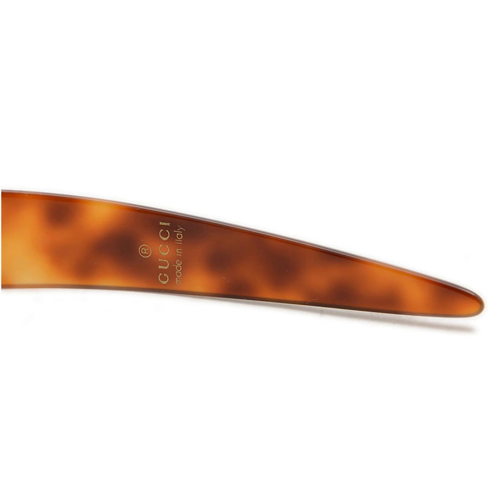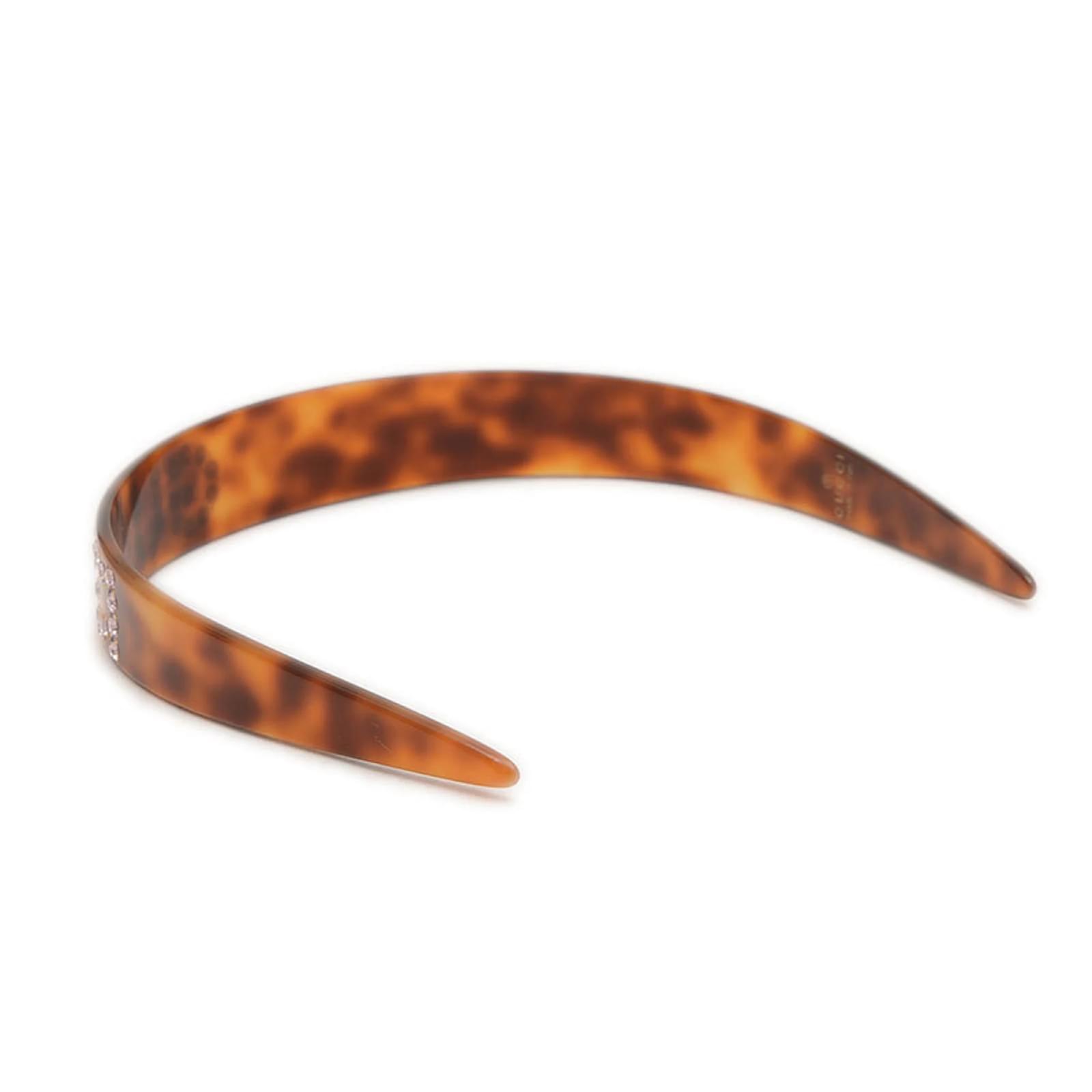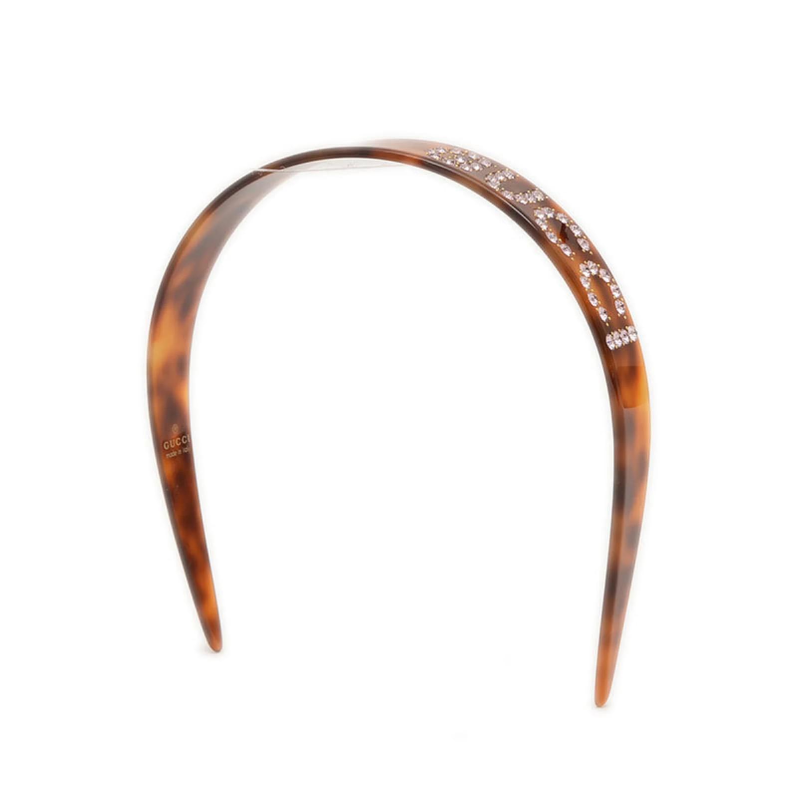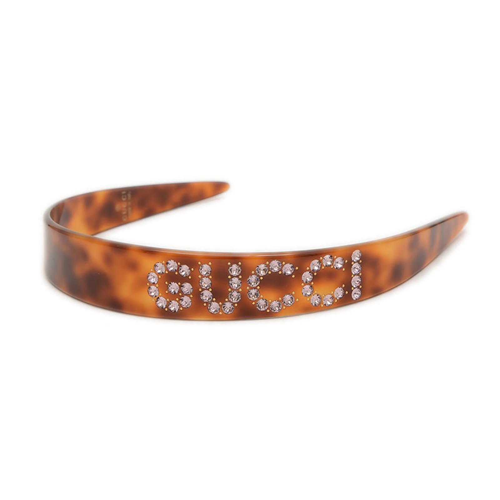 This Gucci headband features a classic Alice band design in a rich brown color, crafted from durable resin. Measuring 15.5cm by 14cm (6.1” x 5.51”), it is a stylish hair accessory adorned with a logo and rhinestones. The item is pre-owned and classified as being in very good condition, with only slight traces of use, including minor scratches and dirt. It is important to review the provided images for a clear understanding of its condition. No additional accessories are included with this item.